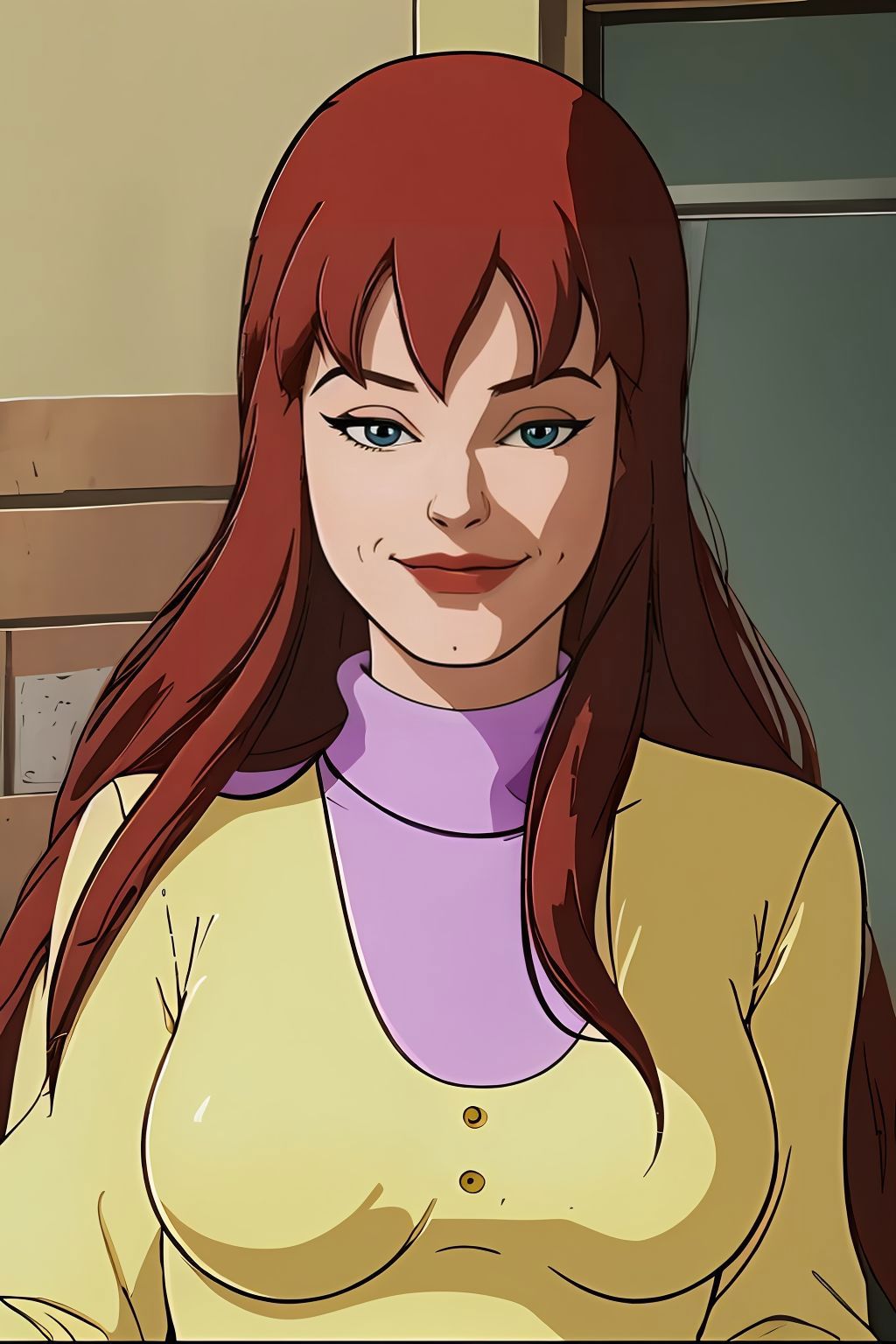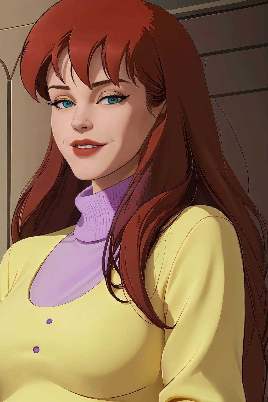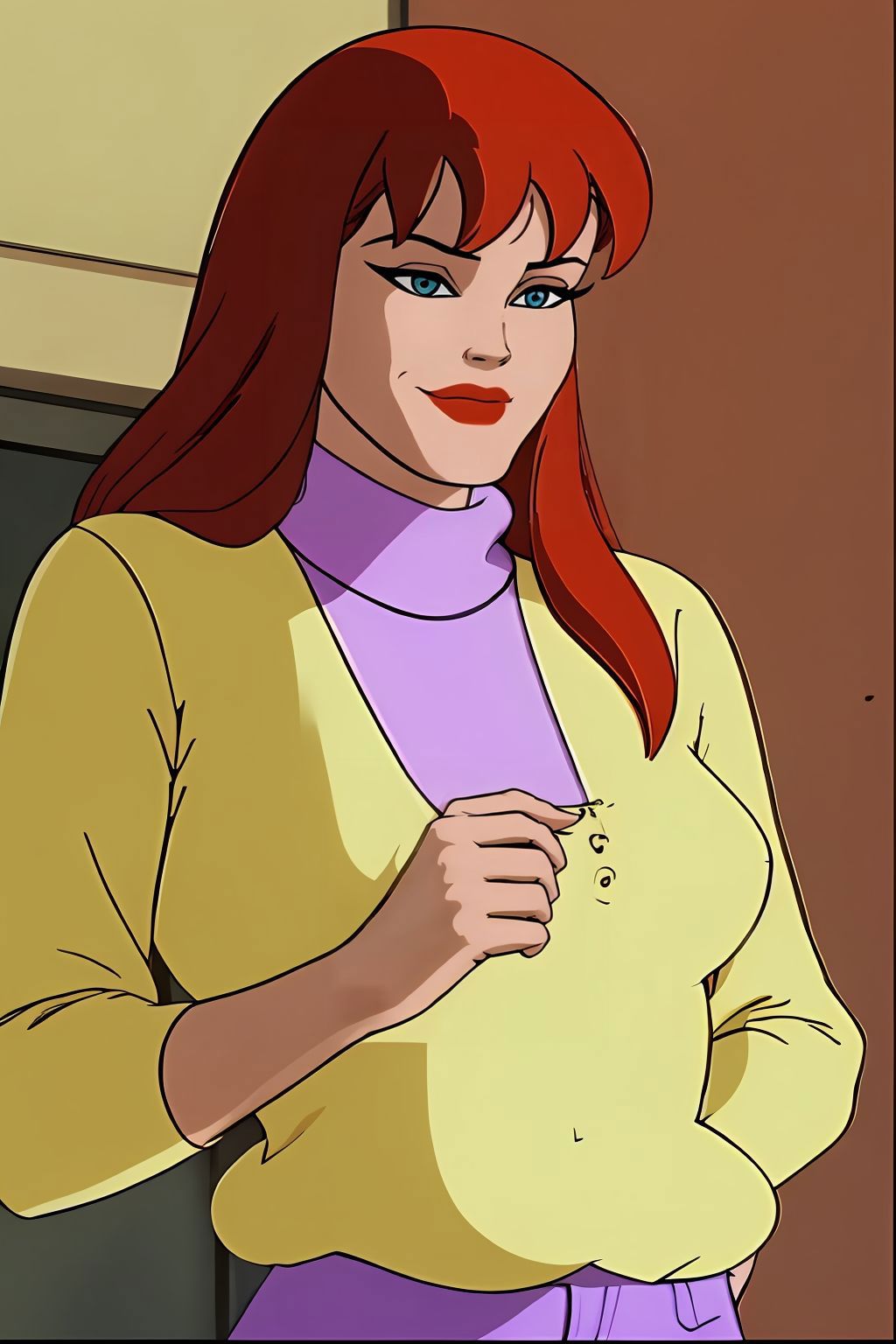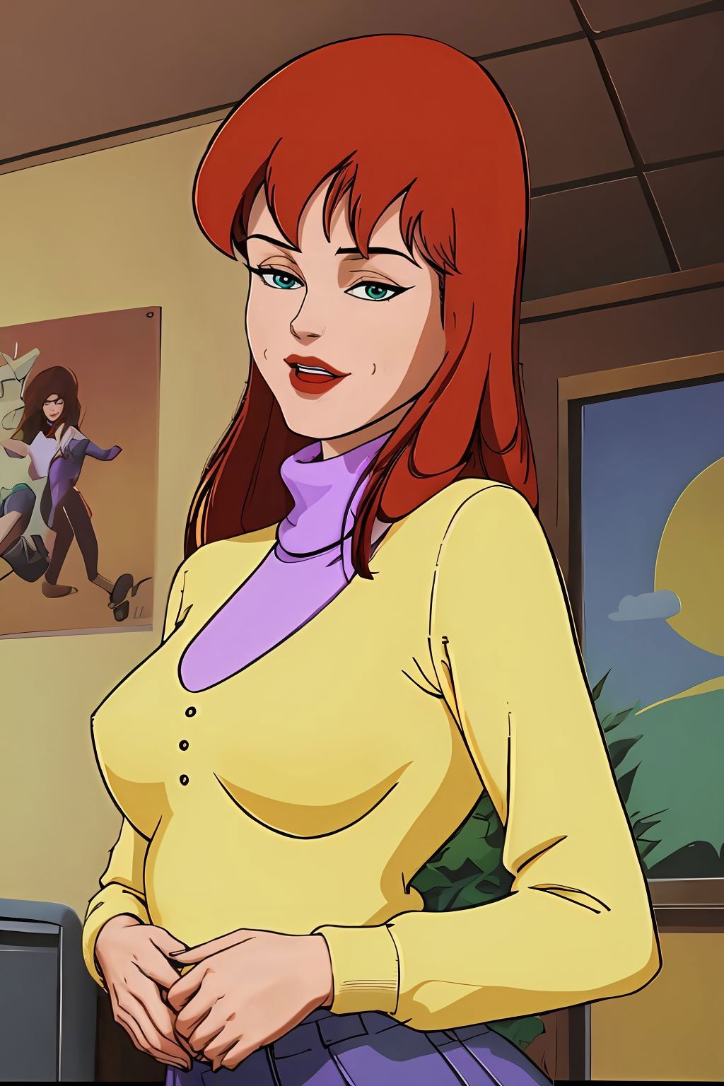 yellow sweater with purple turtleneck