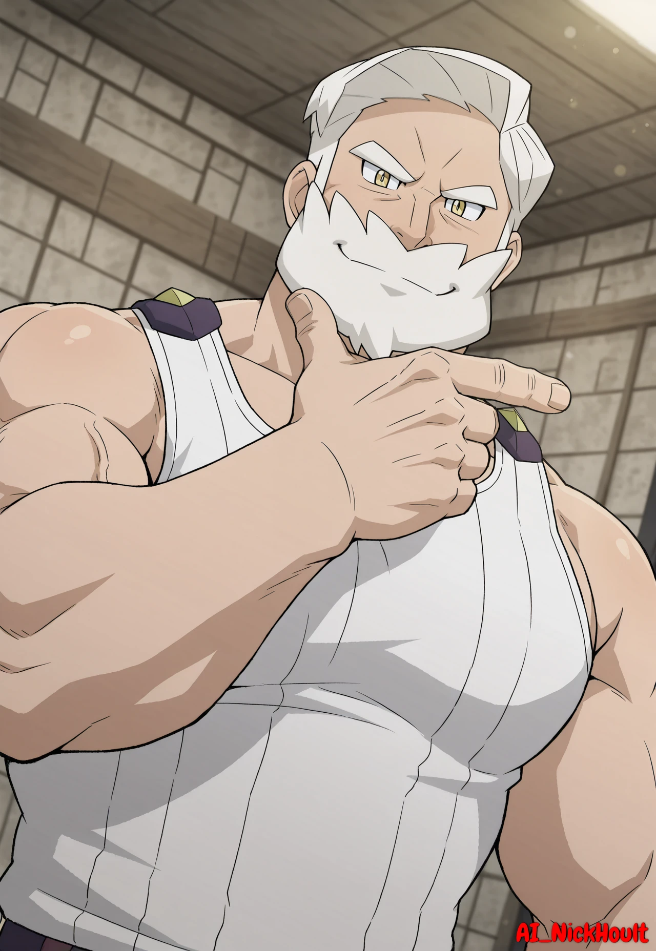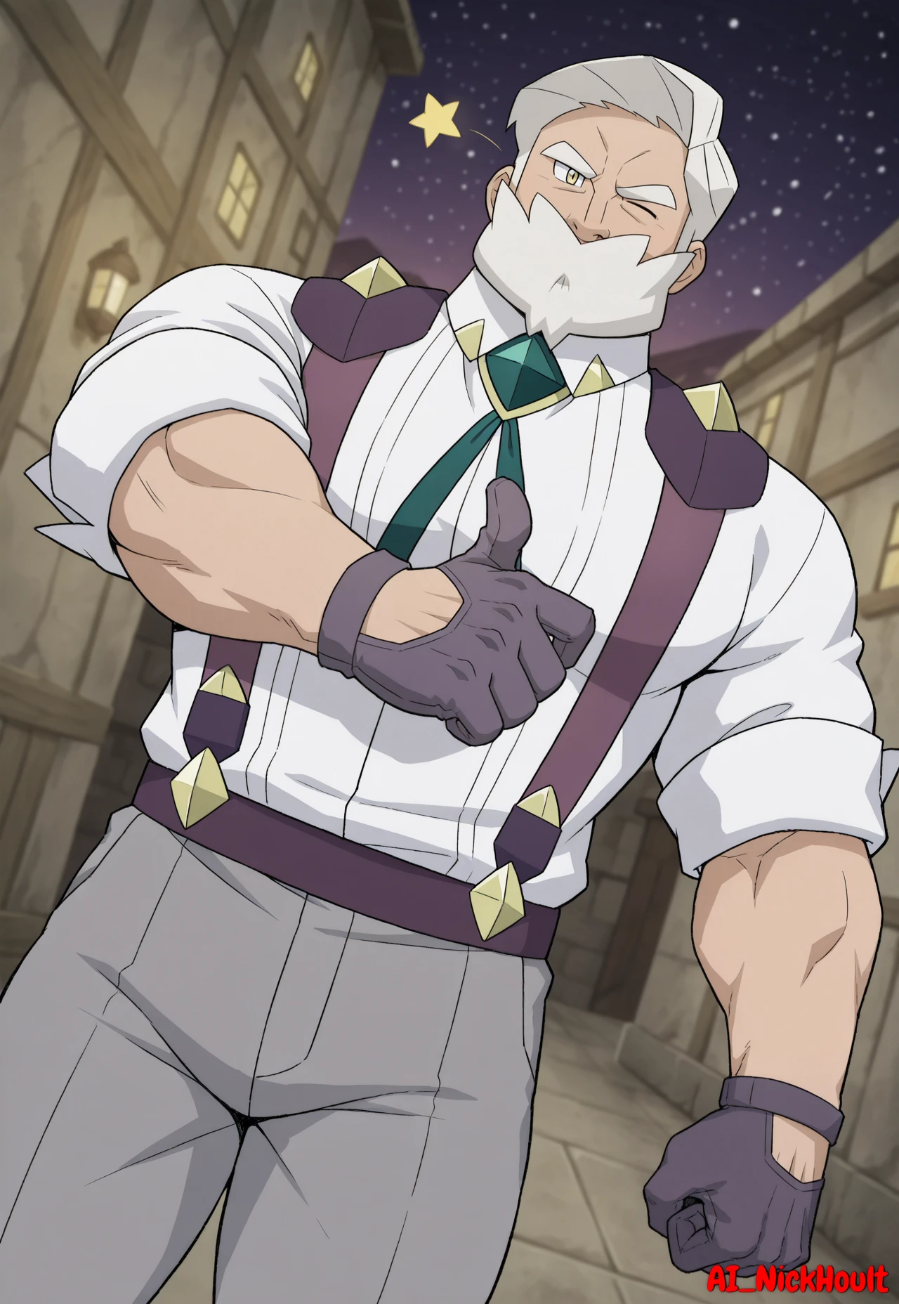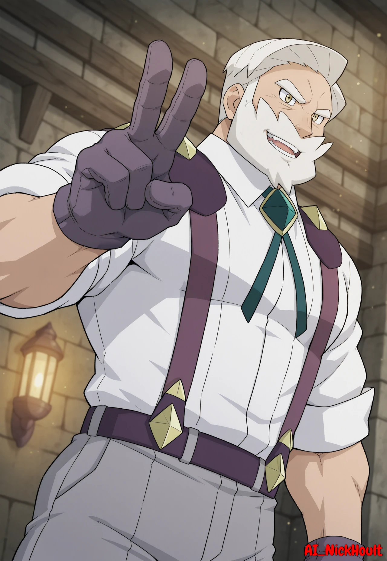 Drayden, old man, short white hair, facial hair, pale skin, wrinkles, yellow eyes,