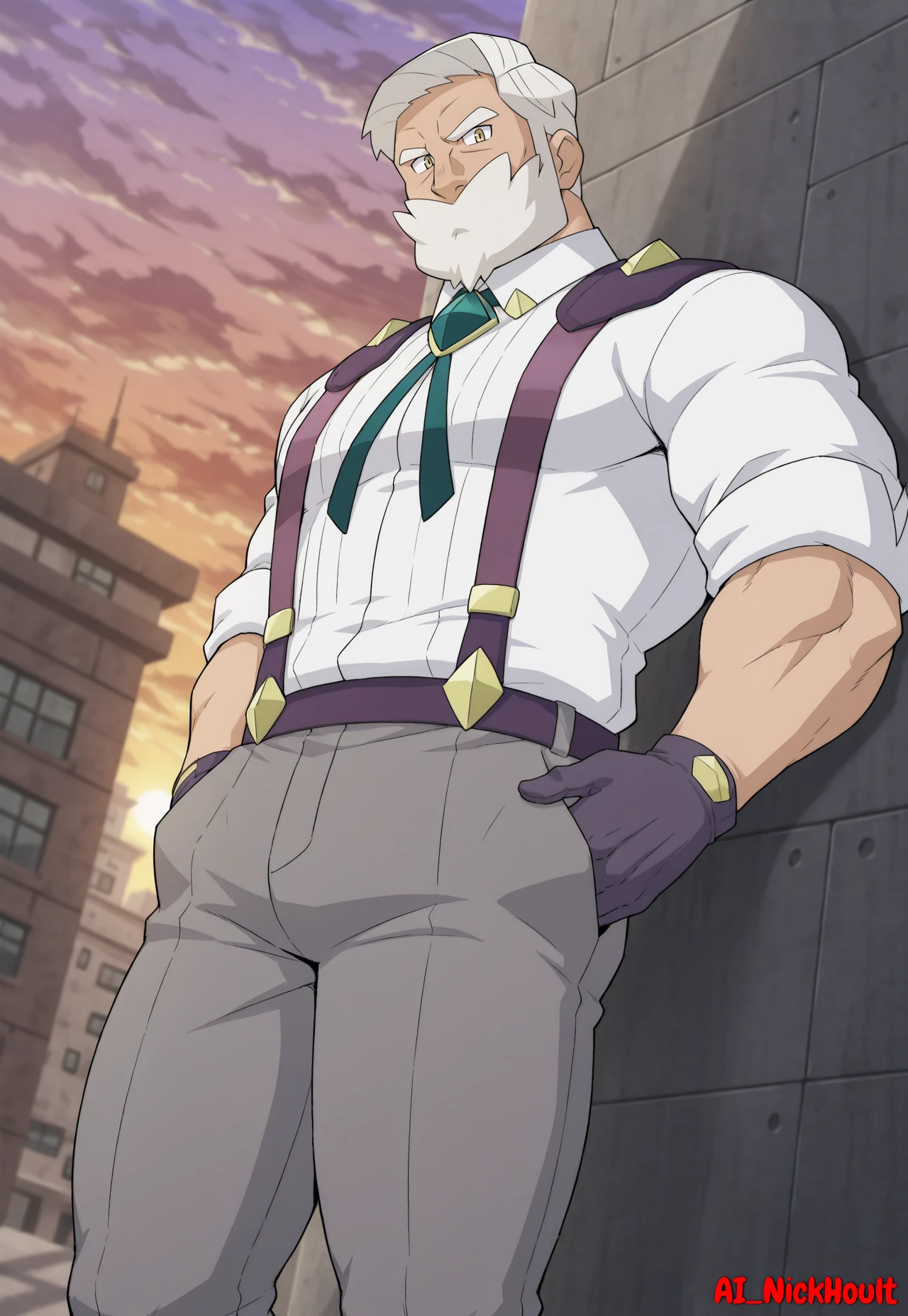white shirt, rolled up sleeves, purple suspenders, yellow spikes, gray pants, dark purple gloves, green necktie, dark purple shoes,