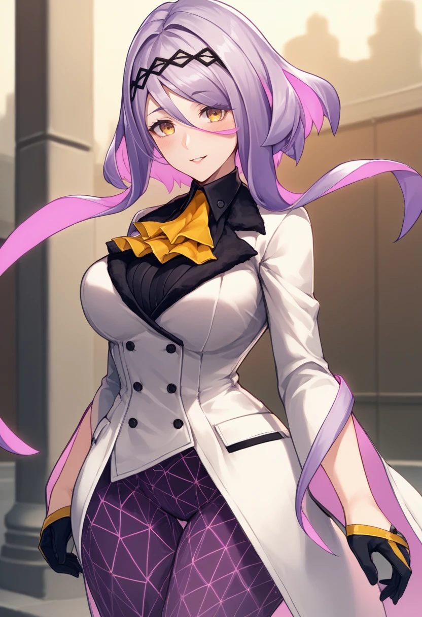 figue, yellow eyes, purple hair, multicolored hair, hairband, hair between eyes, sidelocks, yellow ascot, white coat, long sleeves, black shirt, half gloves, black gloves, white shorts, purple leggings, large breasts