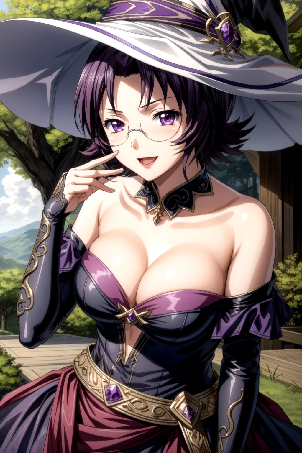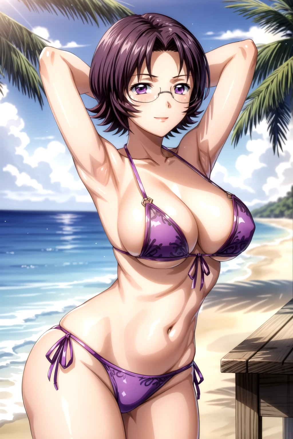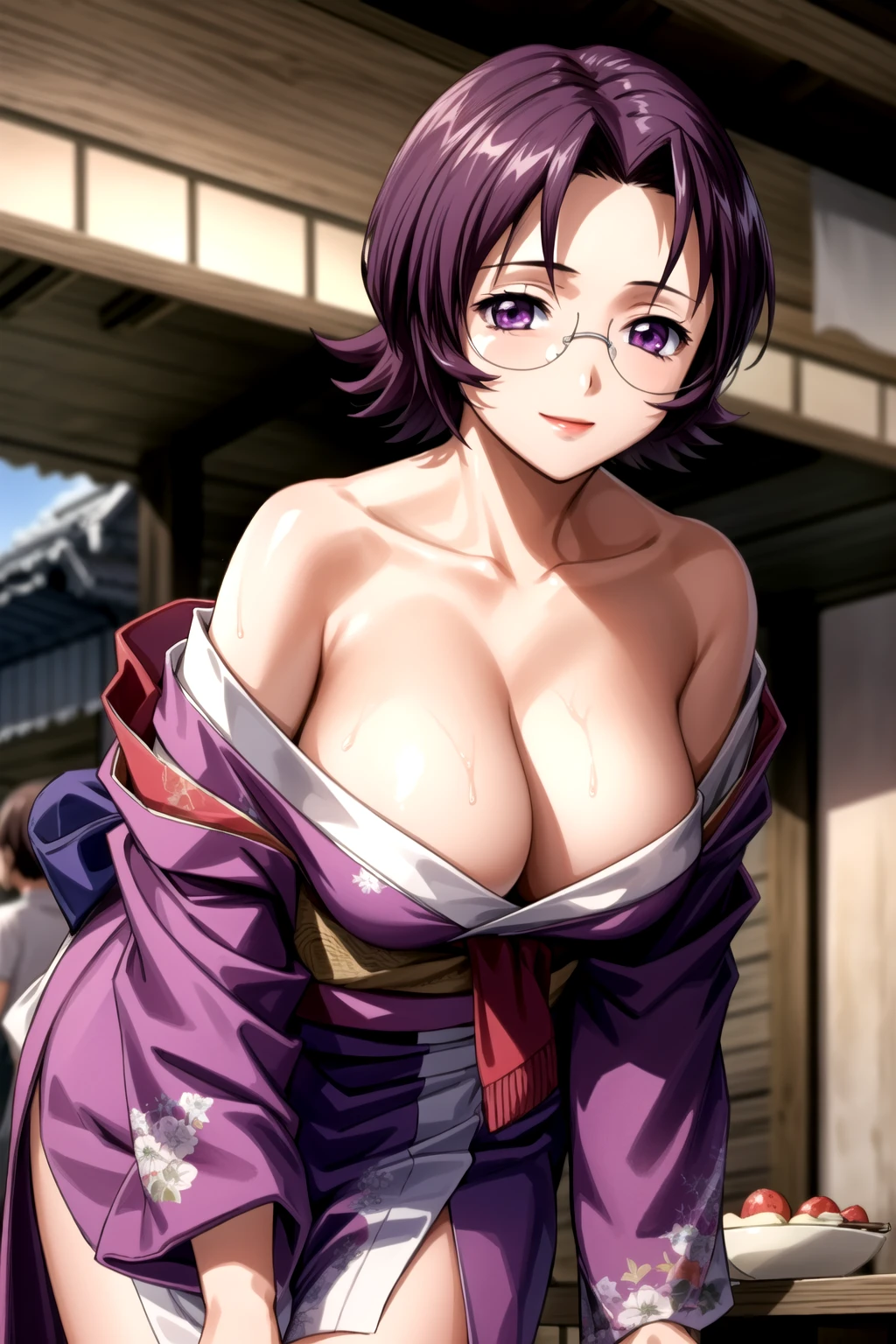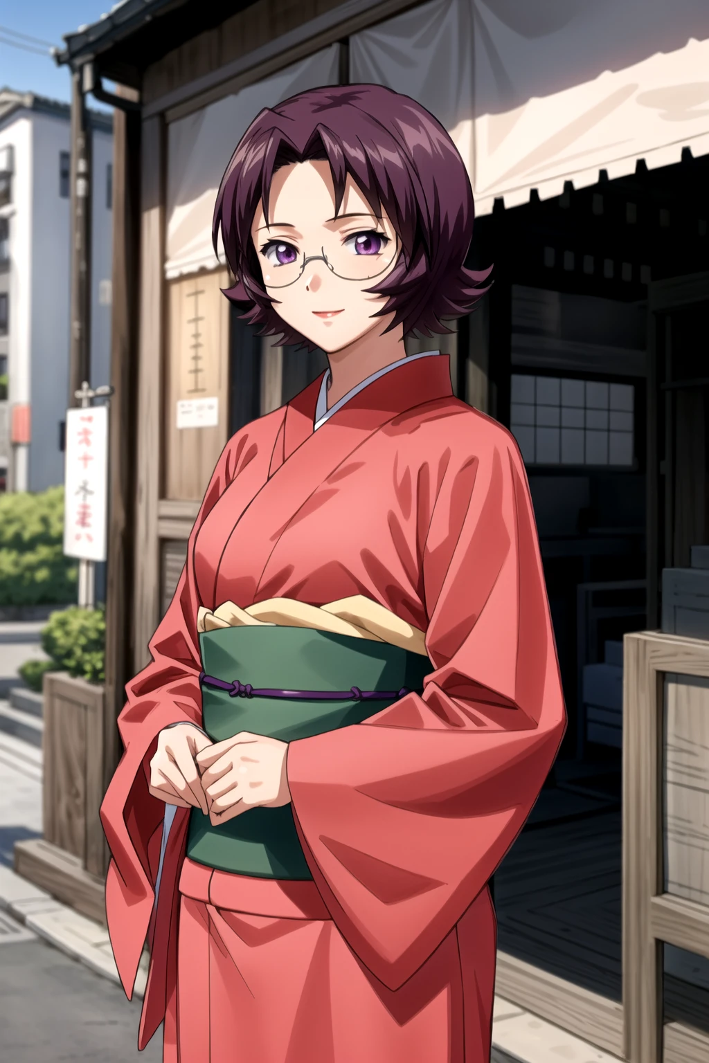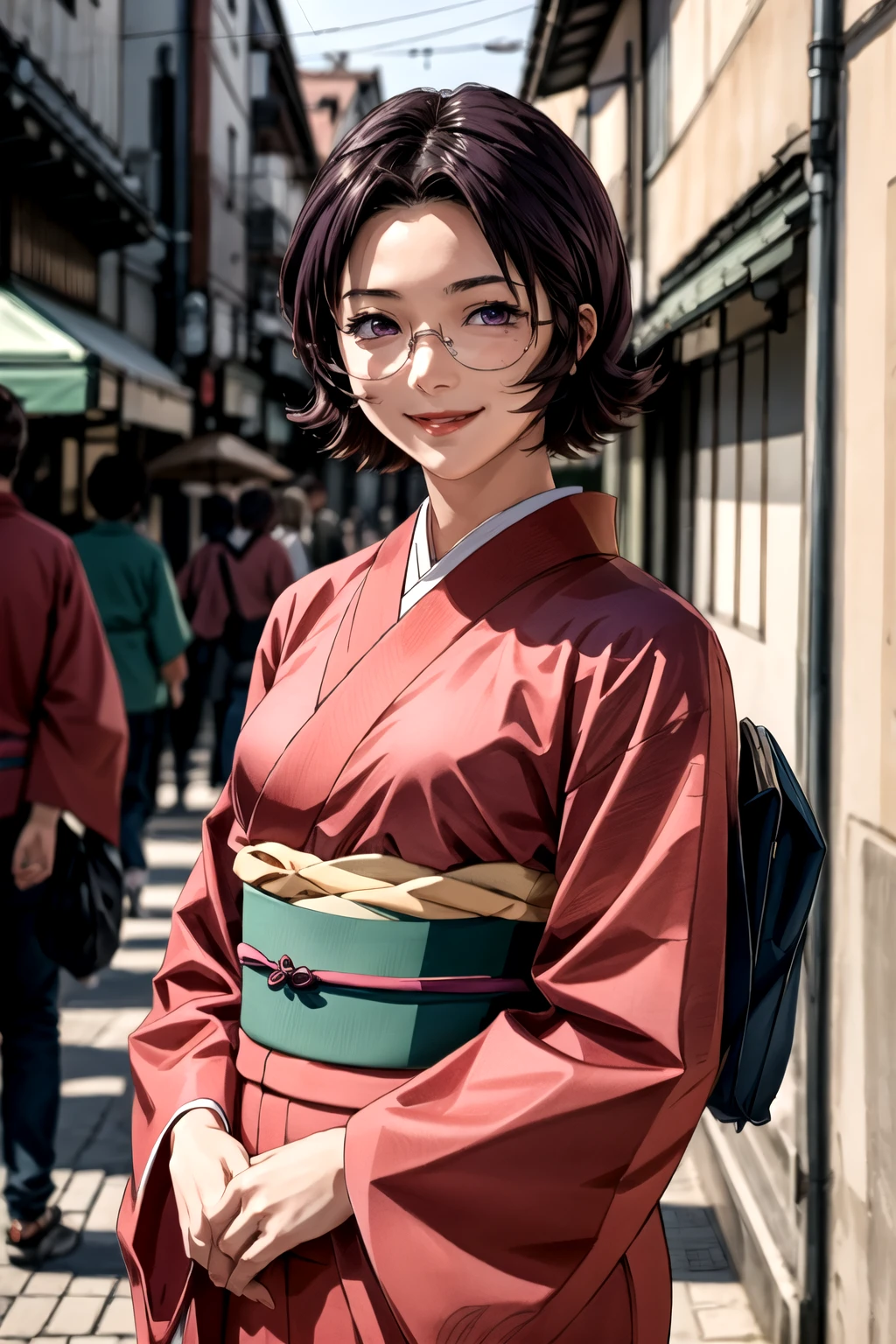goei_wz, short hair, purple hair, breasts, purple eyes, glasses, pink kimono, kimono, japanese clothes, long sleeves, green obi, obi
