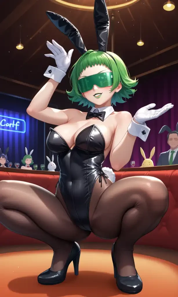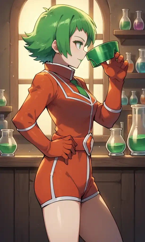 [Default Outfit]: short hair, flipped hair, tinted eyewear, green lips, orange suit, orange compression shorts, turtleneck, green necktie, orange elbow gloves, belt, high heel boots, orange footwear