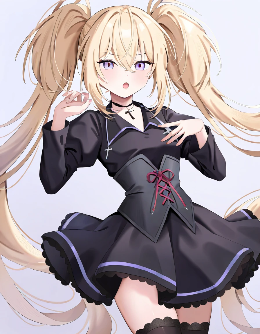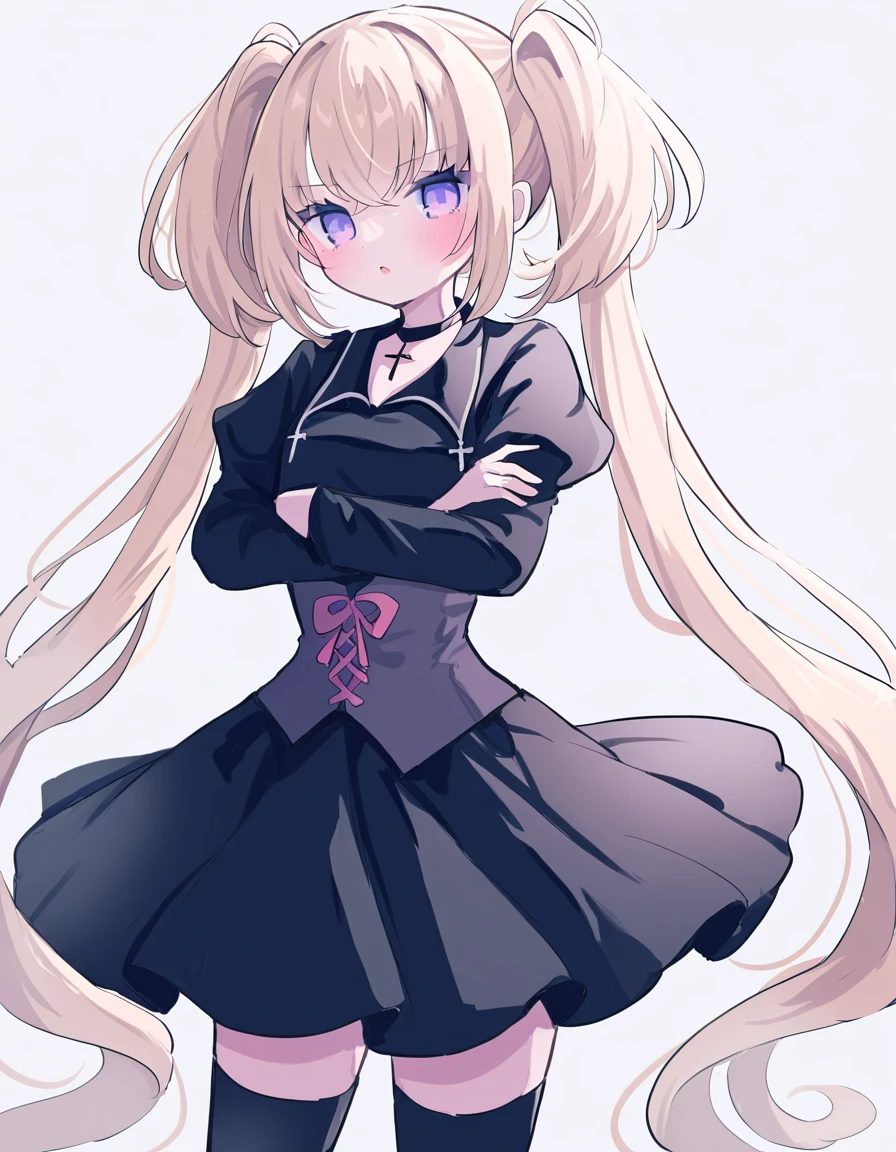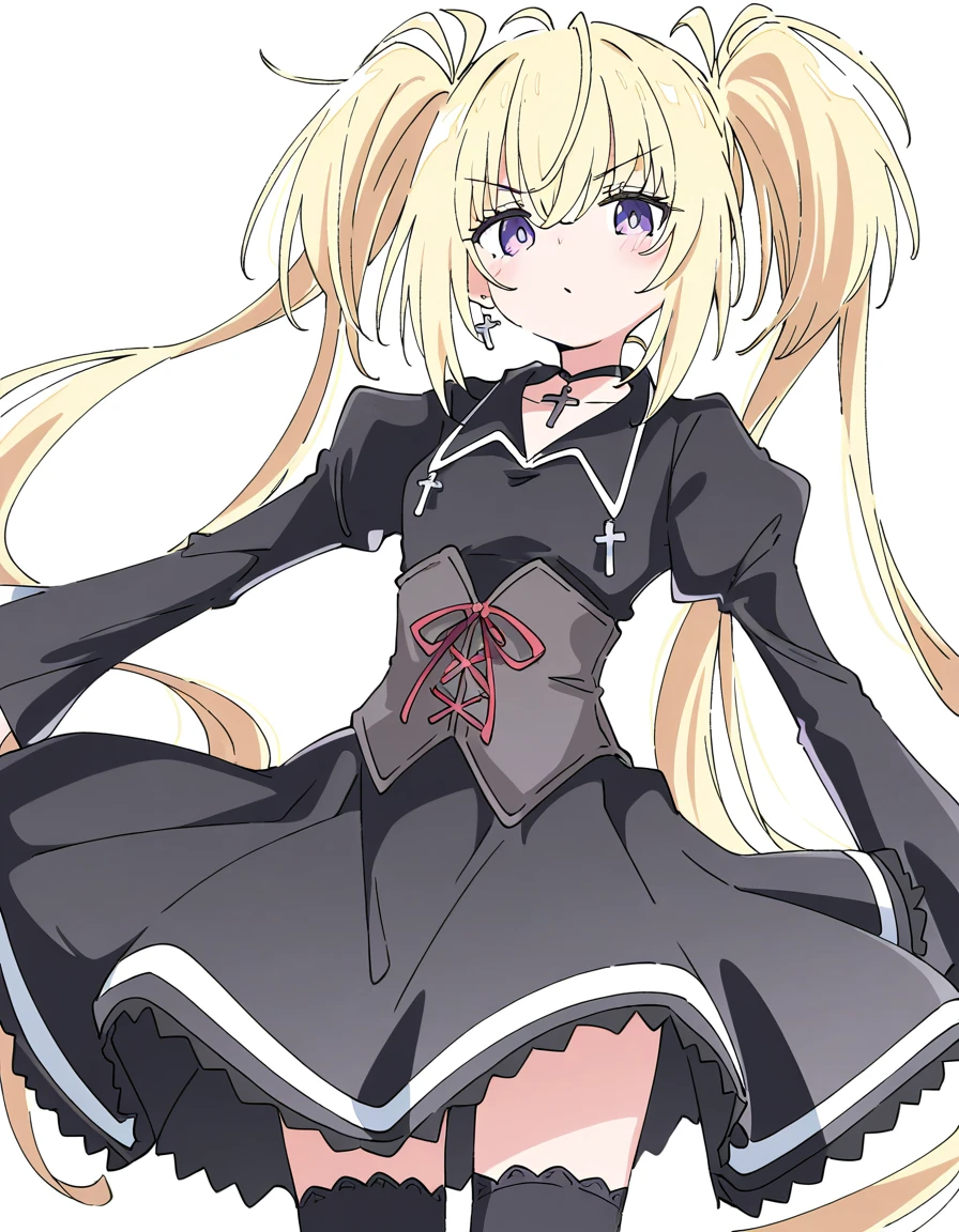 gebei,purple eyes,thighhighs,cross necklace,twintails,black thighhighs,corset,necklace,jewelry,long sleeves,black dress,black skirt,choker,