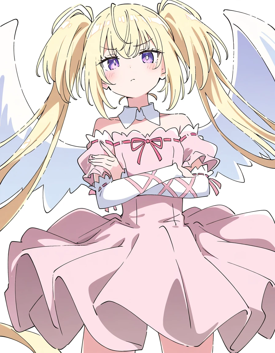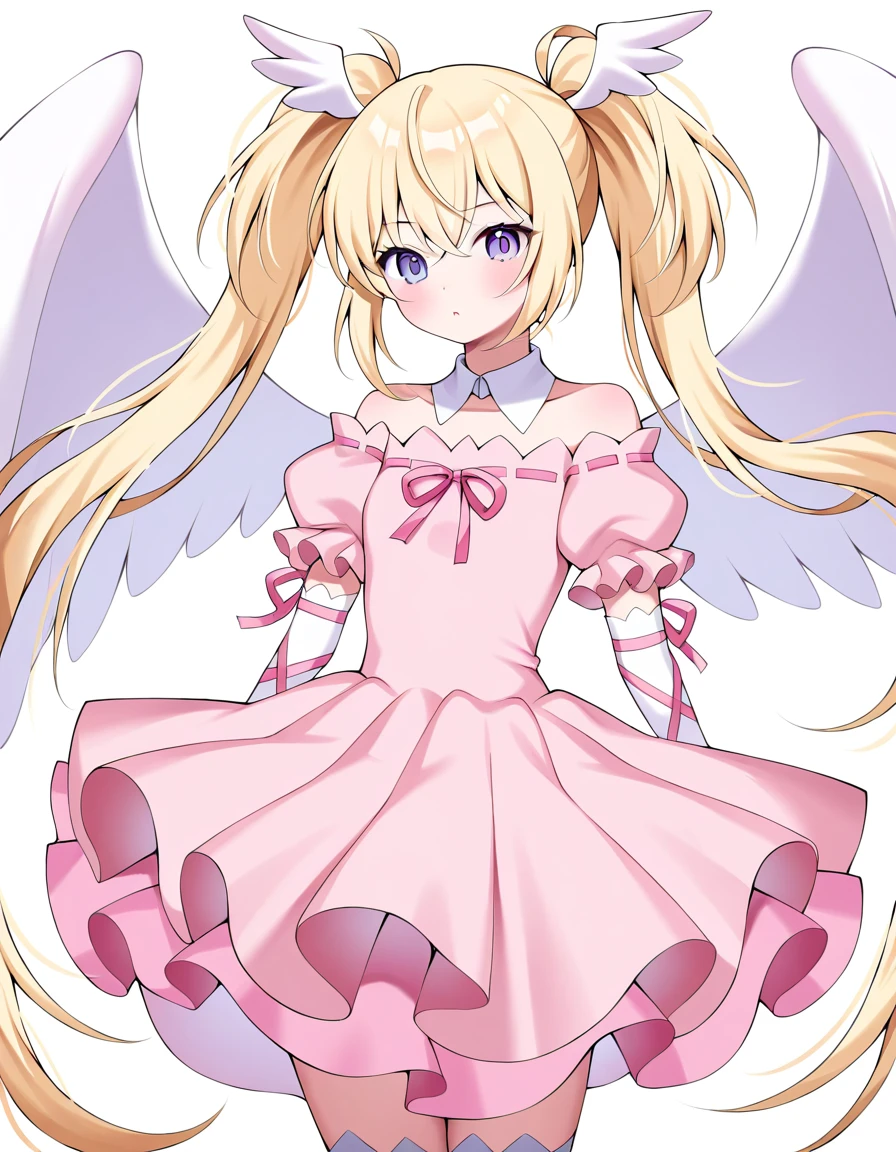 gebei\(da\),wings,twintails,ribbon,pink dress,white wings,detached collar,puffy sleeves,detached sleeves,short sleeves,puffy short sleeves,ribbon trim,bare shoulders,purple eyes,collar,