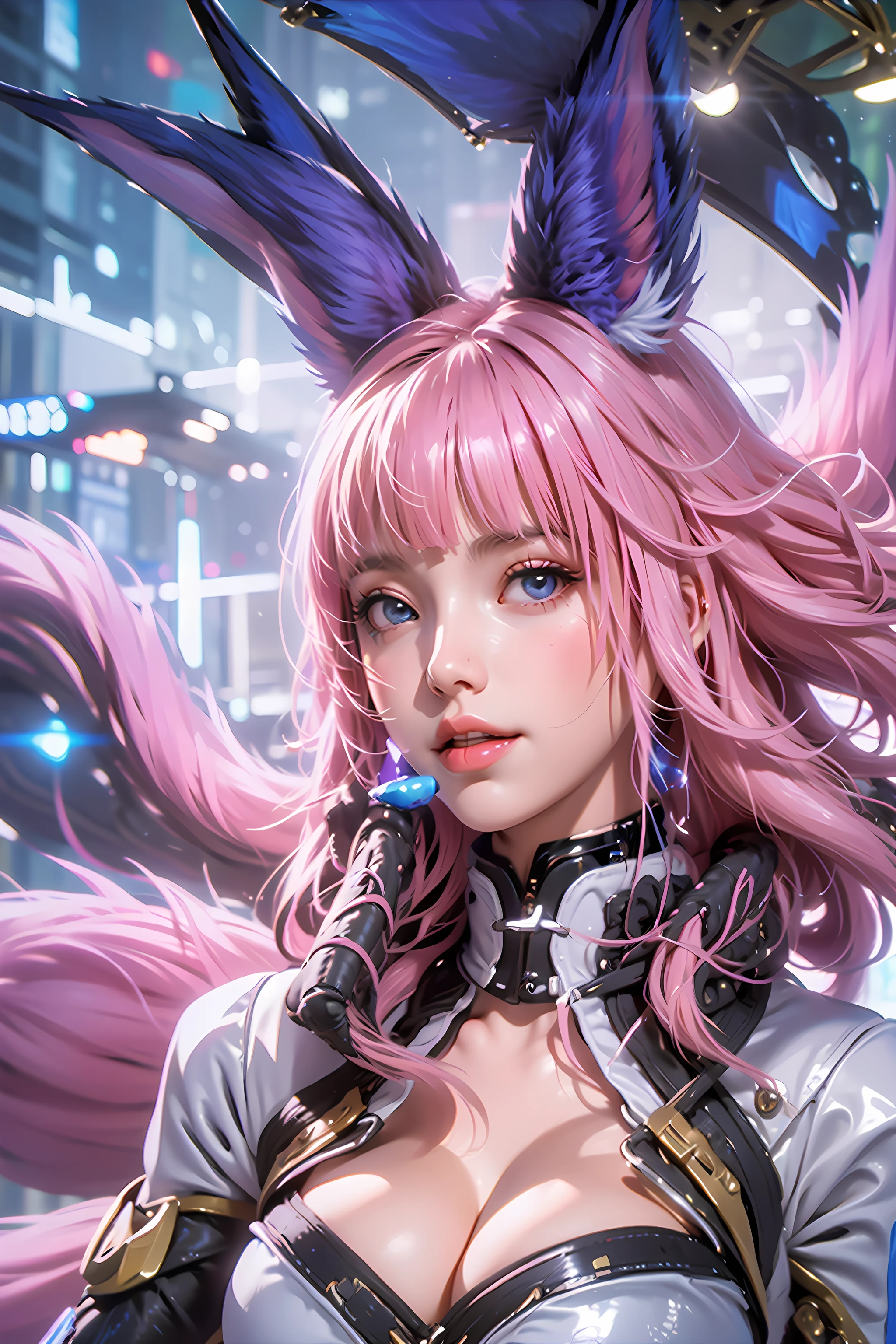 Prompt:Liliana_Racer, 1girl, solo, long hair, pink hair, bangs, blunt bangs, headset, animal ears, fox ears, looking at viewer, blue eyes, smile, lips, closed mouth, cleavage, cleavage cutout, breasts, large breasts, dress, white dress, clothing cutout, gloves, black gloves, elbow gloves, skirt, thighhighs, white thighhighs, tail, fox tail, multiple tails, zettai ryouiki, white footwear, race queen