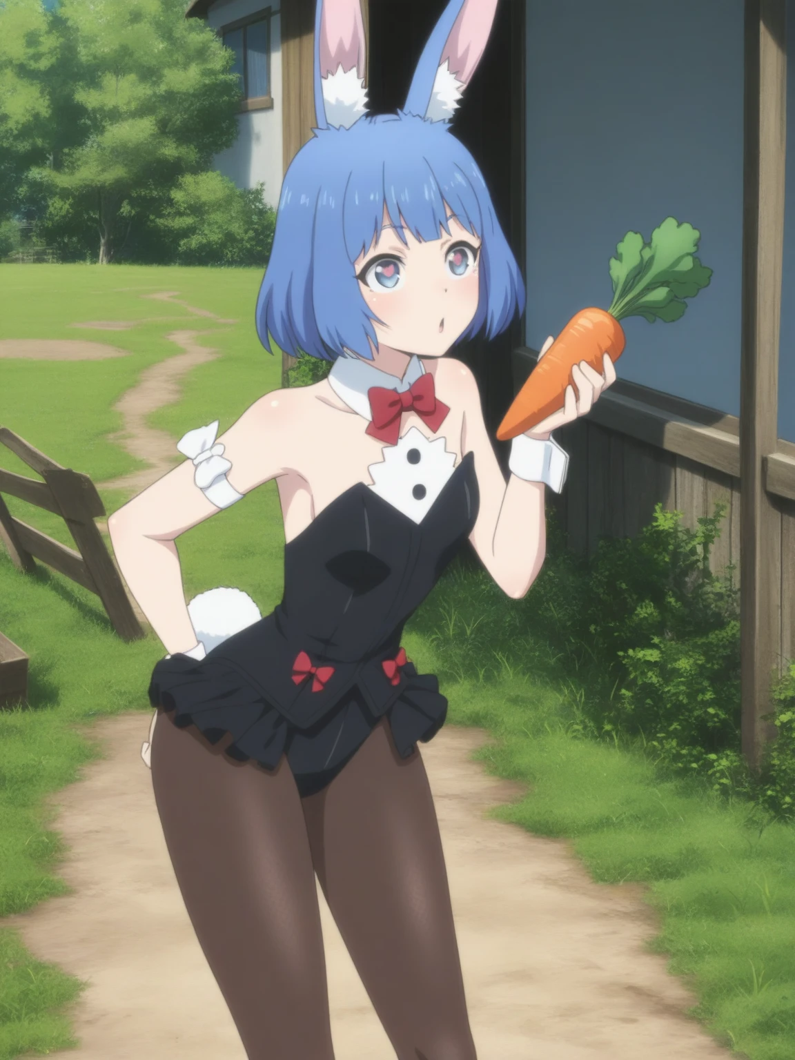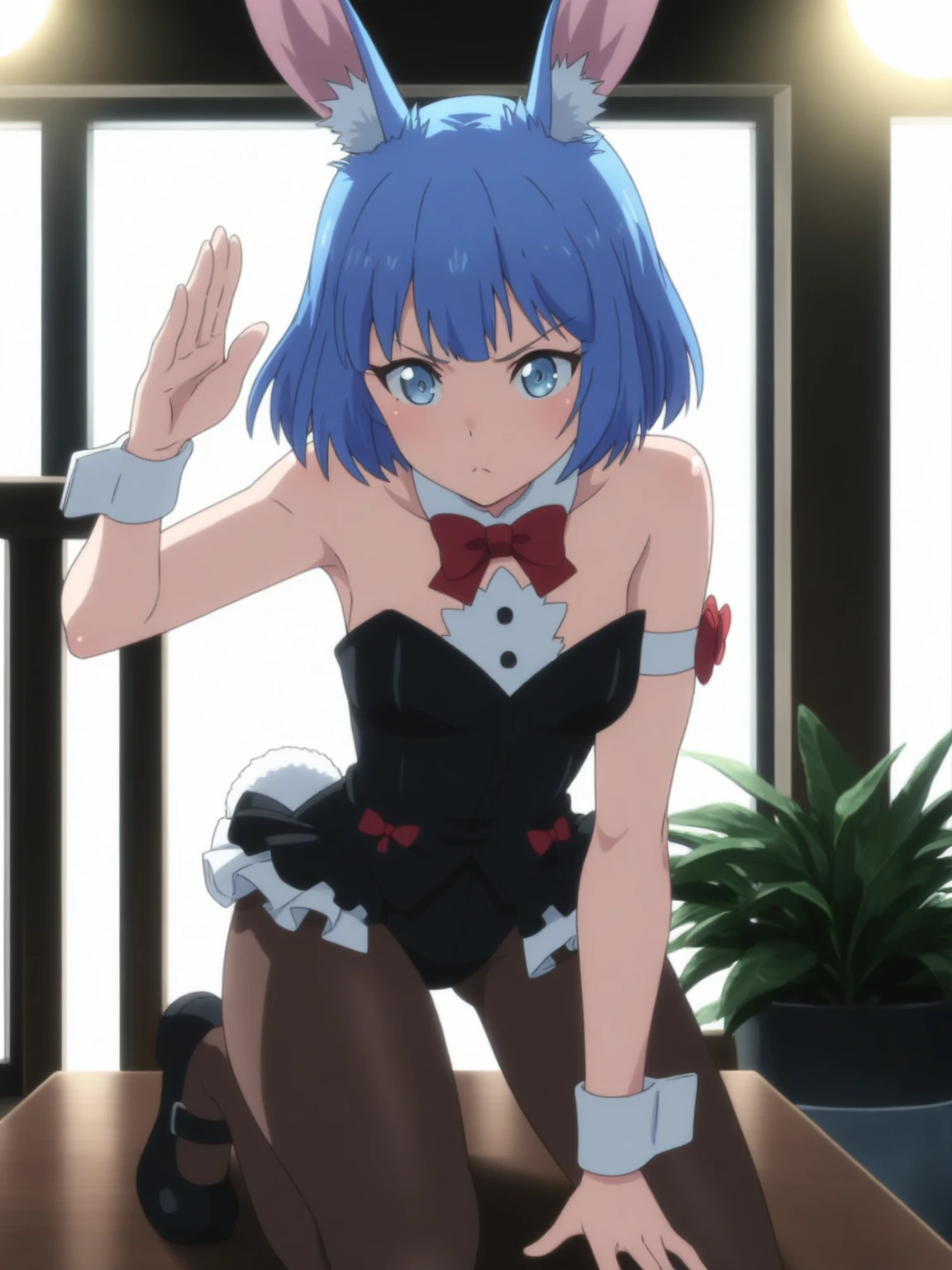 Clothes: (playboy bunny, bunny tail, bunny ears, black leotard, detached collar, wrist cuffs, white armband, showgirl skirt, pantyhose, black mary janes, red bows)