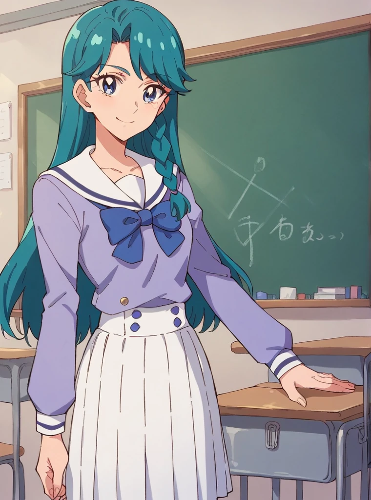 school uniform, serafuku, purple shirt, long sleeves, blue bowtie, white sailor collar, white skirt,