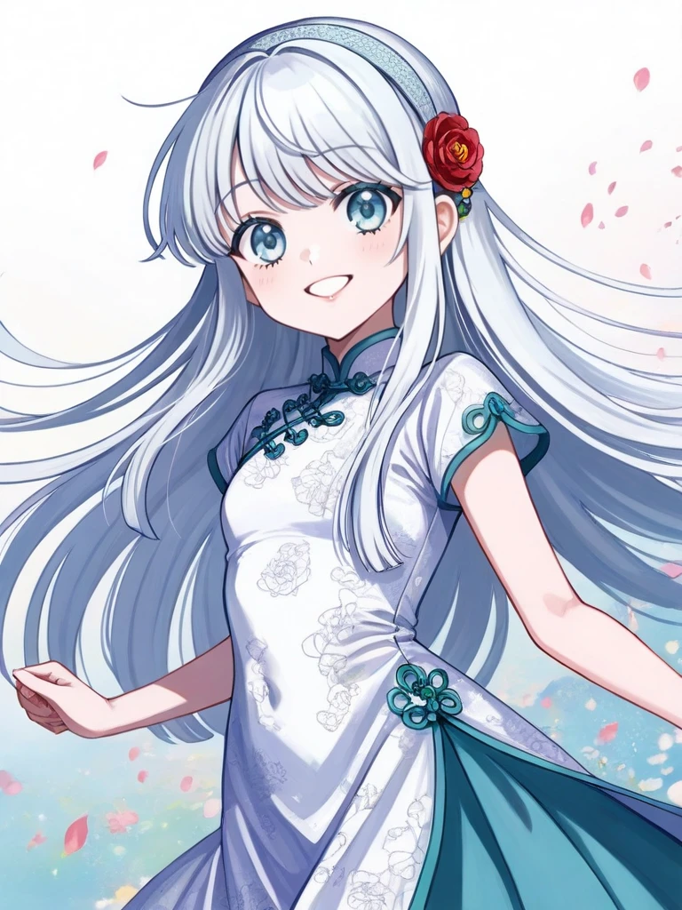 Nia Liston, silver-white hair, long straight hair, light blue eyes, slim body, small breasts