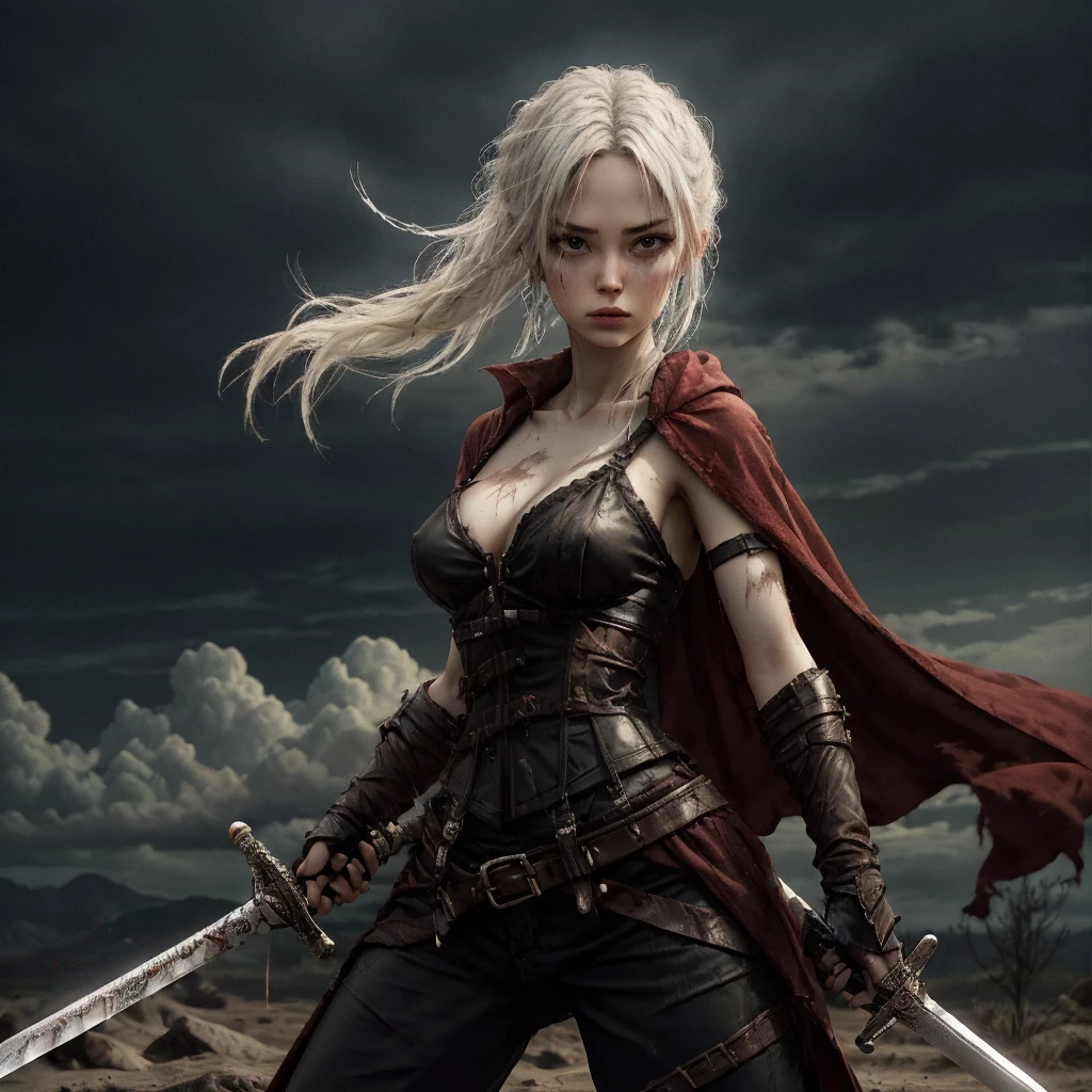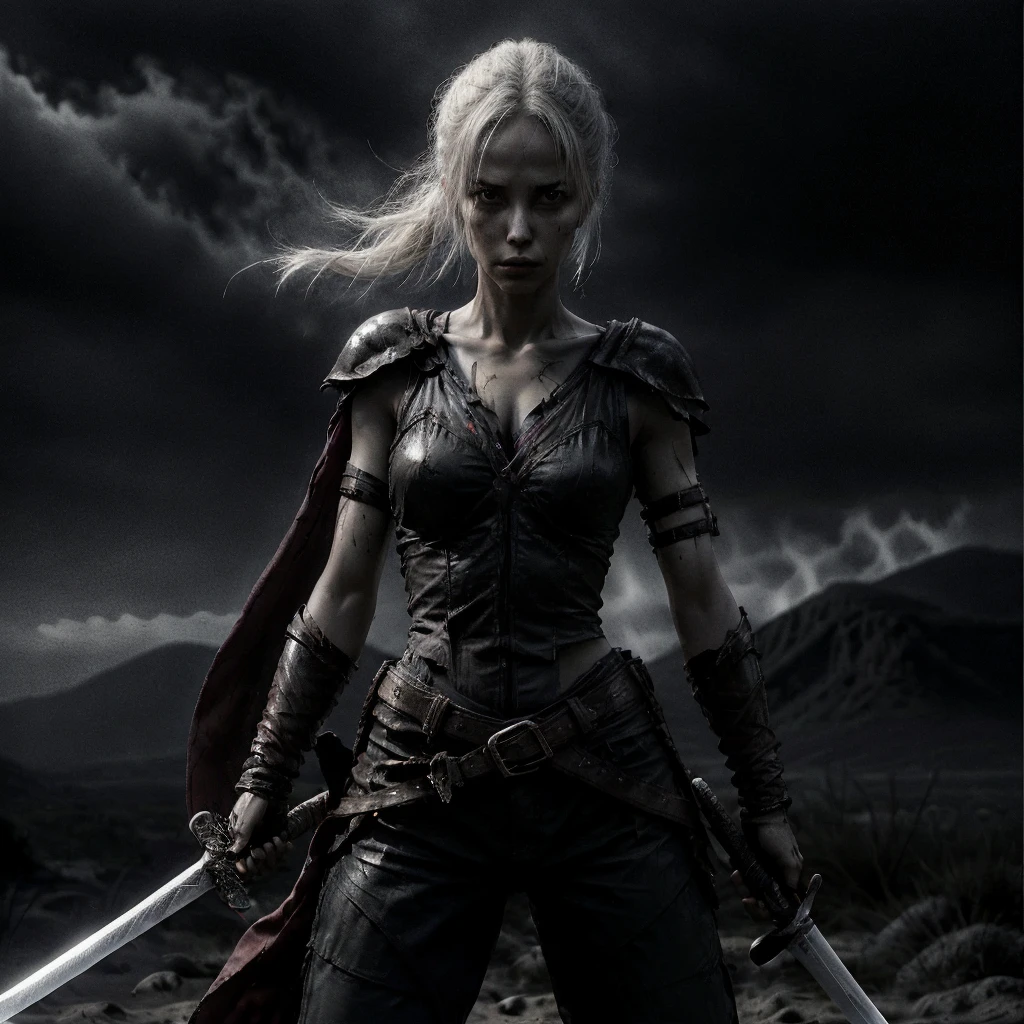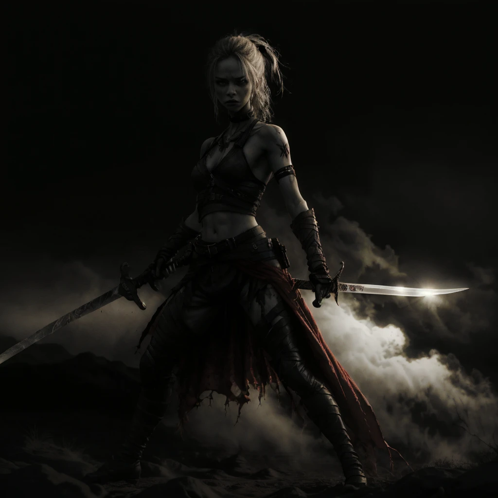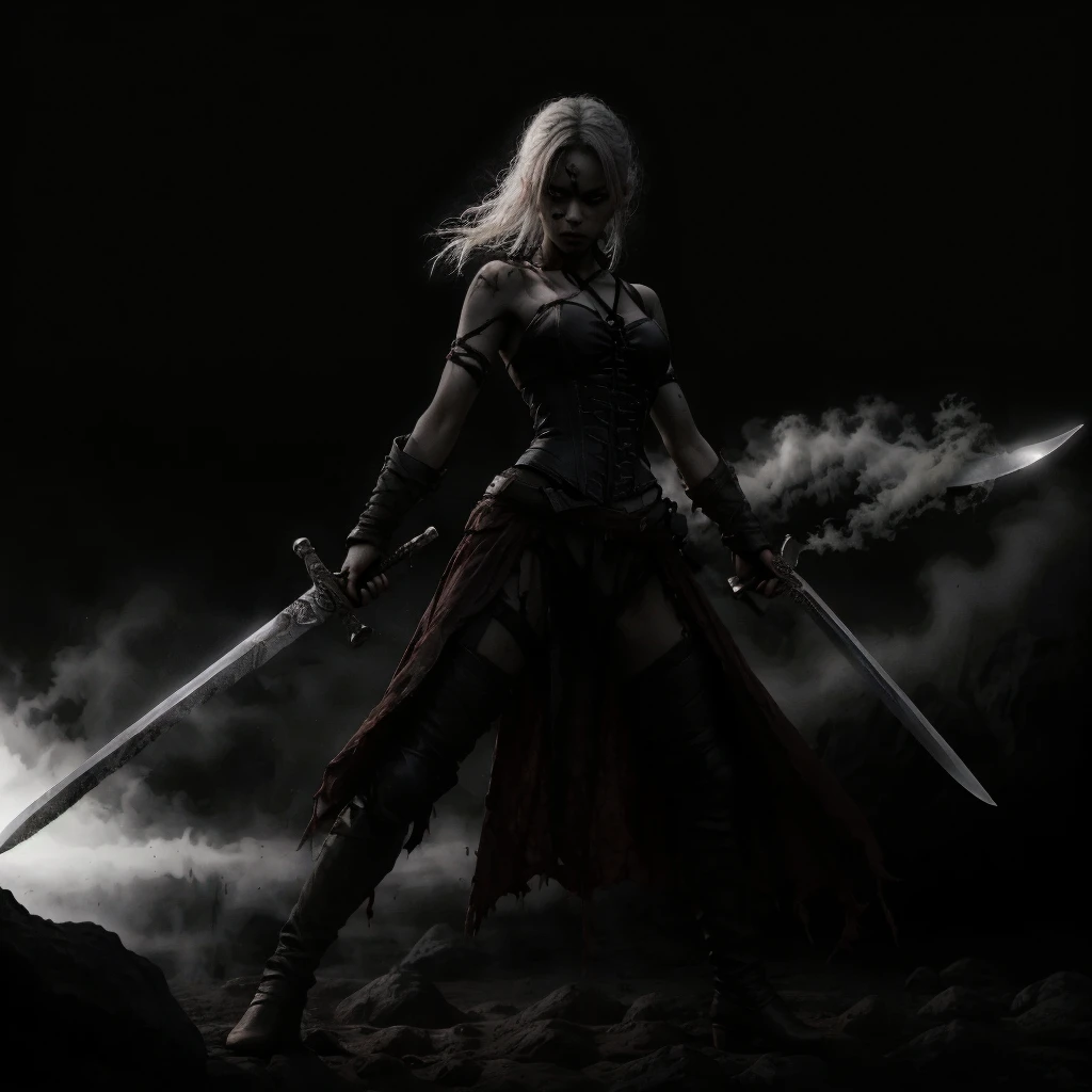 1girl, abs, arm tattoo, armor, bandages, bare shoulders, belt, bikini armor, black pants, blonde hair, blood, blue eyes, blurry, blurry background, boots, bra, braid, breastplate, breasts, brown eyes, chainmail, choker, cleavage, closed mouth, collarbone, corset, cuts, dark skin, dark-skinned female, depth of field, dirty, dual wielding, earrings, facial mark, facial tattoo, fingerless gloves, freckles, gauntlets, gloves, grey eyes, helmet, high heels, holding, holding sword, holding weapon, injury, jewelry, knife, lips, long hair, looking at viewer, medium breasts, midriff, navel, necklace, ???????, nose, pants, pauldrons, piercing, ponytail, realistic, scar, scar on face, sheath, shoulder armor, single pauldron, small breasts, solo, solo focus, standing, sword, tattoo, thigh boots, thighhighs, toned, ???????, torn clothes, torn pants, underwear, unsheathed, ur blade master, weapon, white hair,Description
