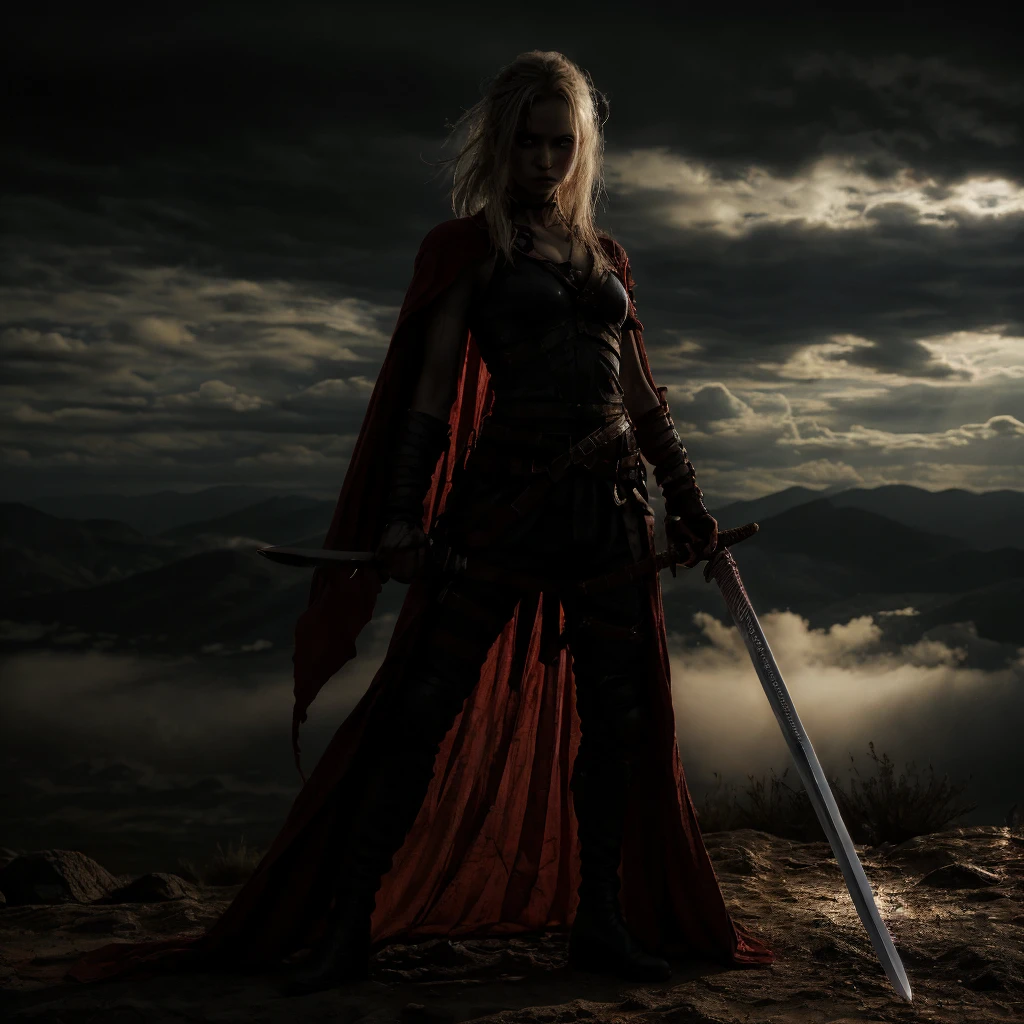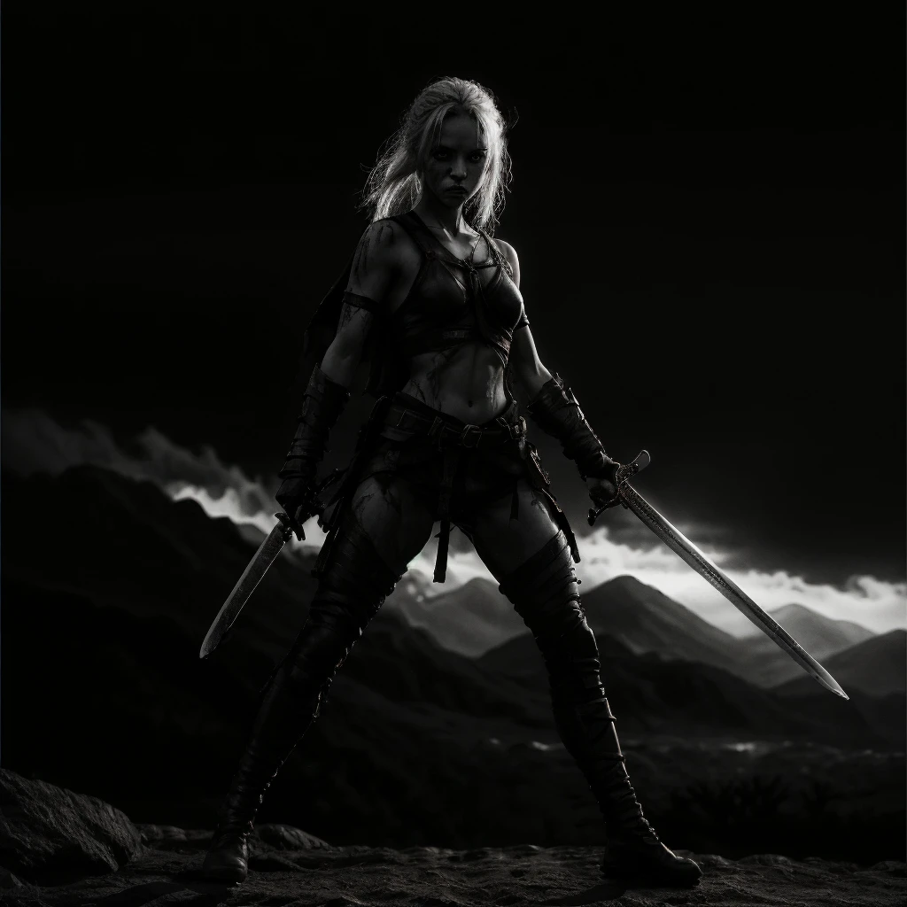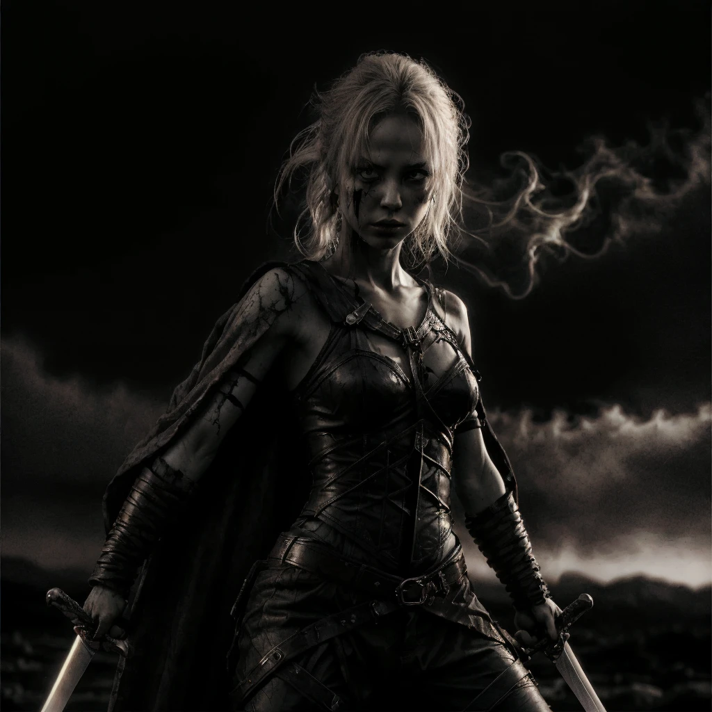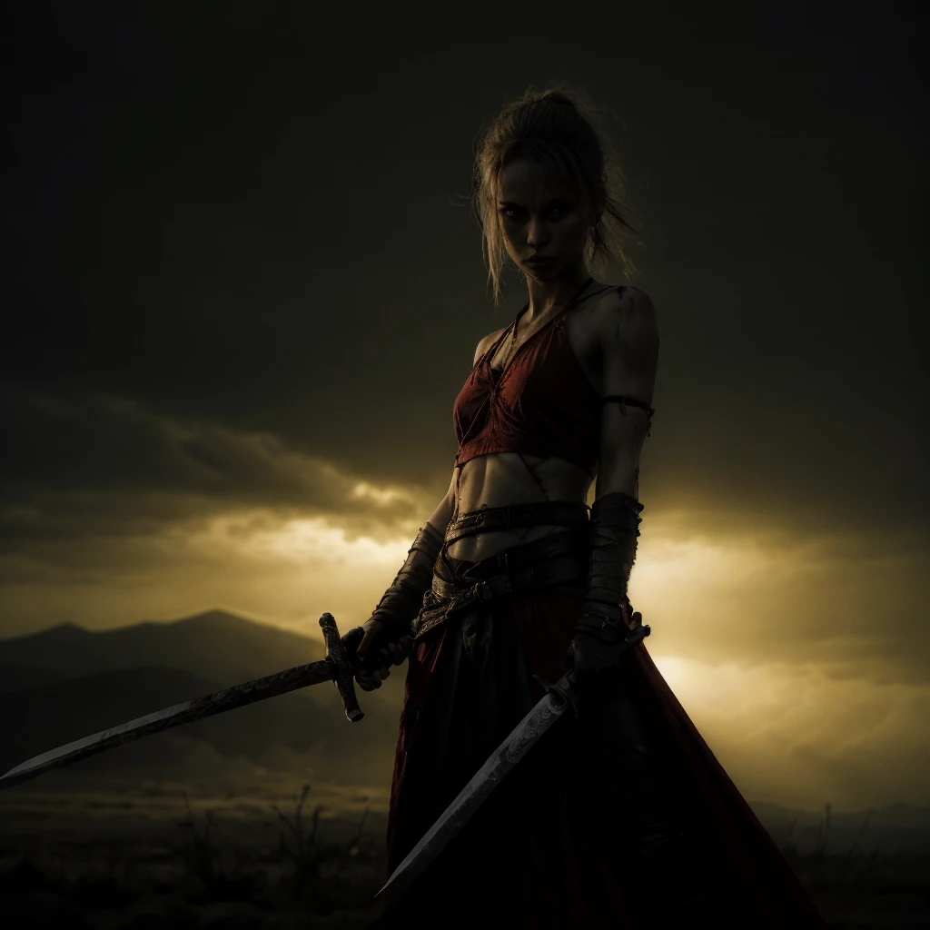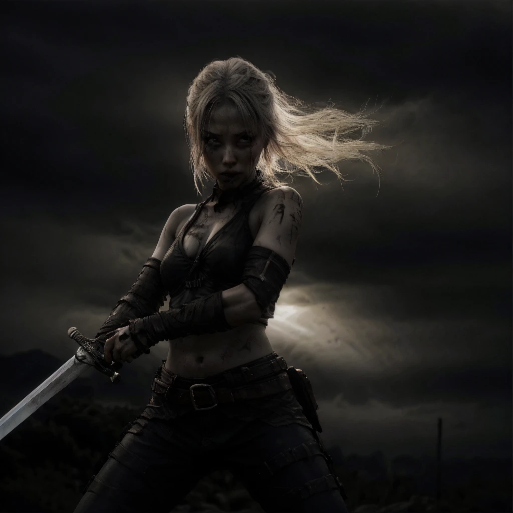 1girl, abs, arm tattoo, armor, bandages, bare shoulders, belt, bikini armor, black pants, blonde hair, blood, blue eyes, blurry, blurry background, boots, bra, braid, breastplate, breasts, brown eyes, chainmail, choker, cleavage, closed mouth, collarbone, corset, cuts, dark skin, dark-skinned female, depth of field, dirty, dual wielding, earrings, facial mark, facial tattoo, fingerless gloves, freckles, gauntlets, gloves, grey eyes, helmet, high heels, holding, holding sword, holding weapon, injury, jewelry, knife, lips, long hair, looking at viewer, medium breasts, midriff, navel, necklace, ???????, nose, pants, pauldrons, piercing, ponytail, realistic, scar, scar on face, sheath, shoulder armor, single pauldron, small breasts, solo, solo focus, standing, sword, tattoo, thigh boots, thighhighs, toned, ???????, torn clothes, torn pants, underwear, unsheathed, ur blade master, weapon, white hair,Description