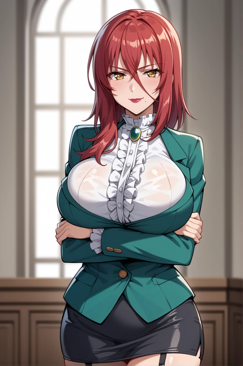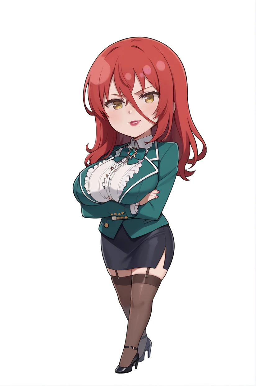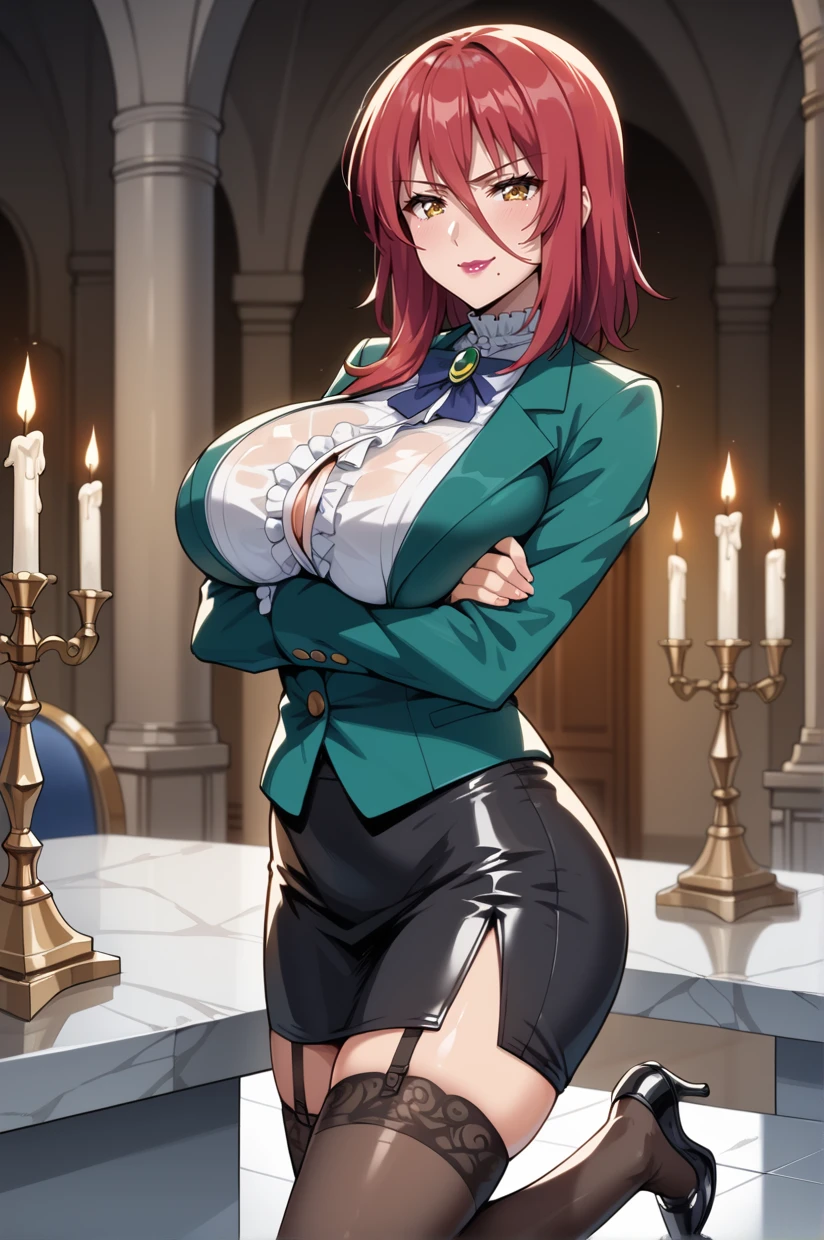 green jacket, white shirt, frills, buttons, long sleeves, brooch, black skirt, pencil skirt, garter straps, black thighhighs, black footwear, high heels
