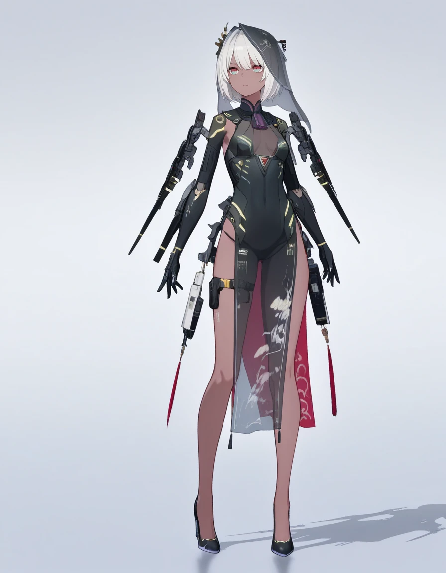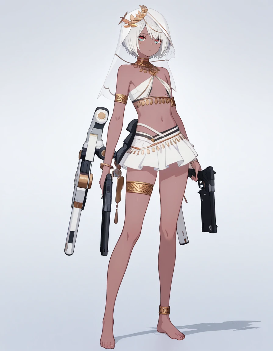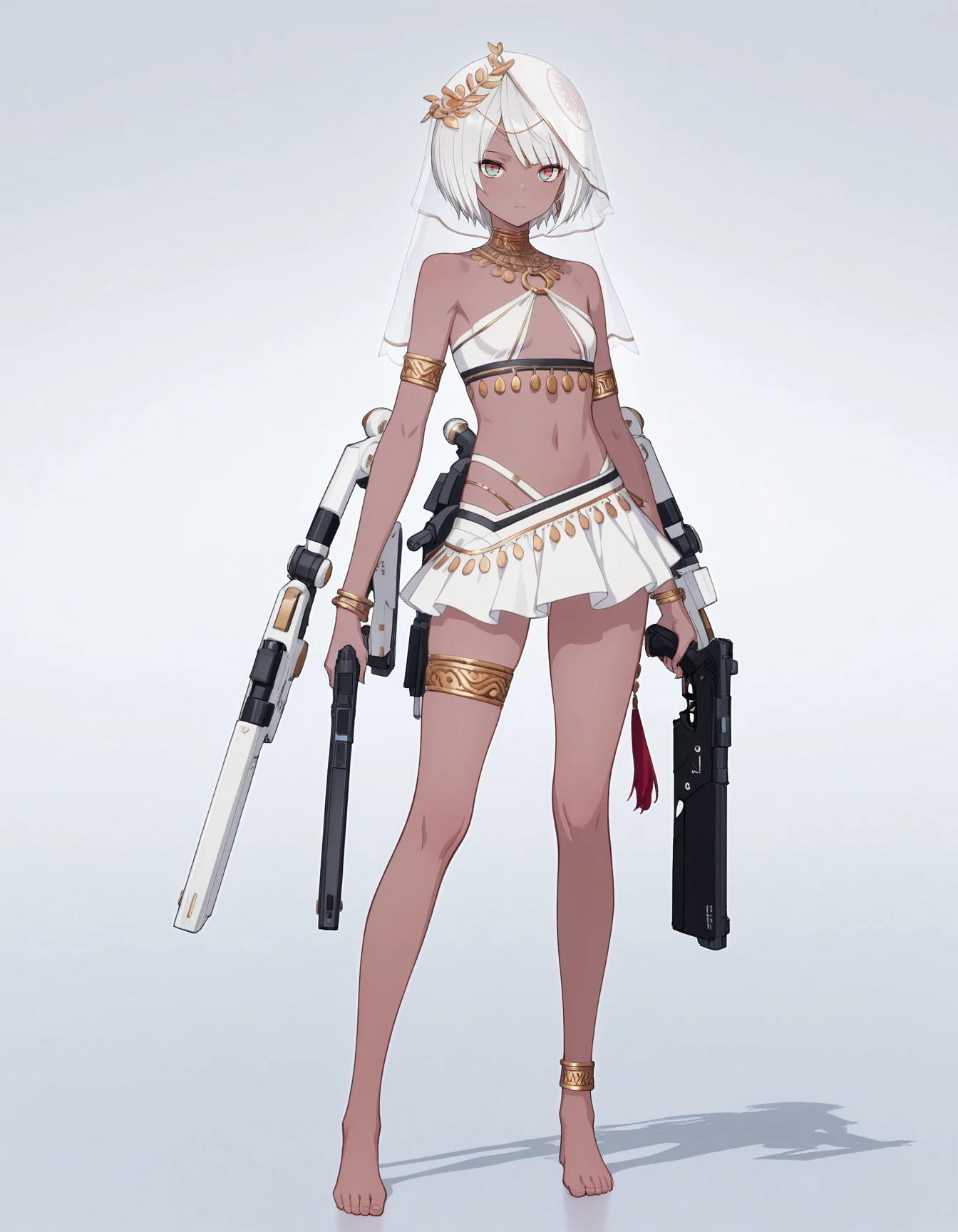 mai_pgr_sophia_mtsw,1girl,solo,short_hair,white_hair,red eyes,gradient_eyes,aqua eyes,dark-skinned_female,small_breasts,veil,jewelry,neck_ring,armlet,leglet,bracelet,anklet,white_skirt,barefoot,robot,holding_gun,dual_wielding