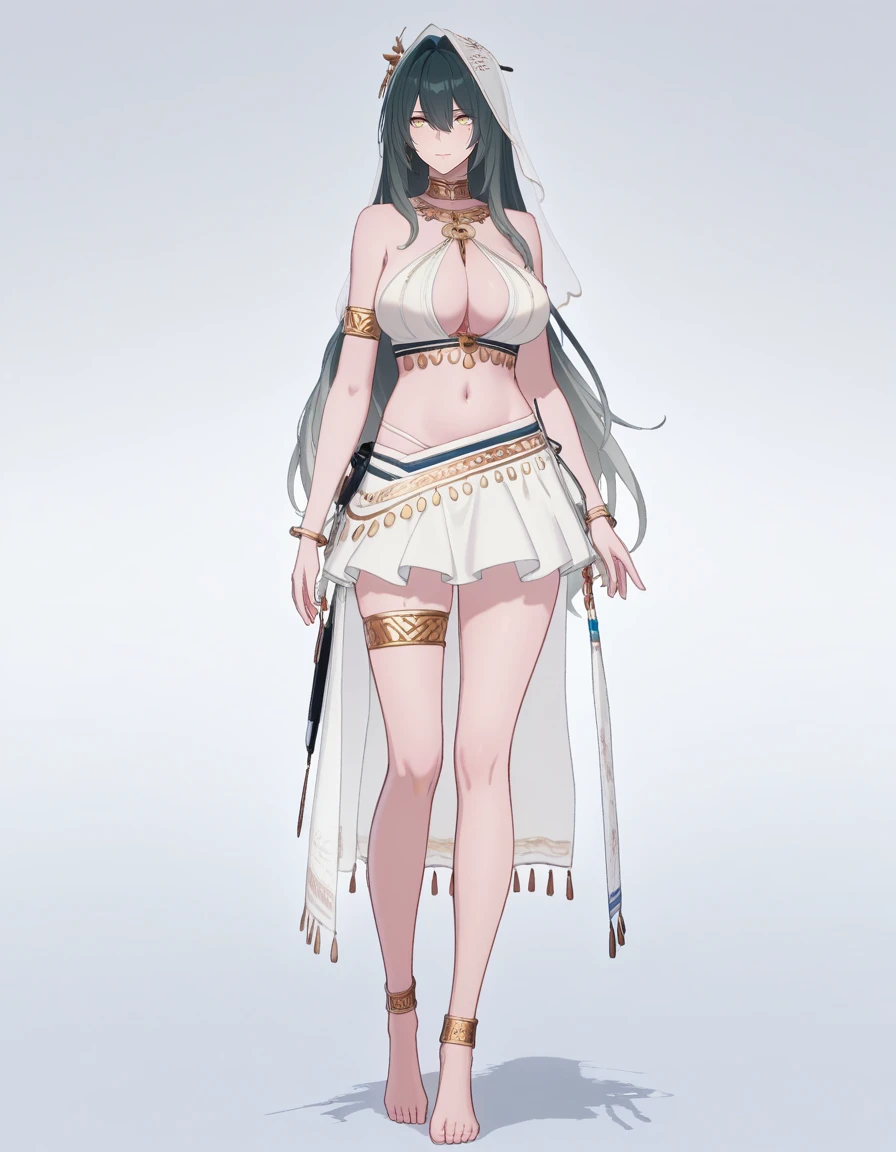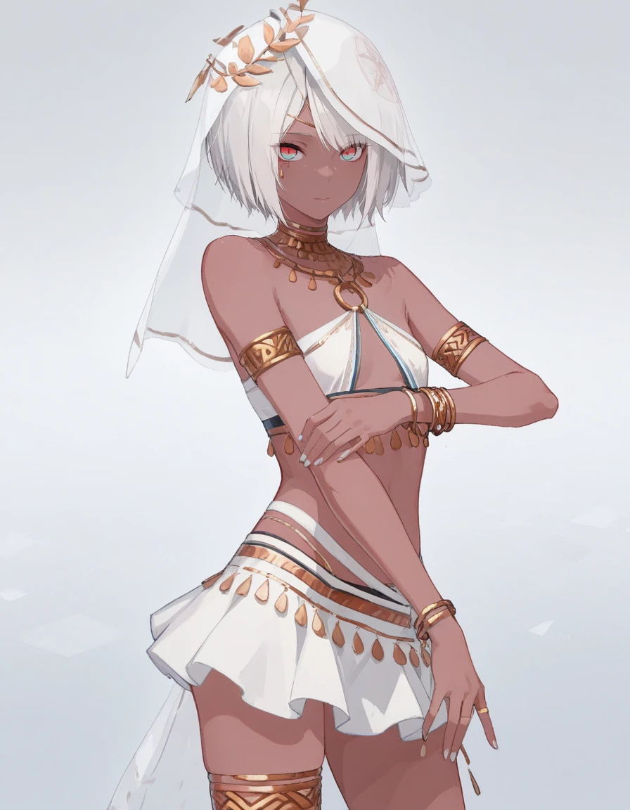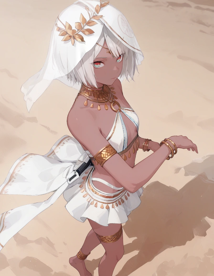 mai_pgr_sophia_mtsw,1girl,solo,short_hair,white_hair,red eyes,gradient_eyes,aqua eyes,dark-skinned_female,small_breasts,veil,jewelry,neck_ring,armlet,leglet,bracelet,anklet,white_skirt,barefoot,robot,holding_gun,dual_wieldingBianca with 幽涧青卞