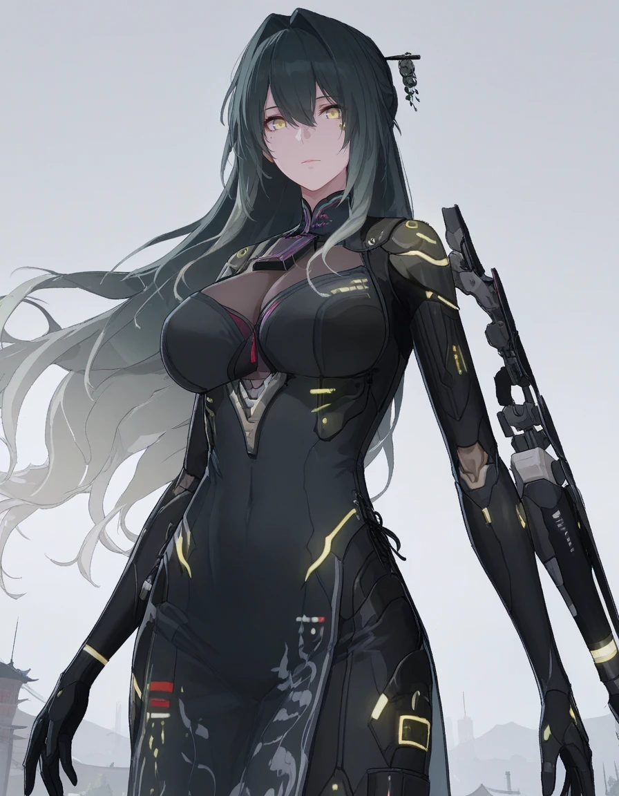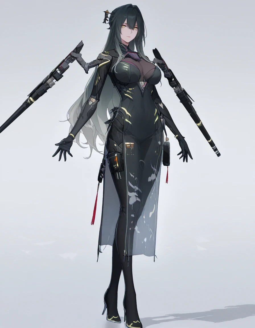 mai_pgr_bianca_yjqb,long_hair,breasts,green_hair,multicolored_hair,hair_between_eyes,yellow_eyes,hair_ornament,mature female,(aged_up,:1.5),gloves,dress,china_dress,black_dress,see-through_cleavage,bodysuit,high_heels,mecha_musume,mechanical_arms,science_fiction,bow_(weapon)Different outfit for different character can also be combined for training, but I personally feel that they are not very flexible to use.
