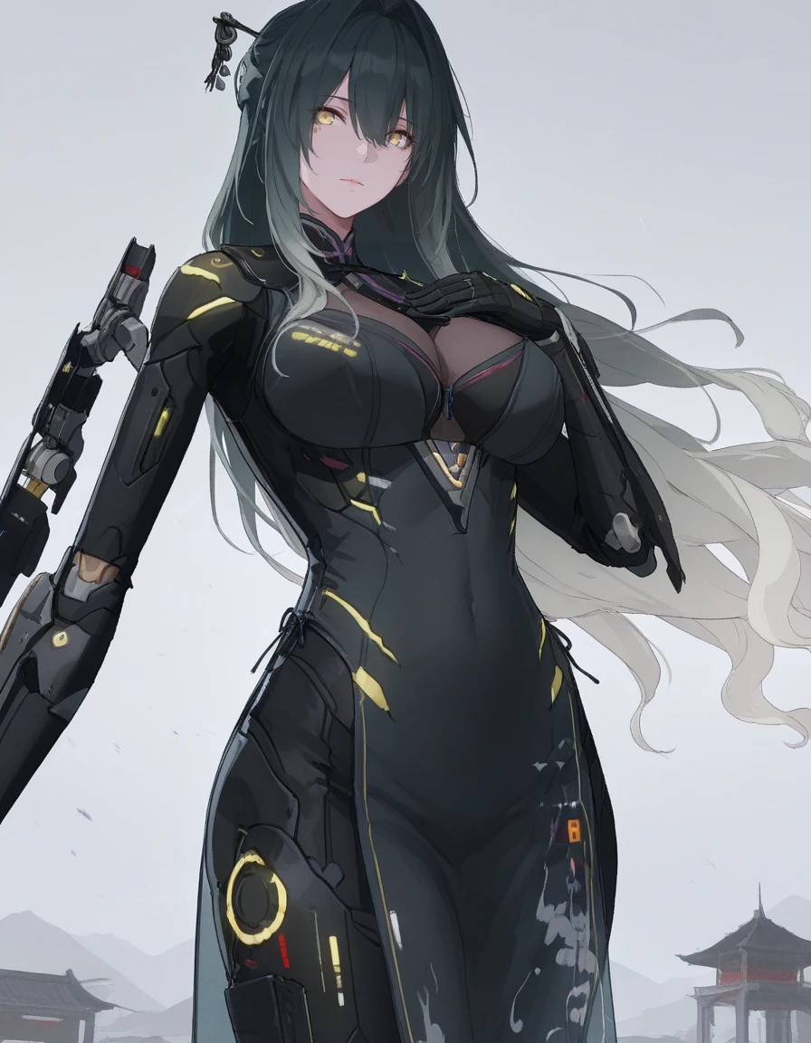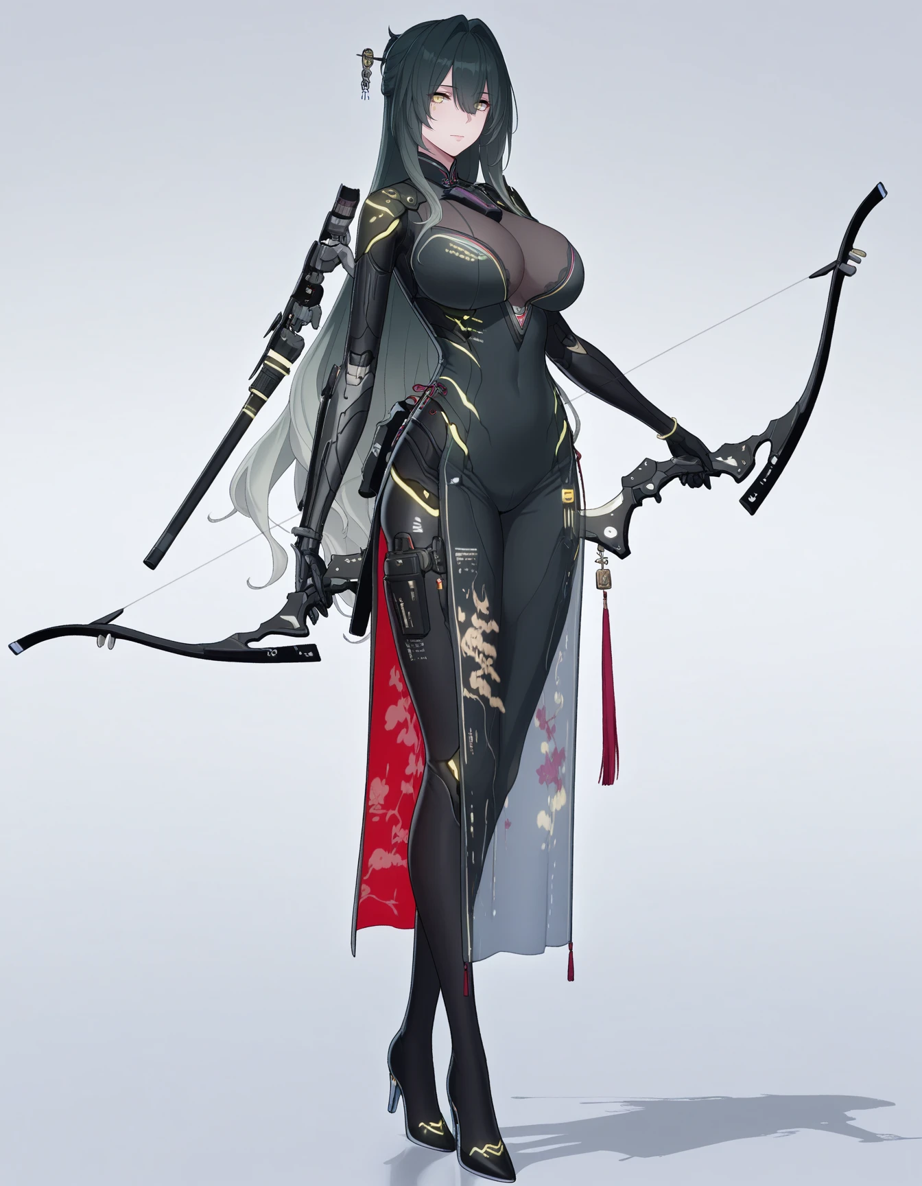 mai_pgr_bianca_yjqb,long_hair,breasts,green_hair,multicolored_hair,hair_between_eyes,yellow_eyes,hair_ornament,mature female,(aged_up,:1.5),gloves,dress,china_dress,black_dress,see-through_cleavage,bodysuit,high heels,mecha_musume,mechanical_arms,science_fiction,bow_\(weapon\)