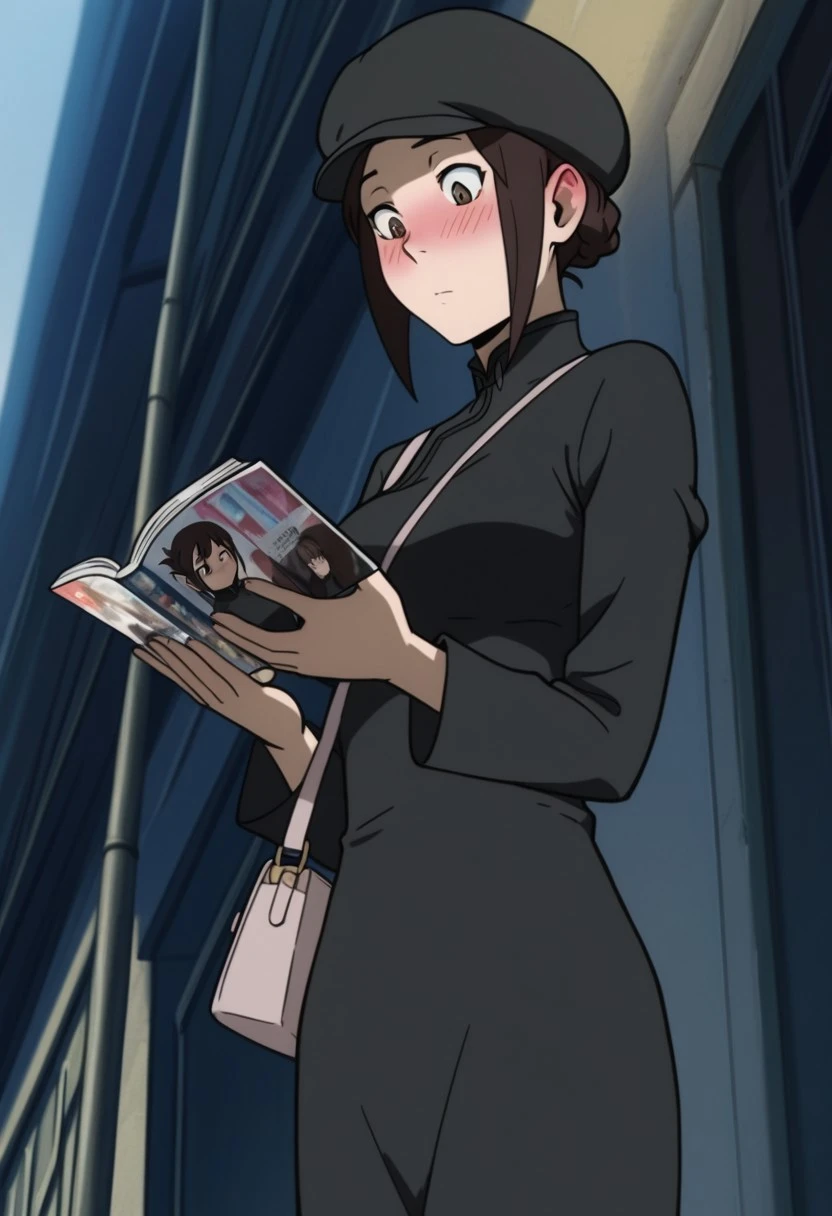 black dress, black boots, handbag,