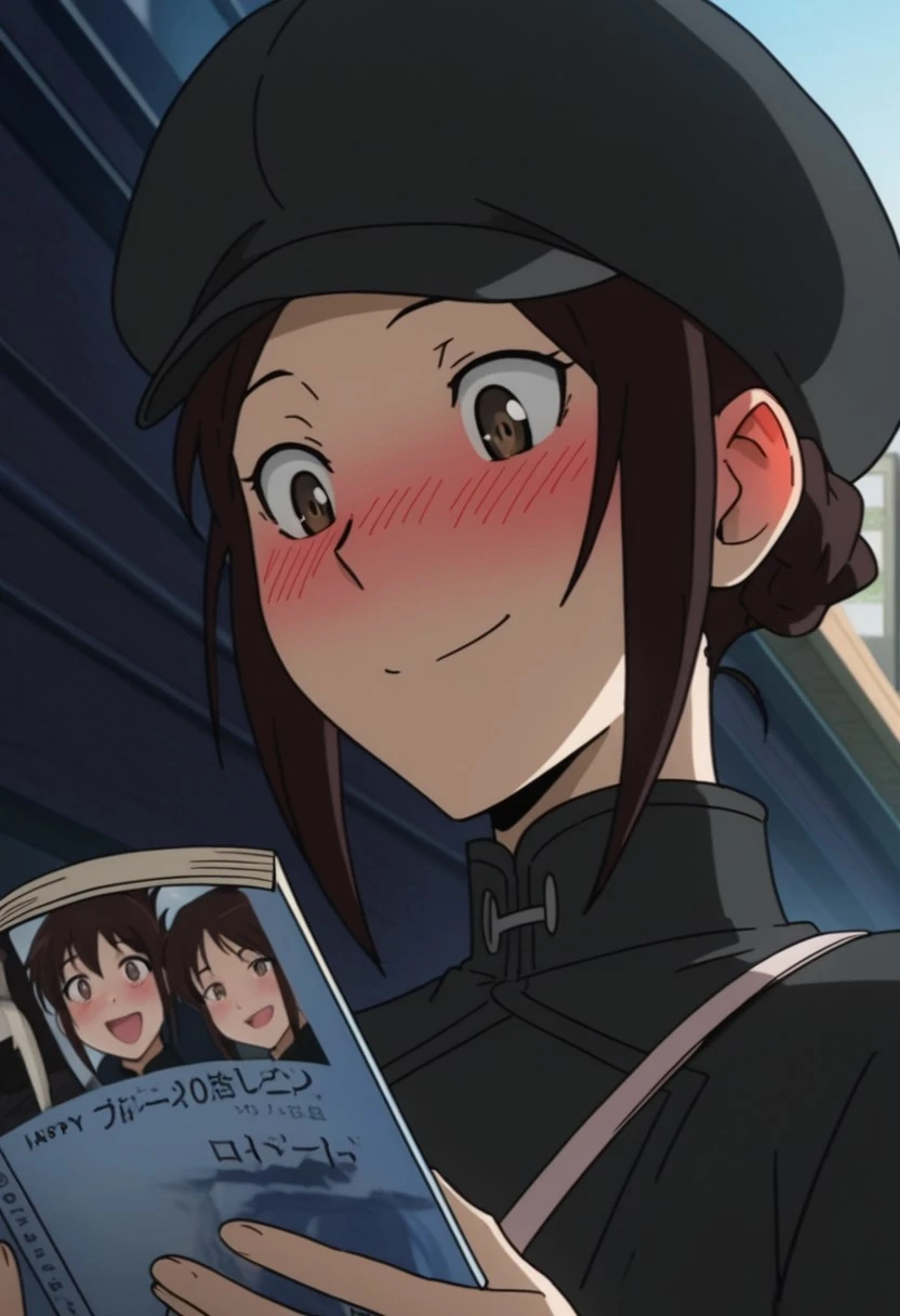 french braid, folded ponytail, brown hair, brown eyes,
