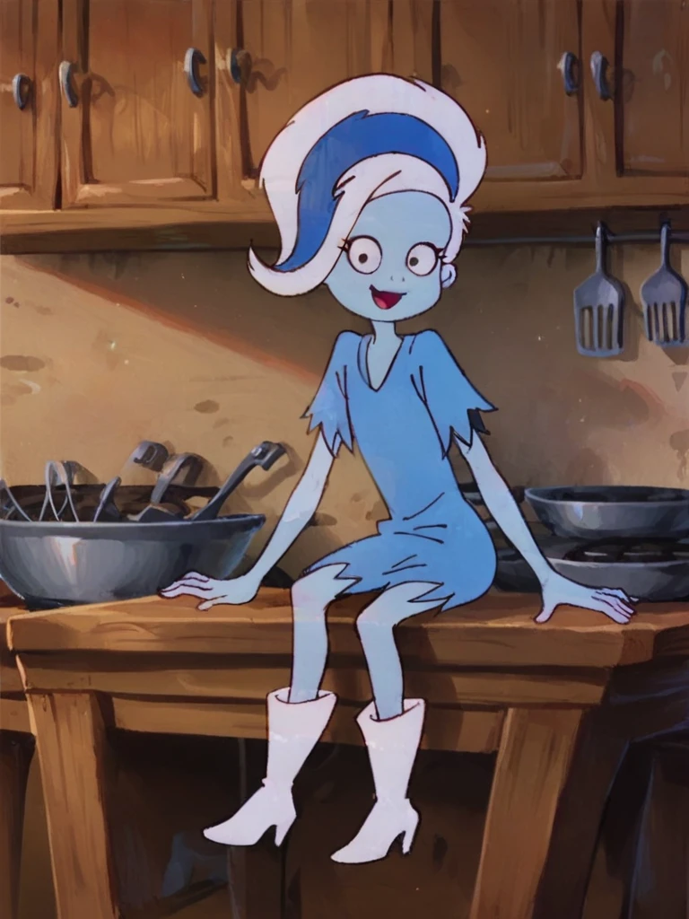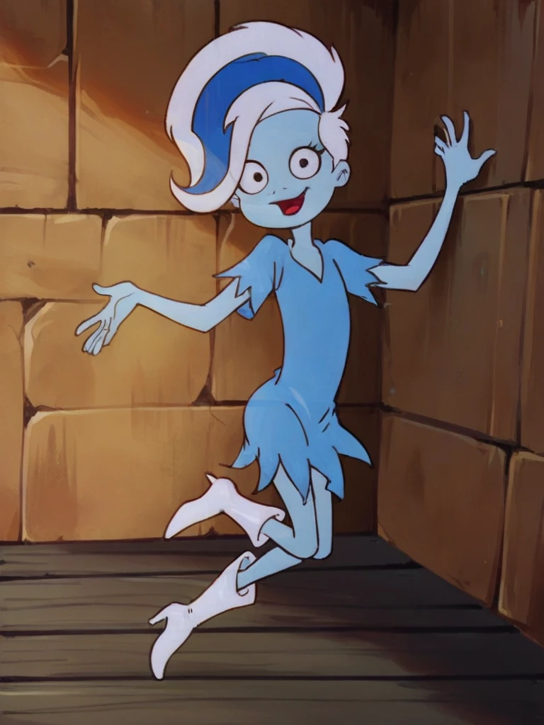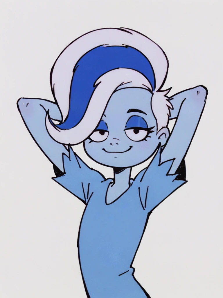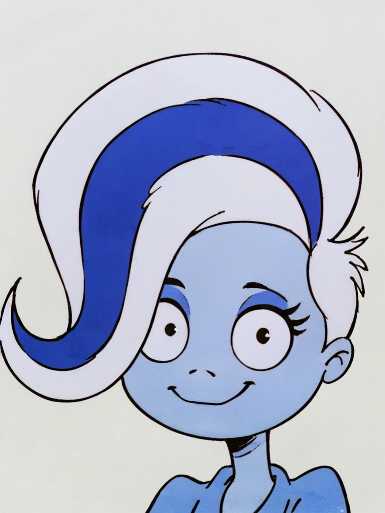 phantasma phantom, blue skin, white hair, short hair, blue streak, black eyes,