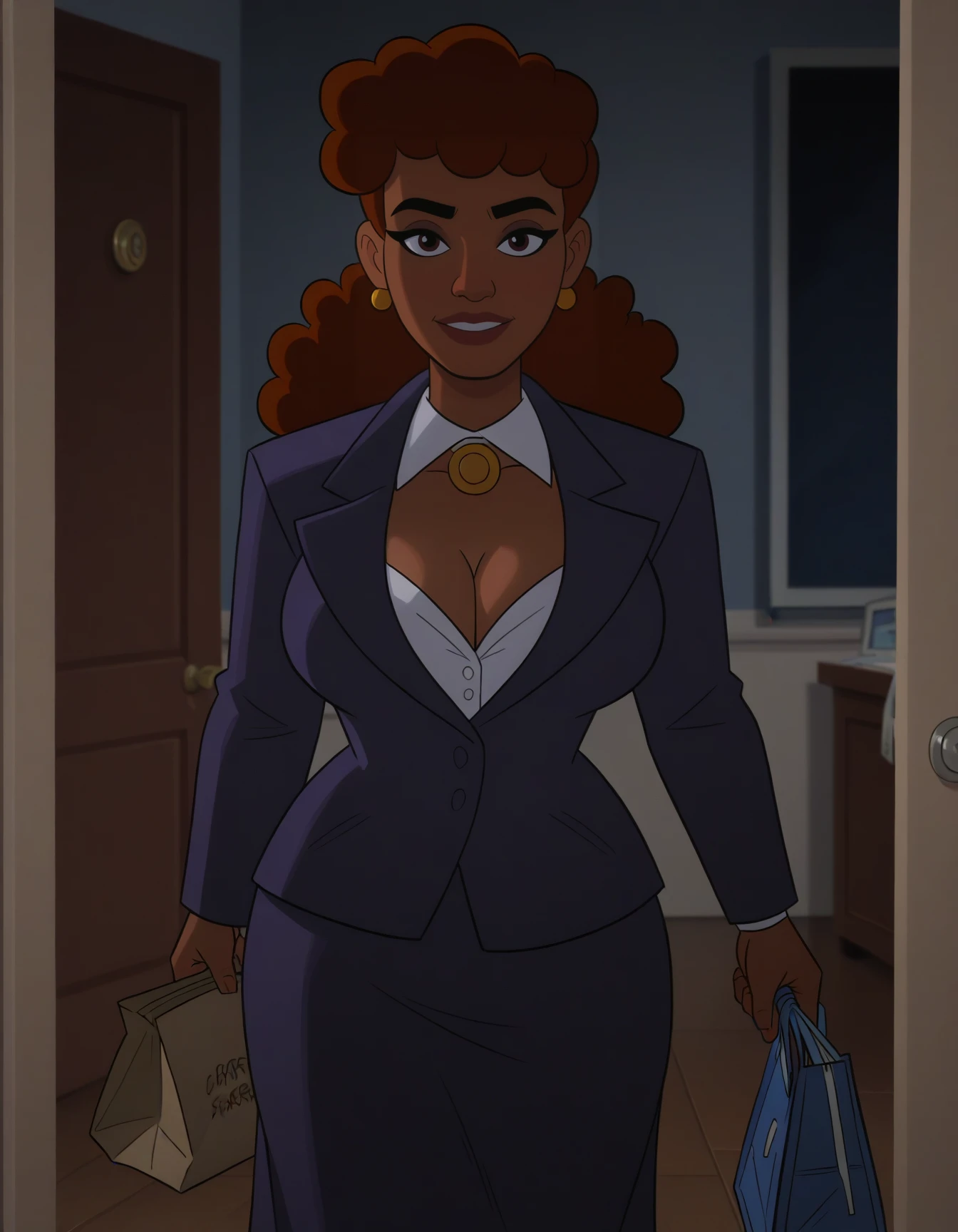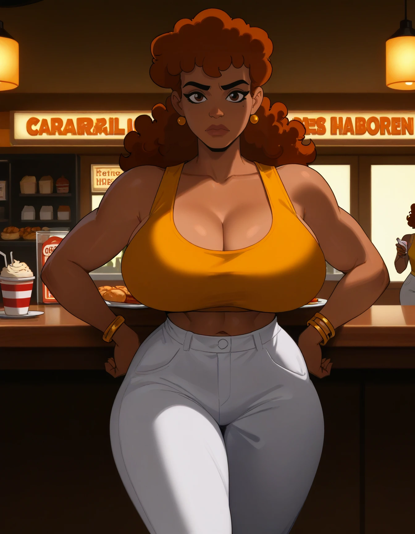 dark brown eyes, earrings, curly hair, dark-skinned female