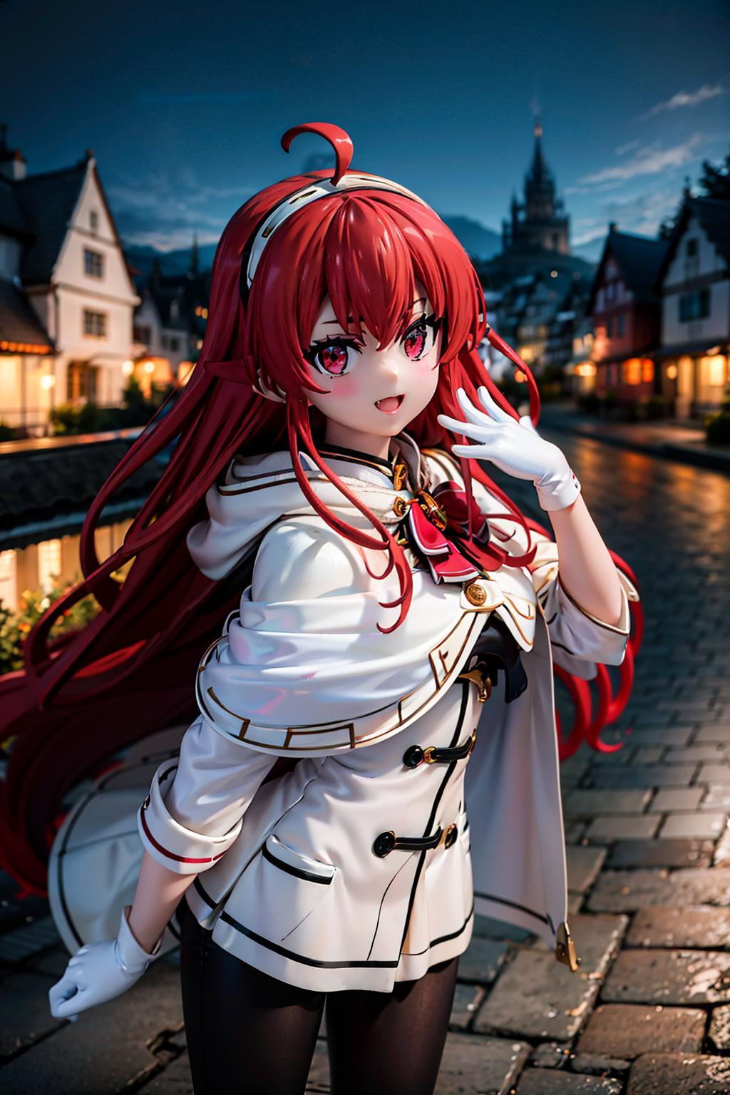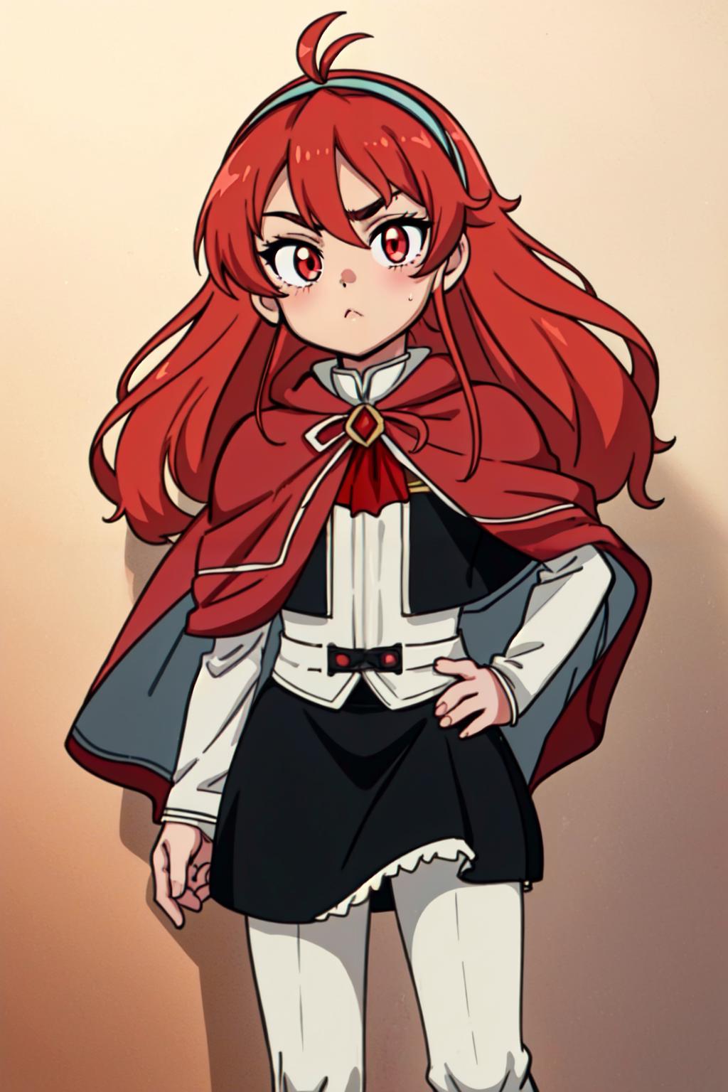 📌Prompt:Eris Greyrat, red hair, red eyes, ahoge, hairband, capelet|披肩, off white coat, black gloves, brown footwear