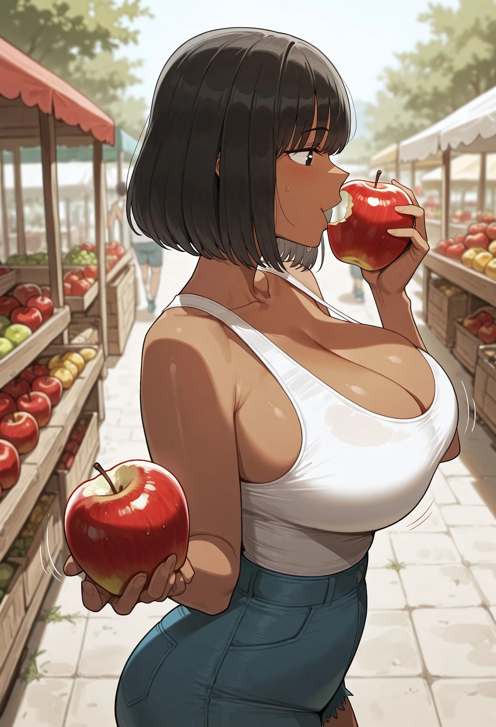 1girl, solo, black hair, medium hair, bangs, black eyes, collarbone, cleavage, large breasts, dark skin, dark-skinned femaleOutfit: