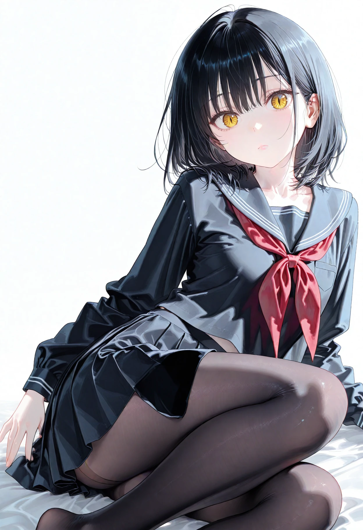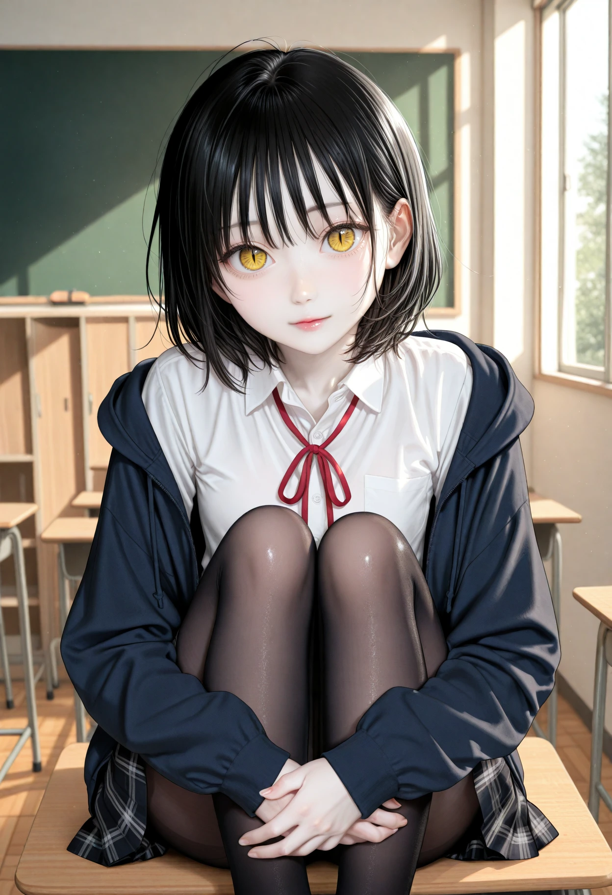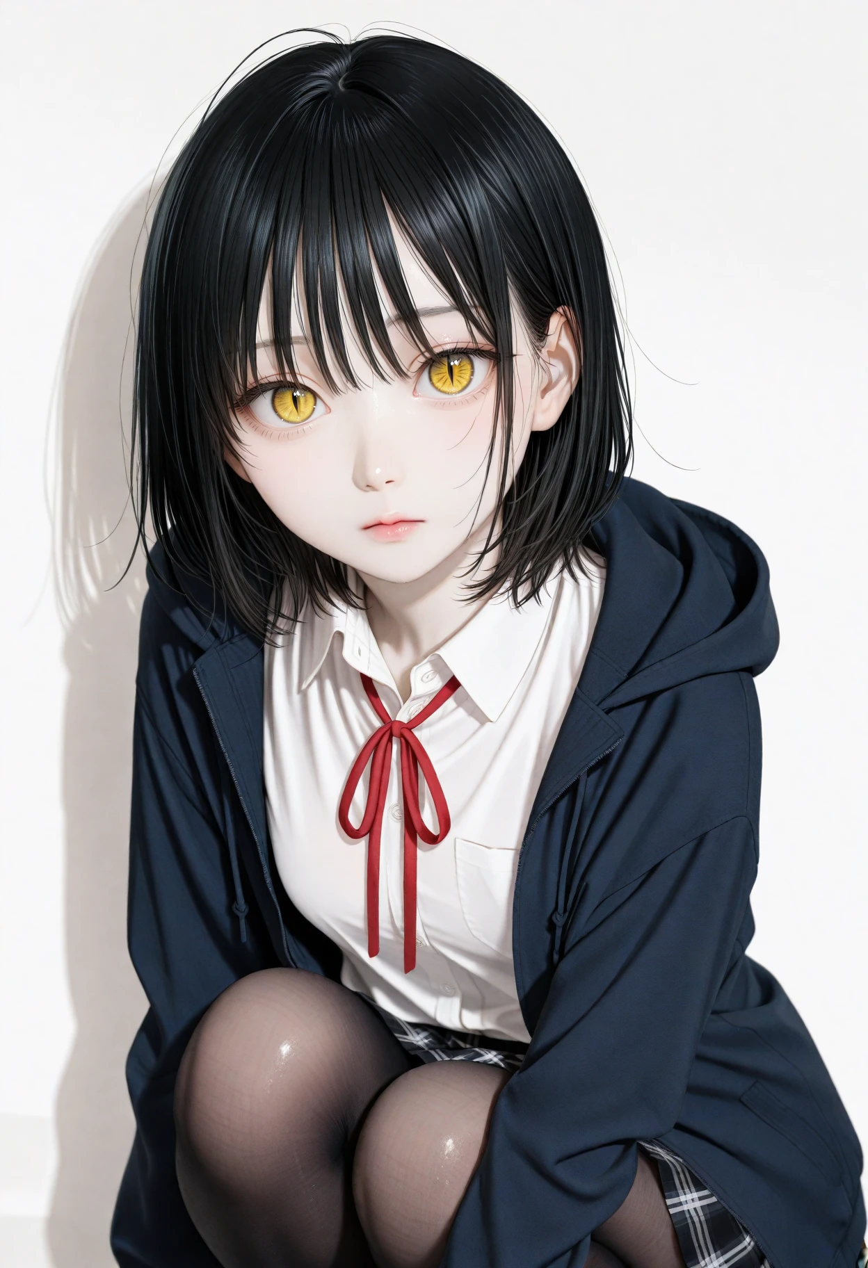 nekozane-mugi, black hair, short hair, yellow eyes, school uniform, red ribbon, white shirt, collared shirt, hooded track jacket, black pantyhose, black skirt, pleated skirt, expressionless, slit pupilsIt's suggested to lower down the lora weight when you generate realistic pictures.