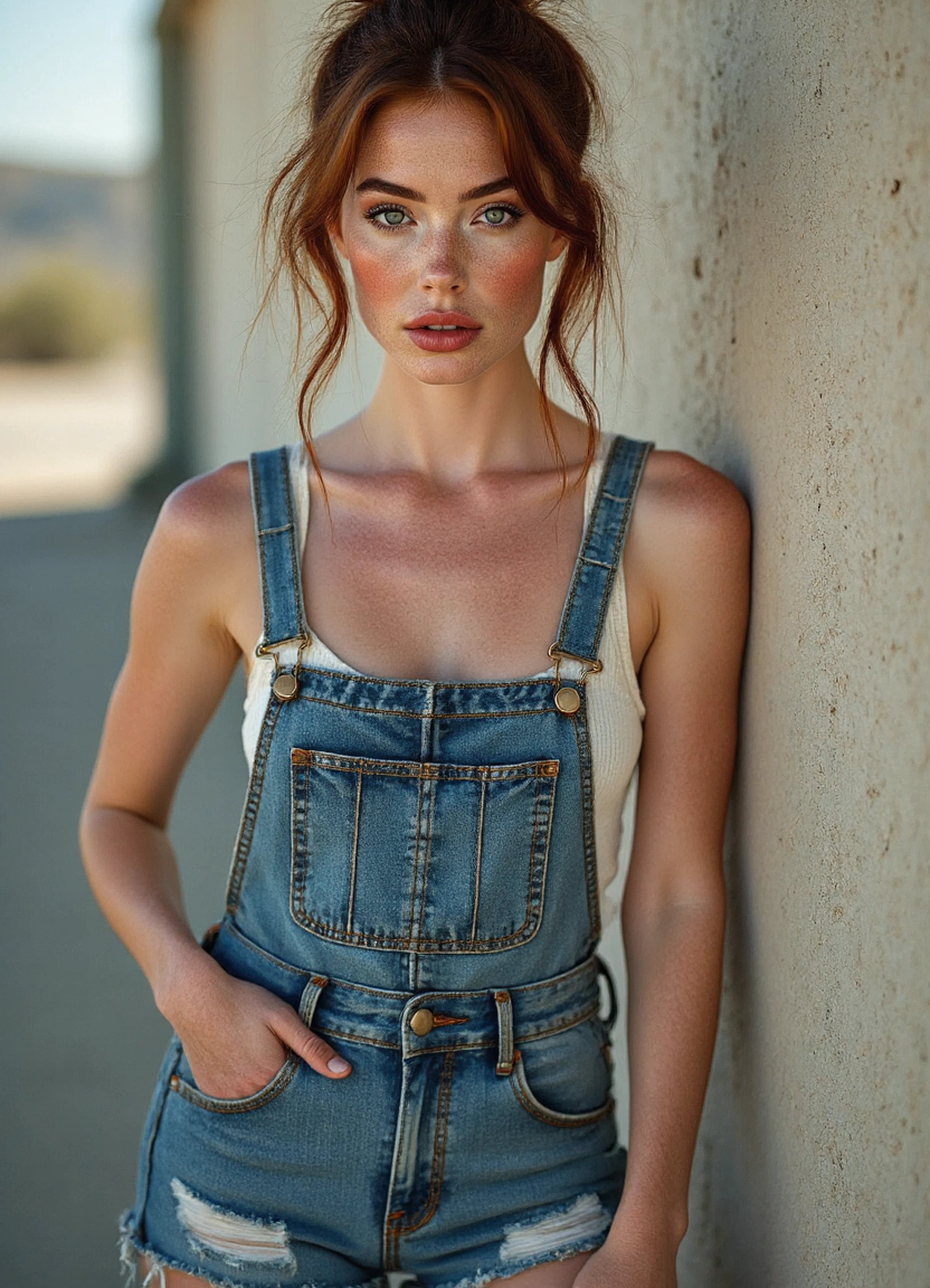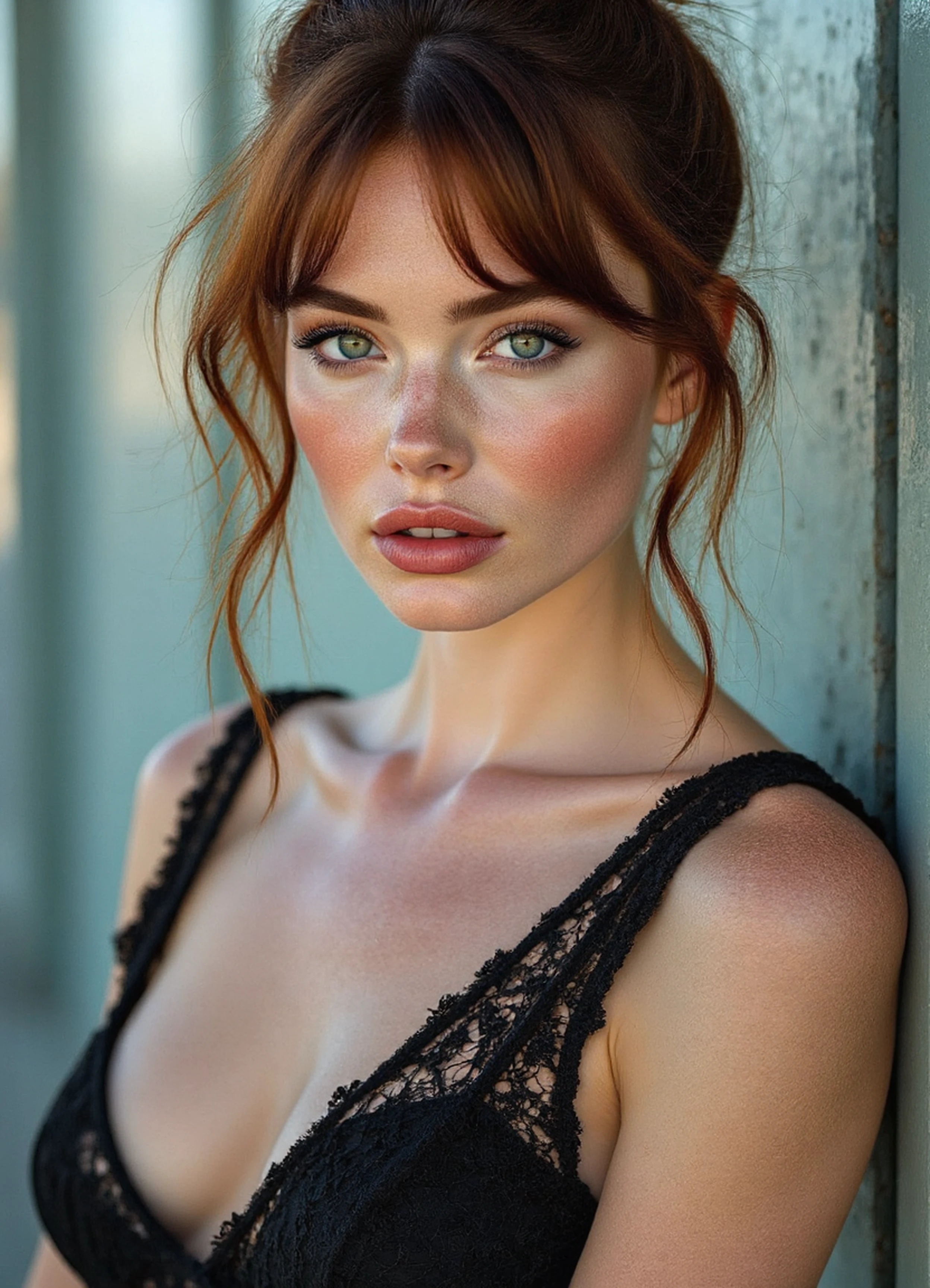 a beautiful english female, auburn hair in a messy bun style with 2 strands hanging down the front of her face, greeen striking eyes, toned body, medium chest, freckles on her skin, pale skin, { Looking at Viewer (Direct Gaze) | Side View (Profile) | Looking Away from Viewer | Three-Quarter View (Shoulder | Turned Slightly) | Over-the-Shoulder View | Candid (Not Posing Directly at the Camera)