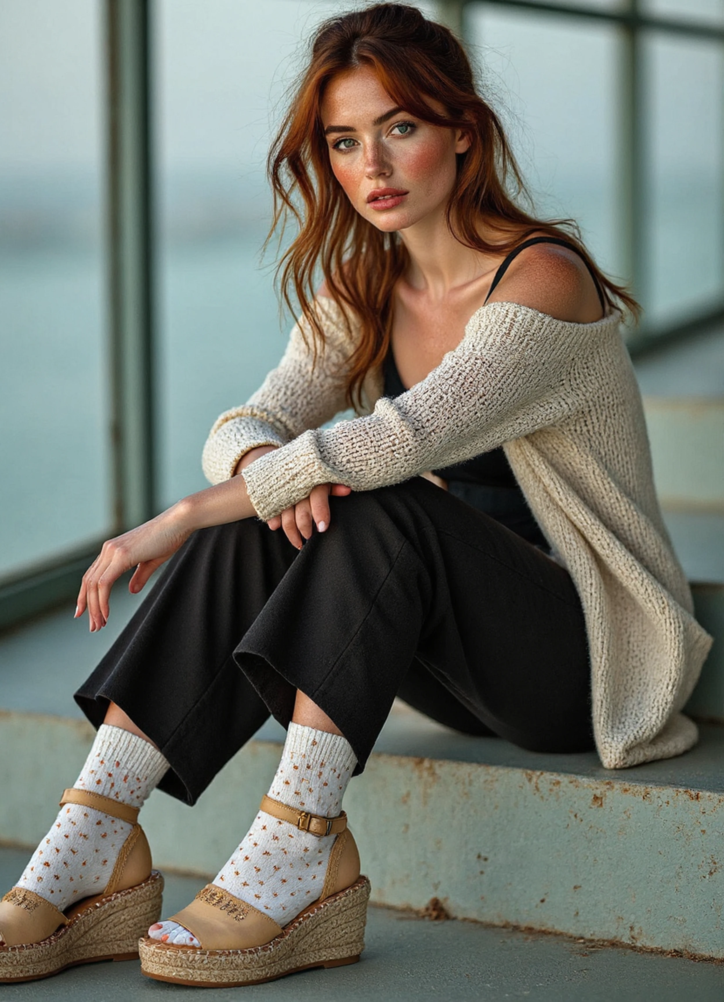 Close-Up (Focus Primarily on Facial Features) | Medium Shot (Includes Shoulders and Upper Chest) | Full Headshot (From Just Below the Shoulders Up) | Environmental Portrait (Subject in Their Natural Surroundings) }, her outfit compliments The background allows the viewer to focus on eye-catching fashion, Captured with a Sony A7R IV camera and a 50mm f/1.2 G Master lens for a beautiful editorial shoot, this composition highlights a fashion-forward aesthetic. Inspired by avant-garde fashion photography from Sølve Sundsbø, this image blends contemporary fashion and elegance, high-fashion vision, evoking a sense of glamorous nostalgia. The camera angle rdigitalartist-wildcards/camera-perspective, paired with a medium format film camera to enhance the intimate and timeless quality. In the style of Sally Mann.
