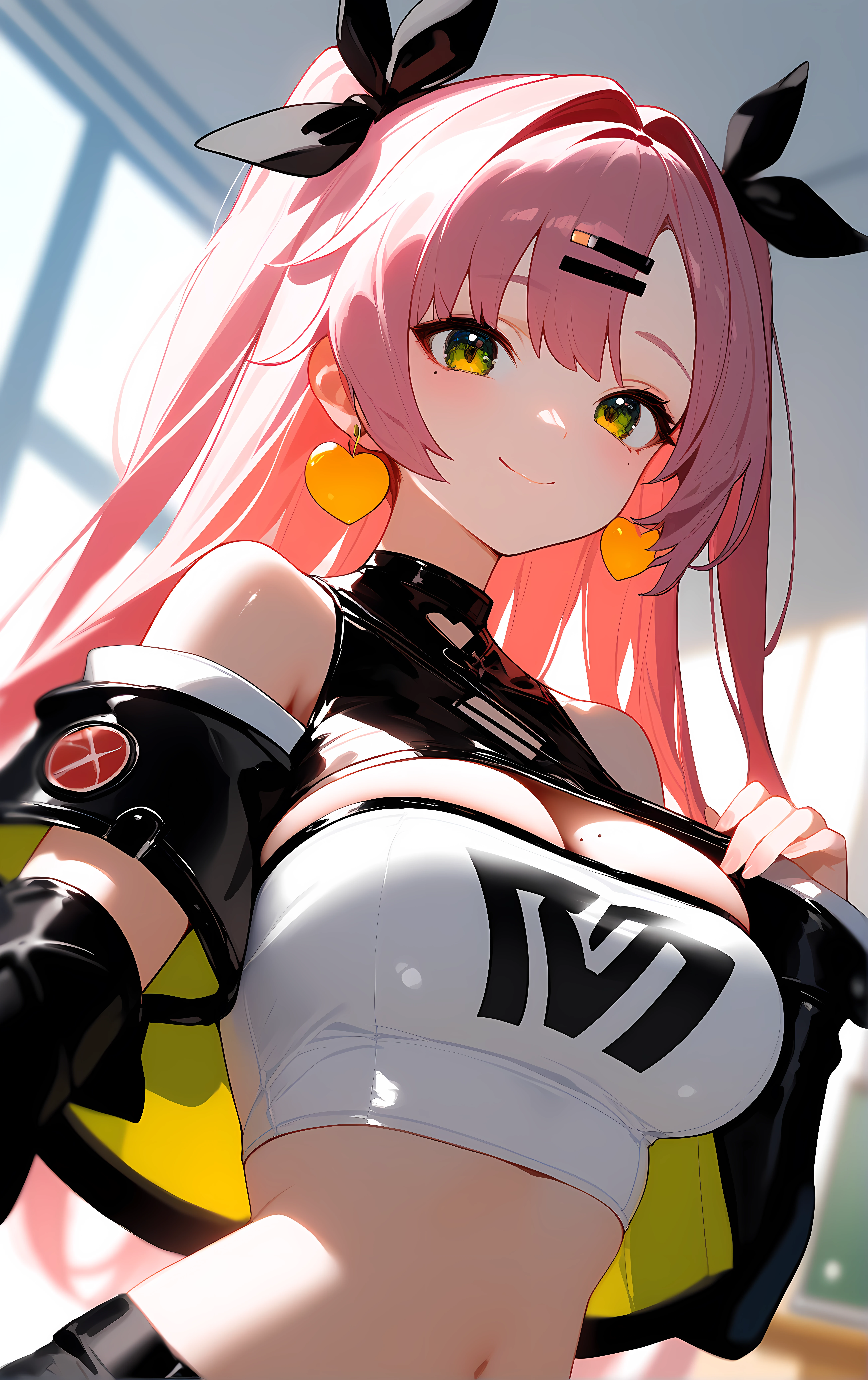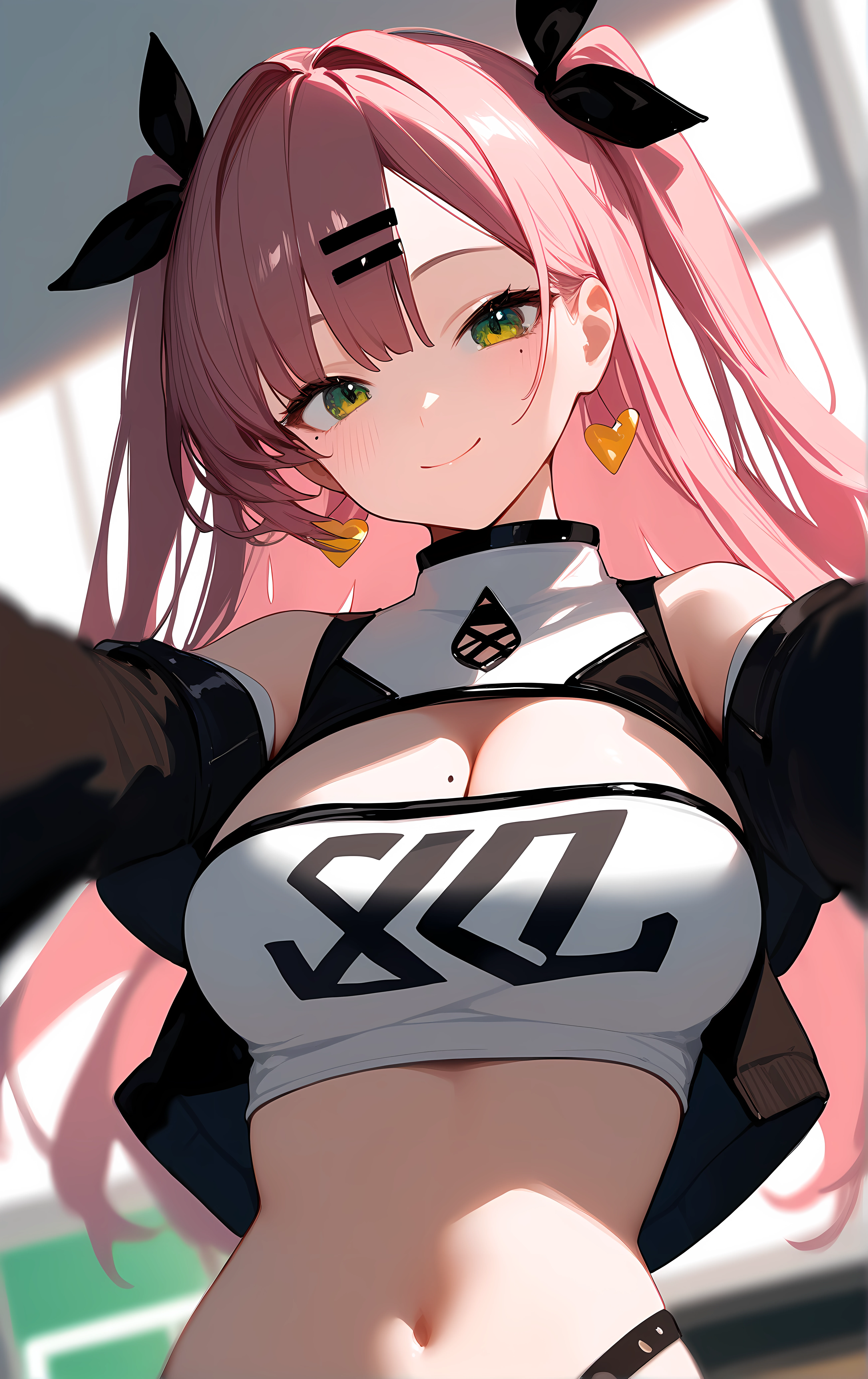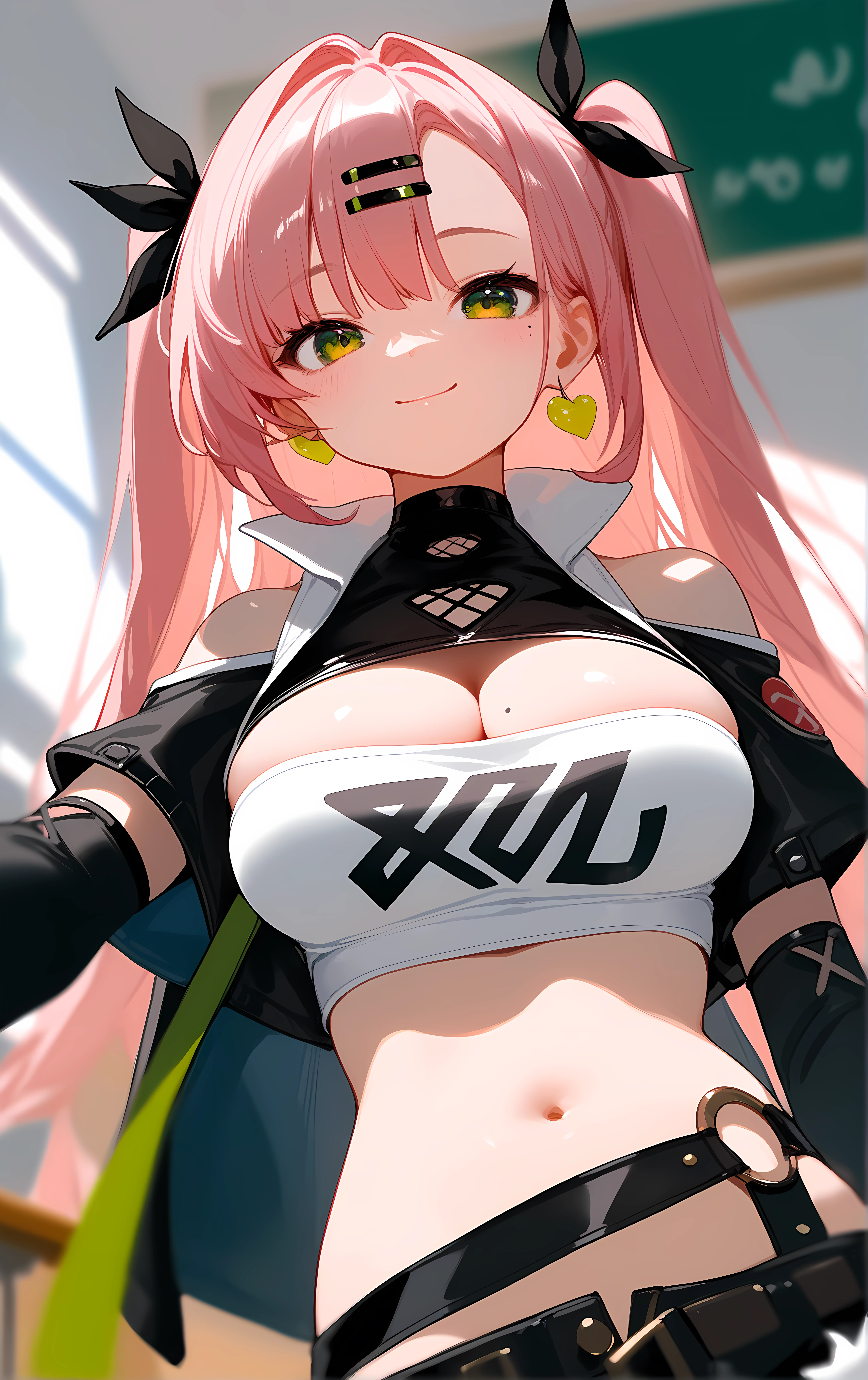 nicole, 1girl, breasts, solo, large_breasts, pink_hair, green_eyes, shorts, long_hair, crop_top, midriff, tube_top, black_shorts, strapless, navel, cleavage, bare_shoulders, stomach, two_side_up, black_ribbon, hairclip, hair_ribbon, ribbon, hair_ornament, short_shorts, very_long_hair, thighs, cutoffs, micro_shorts, shoulder_cutout, long_sleeves, mole, jacket, thigh_strap, black_jacket, open_clothes, clothing_cutout, detached_sleeves, mole_under_eye, black_thighhighs, thighhighs,