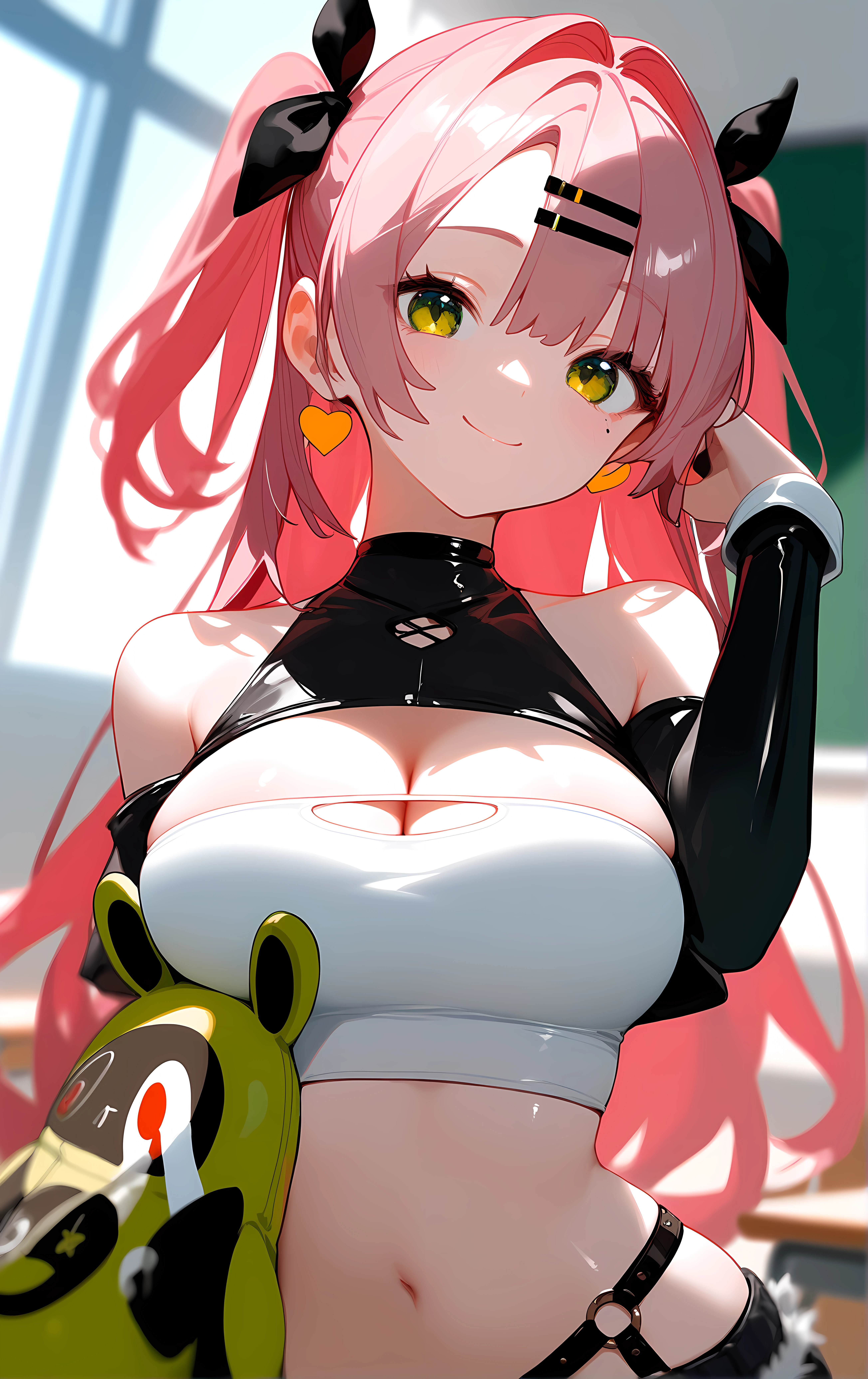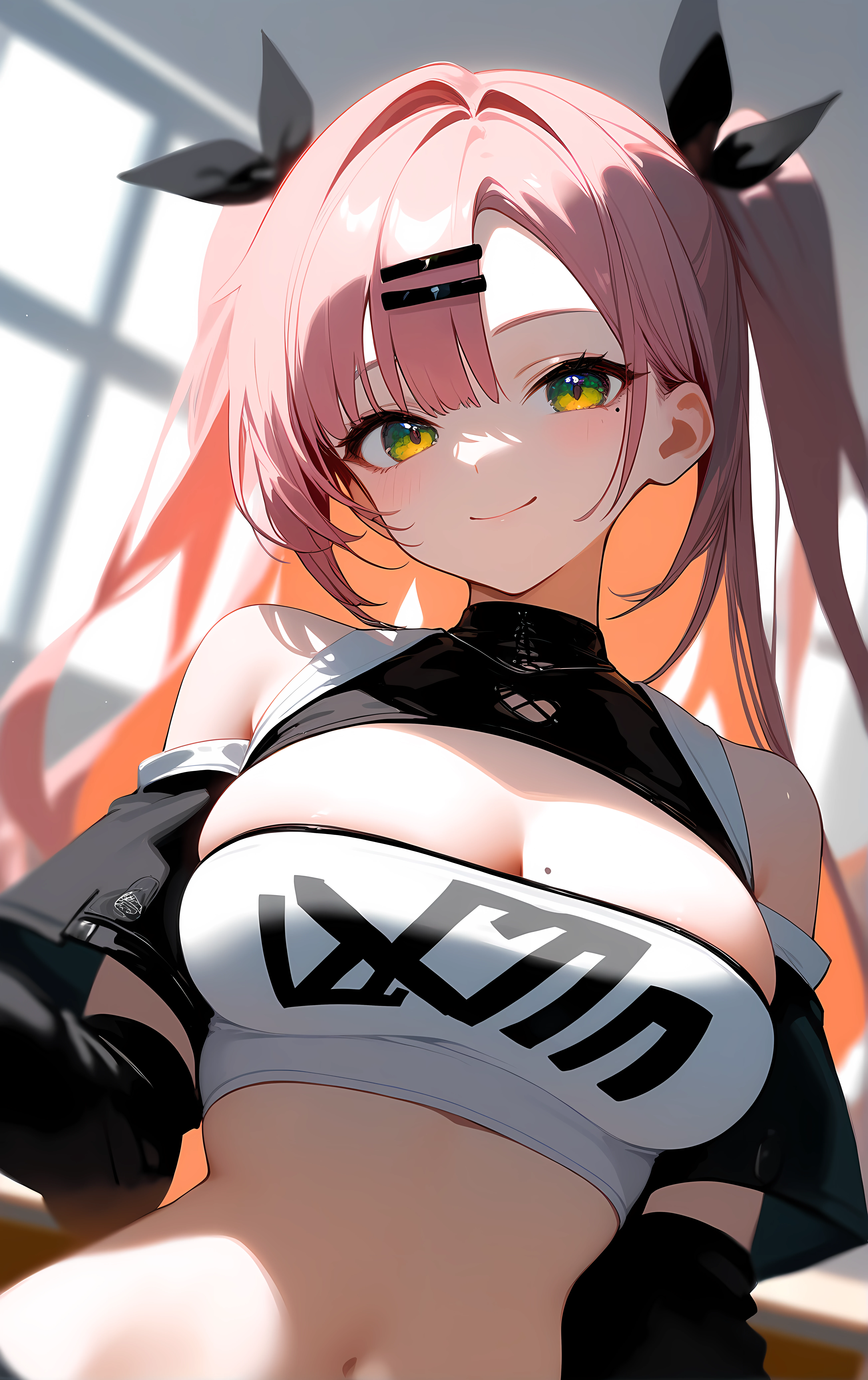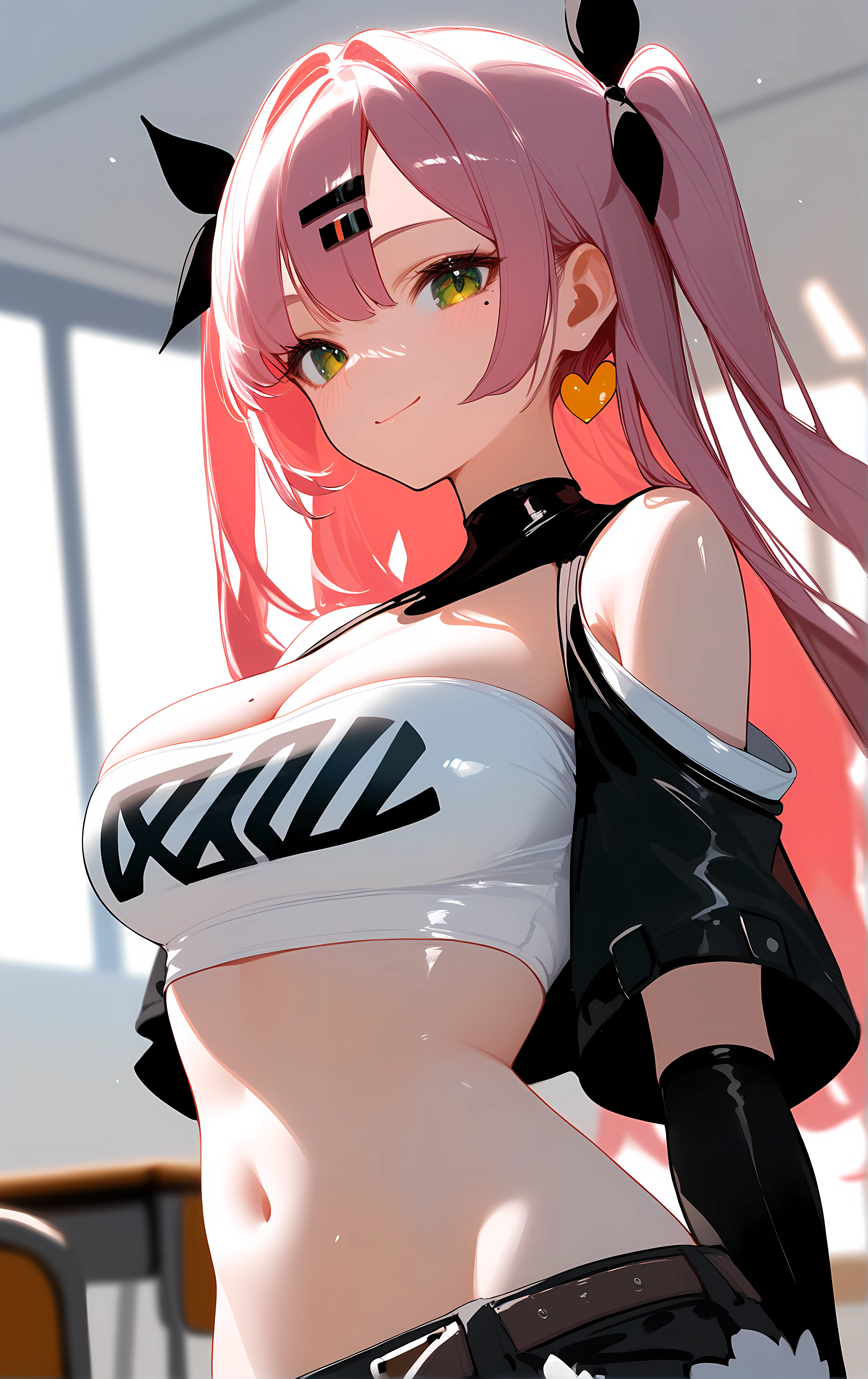 nicole, 1girl, breasts, solo, large_breasts, pink_hair, green_eyes, shorts, long_hair, crop_top, midriff, tube_top, black_shorts, strapless, navel, cleavage, bare_shoulders, stomach, two_side_up, black_ribbon, hairclip, hair_ribbon, ribbon, hair_ornament, short_shorts, very_long_hair, thighs, cutoffs, micro_shorts, shoulder_cutout, long_sleeves, mole, jacket, thigh_strap, black_jacket, open_clothes, clothing_cutout, detached_sleeves, mole_under_eye, black_thighhighs, thighhighs,