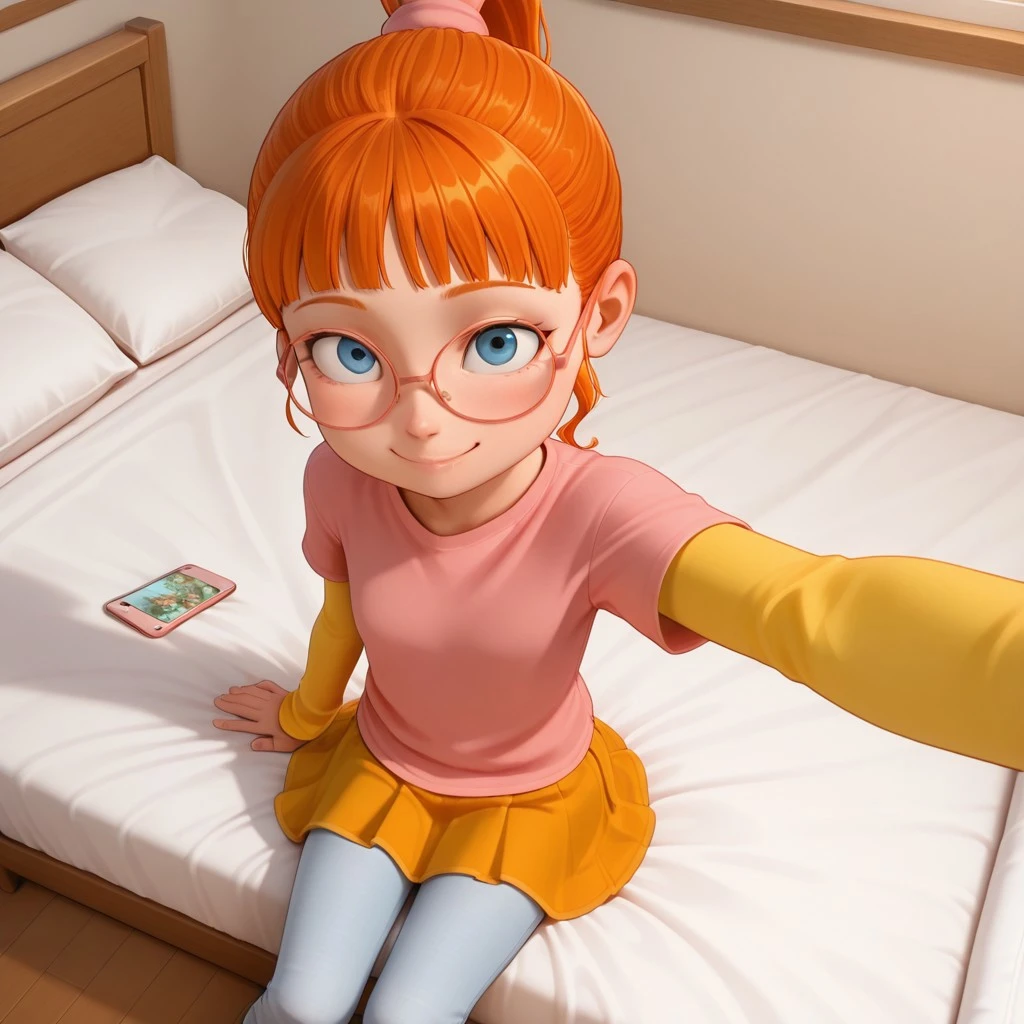 bri_vam, orange hair, ponytail, glasses, blue eyes, shirt, layered sleeves, skirt, pants