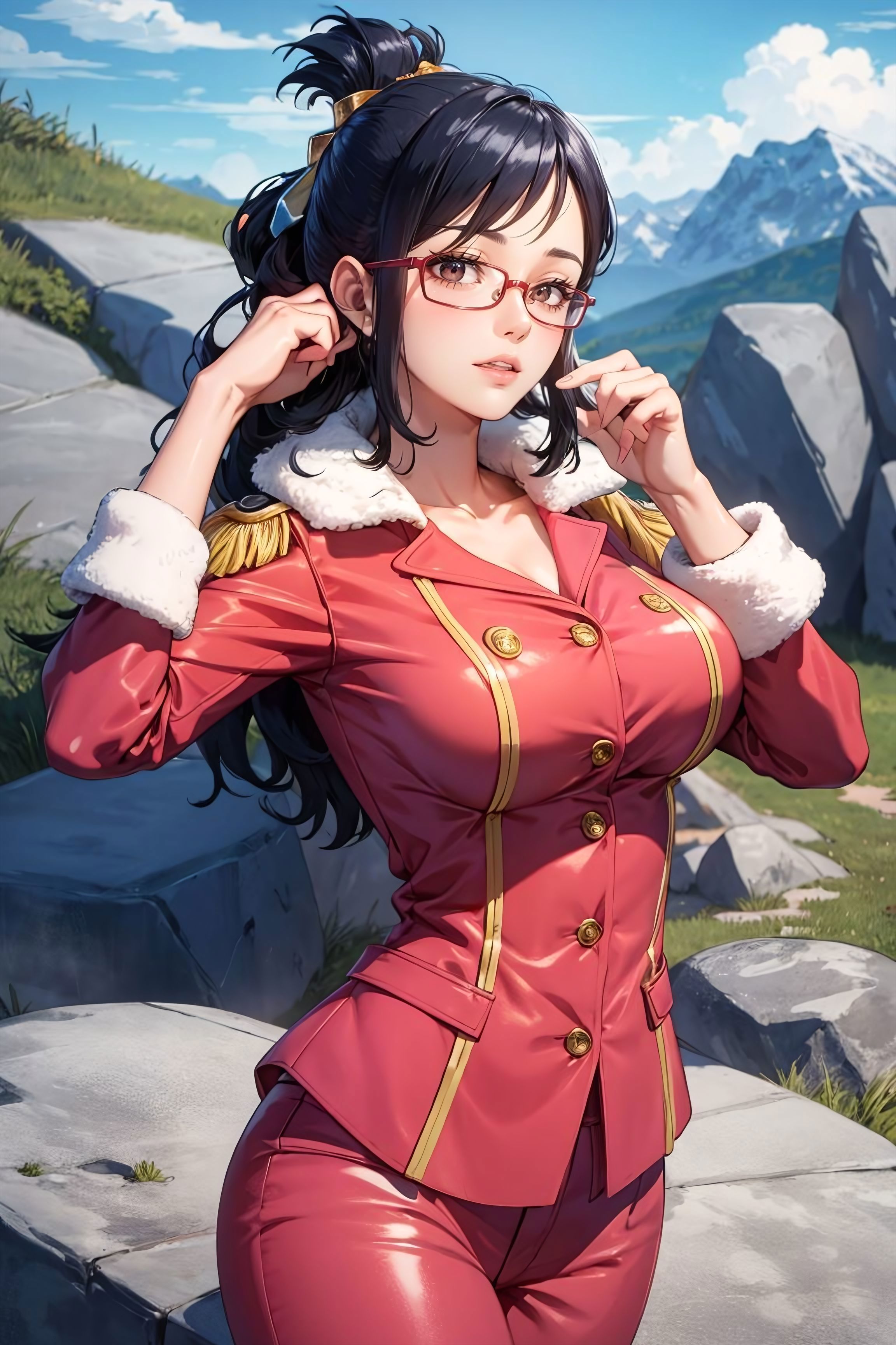tashigi, black hair, bangs, red-framed eyewear, pink military uniform, fur trim