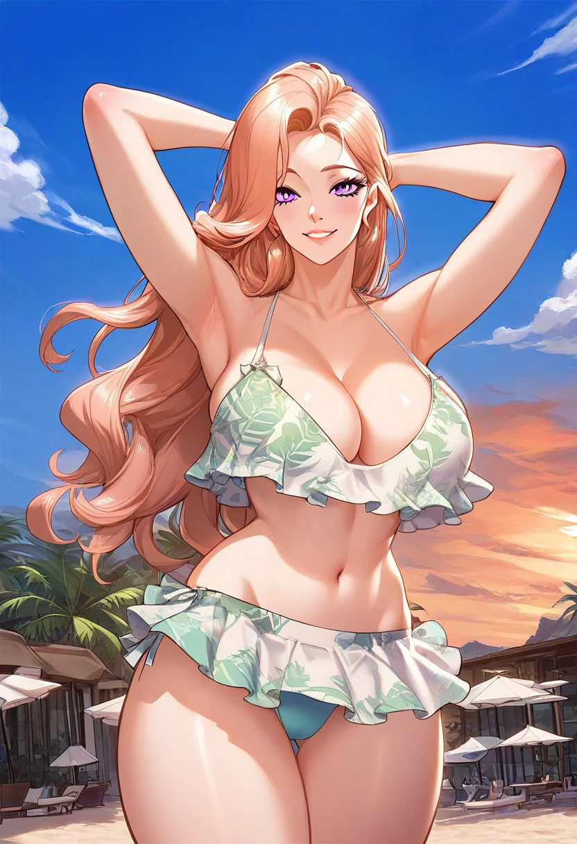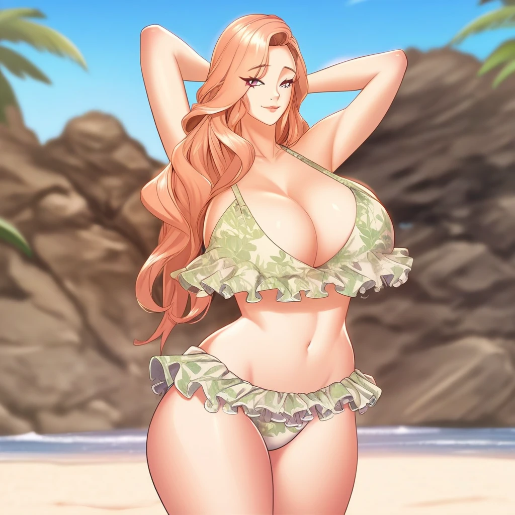 23. ((cute frilled bikini top with green floral print, obscene cleavage, huge cleavage, cute frilled skirt bikini with green floral print, sexy white bottom, ))