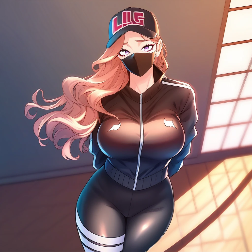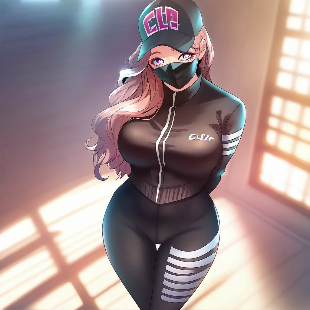 5. ((zipped shiny black warm up jacket with white banded print, shiny black yoga pants with white banded print, black baseball cap with pink "CAP" print, black face mask, )) white sport shoes,