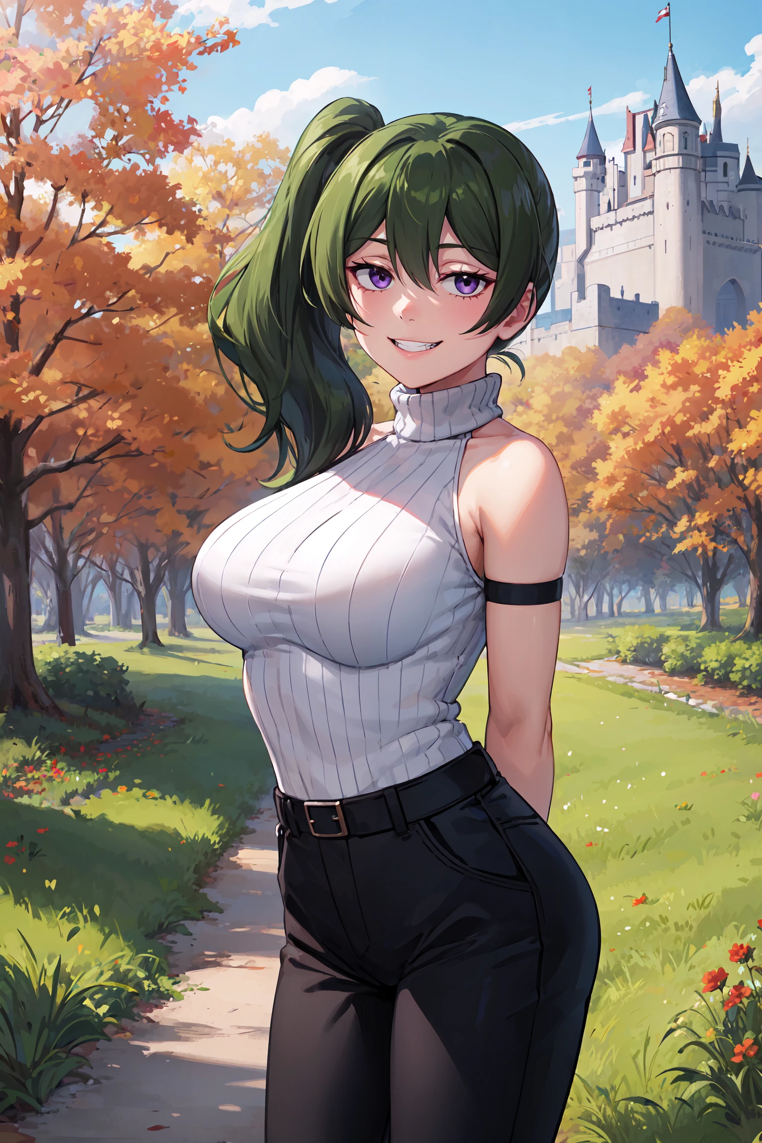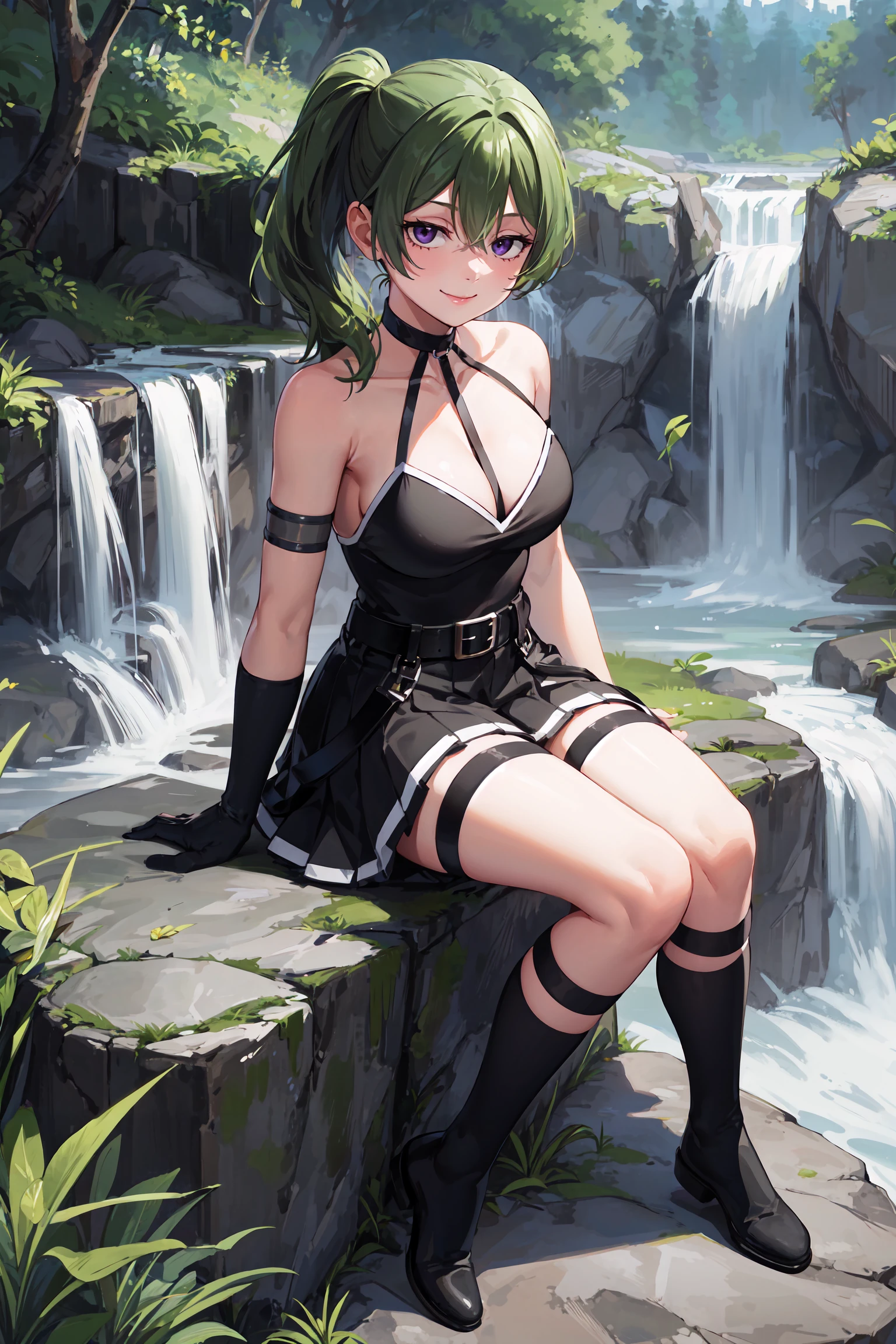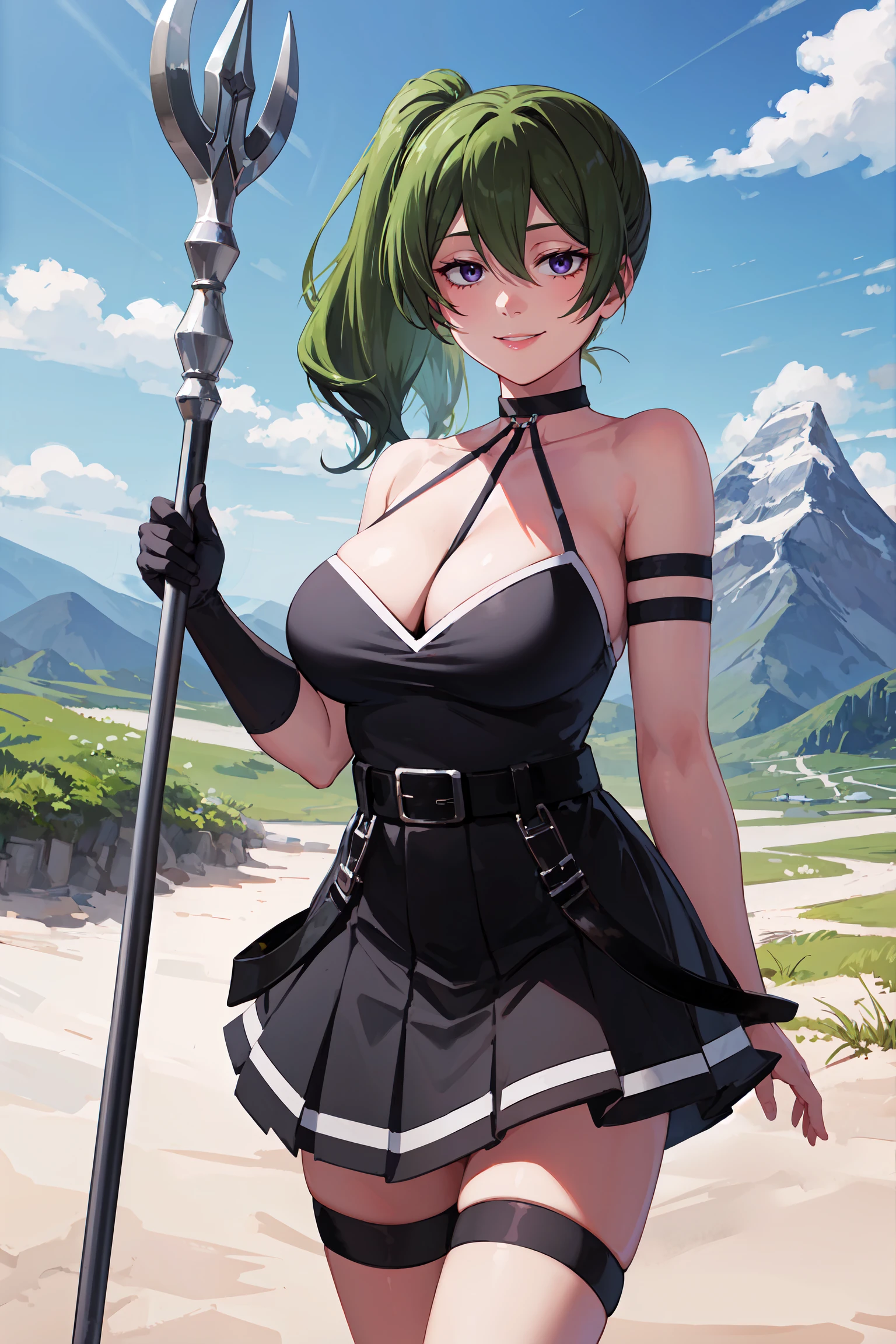 black dress, cleavage, belt, arm strap, single elbow glove, thigh strap