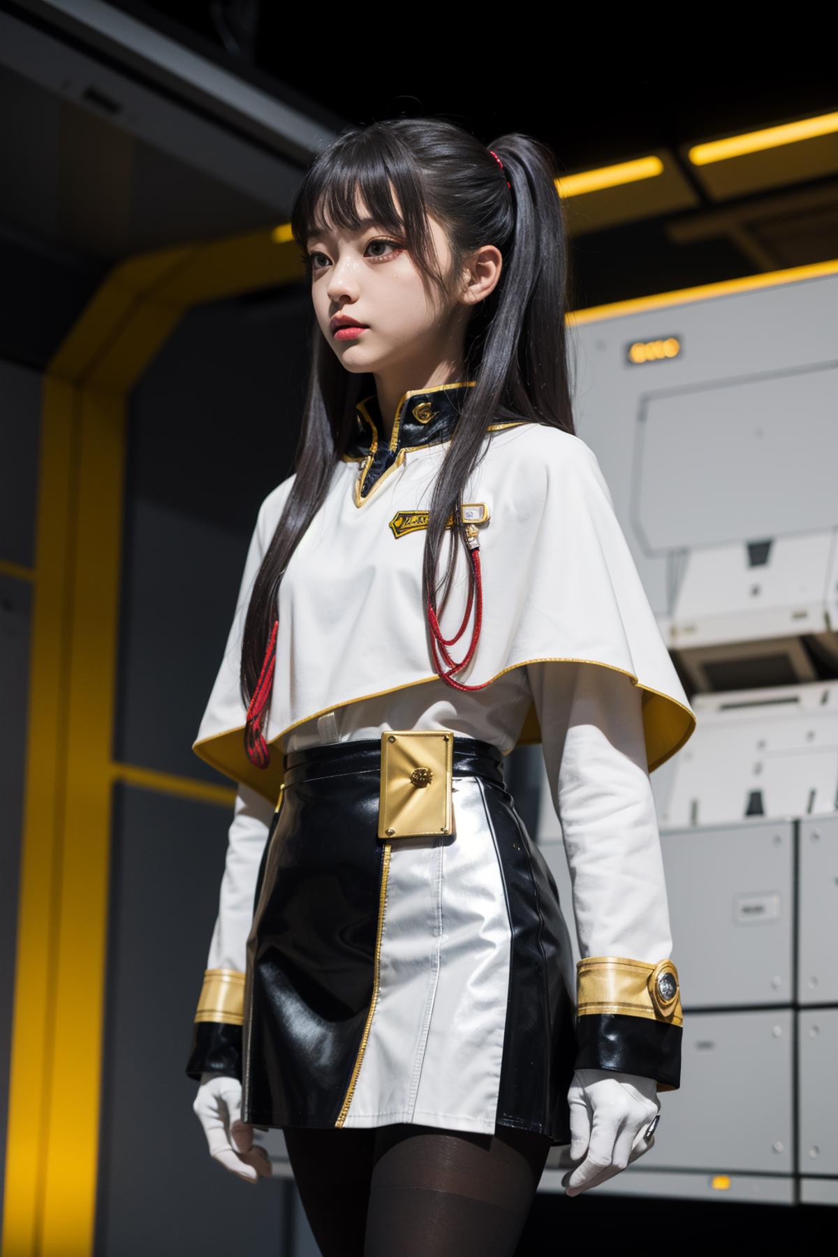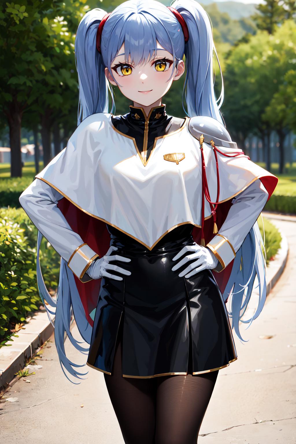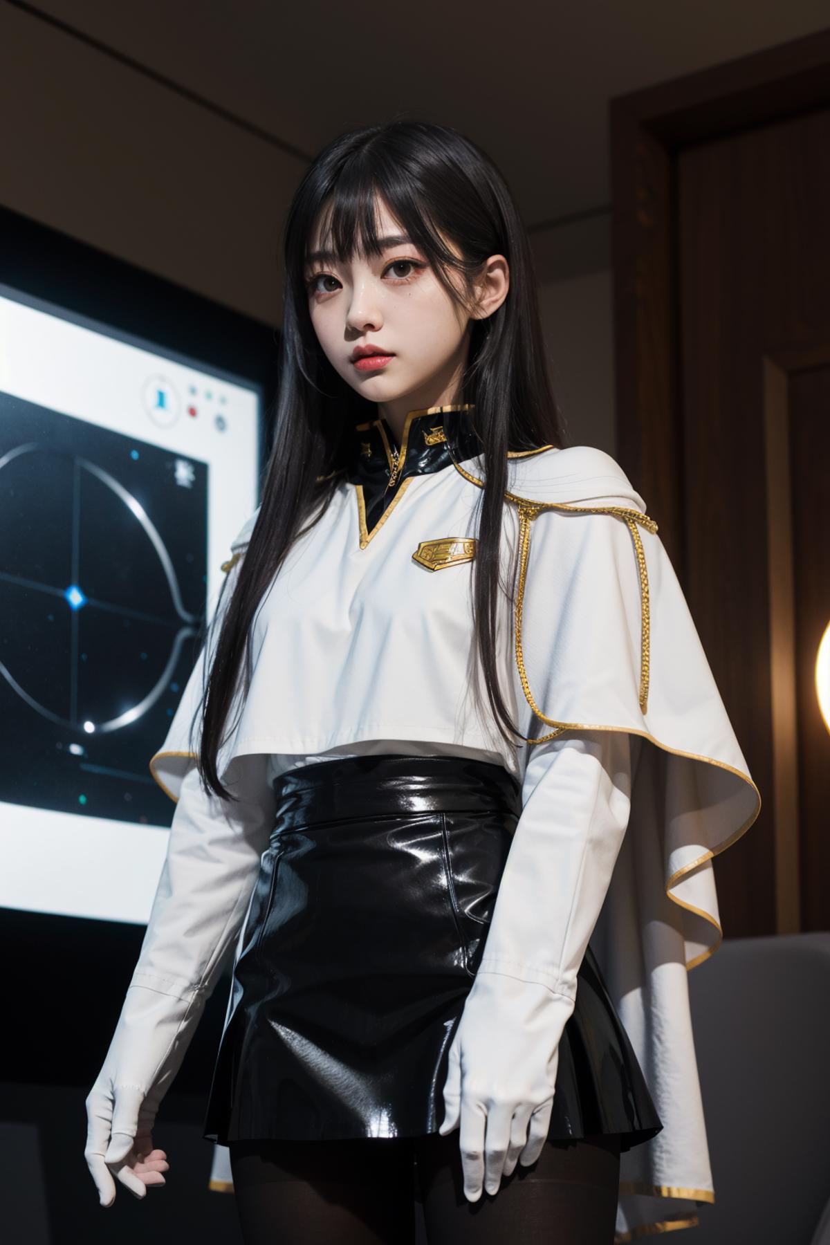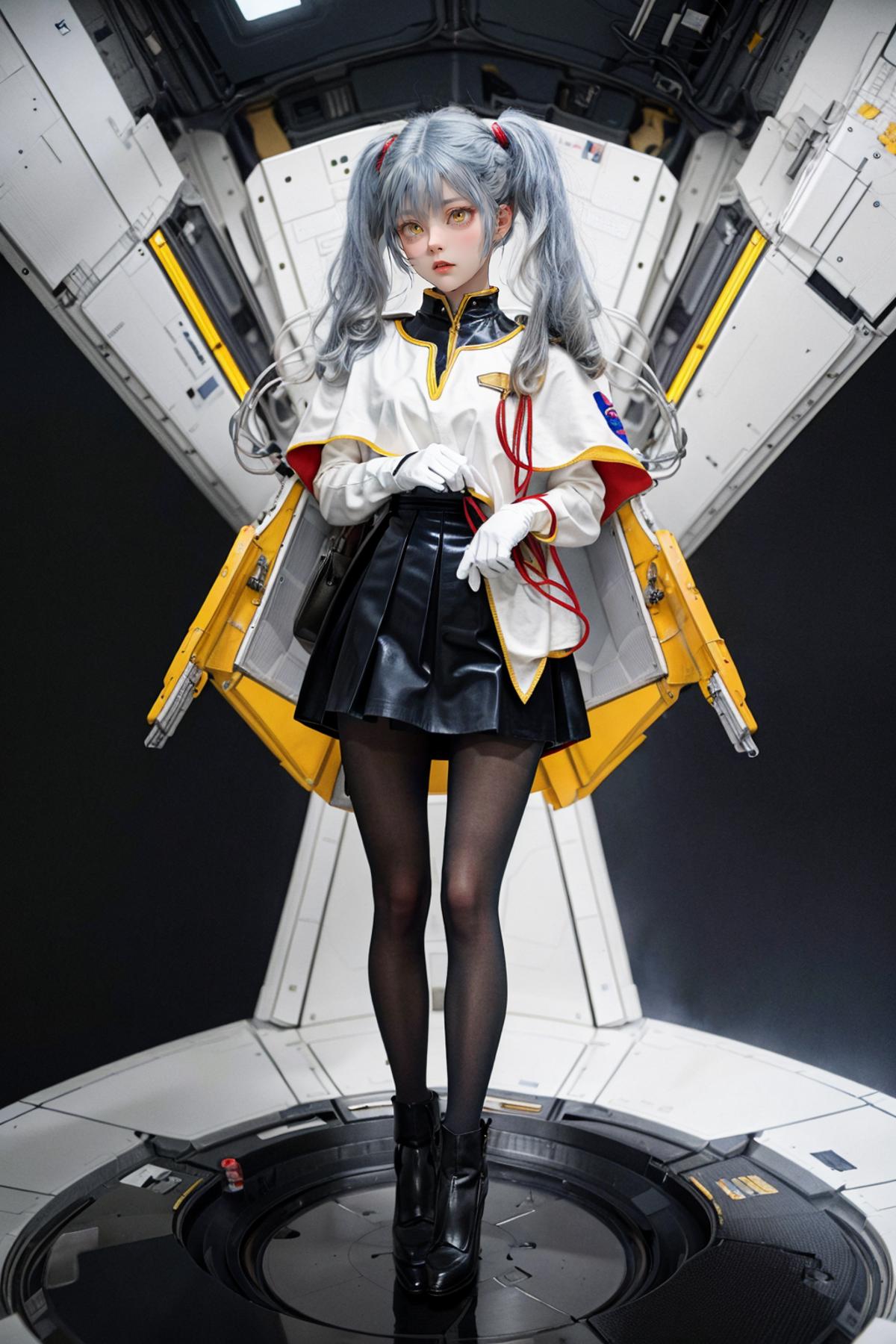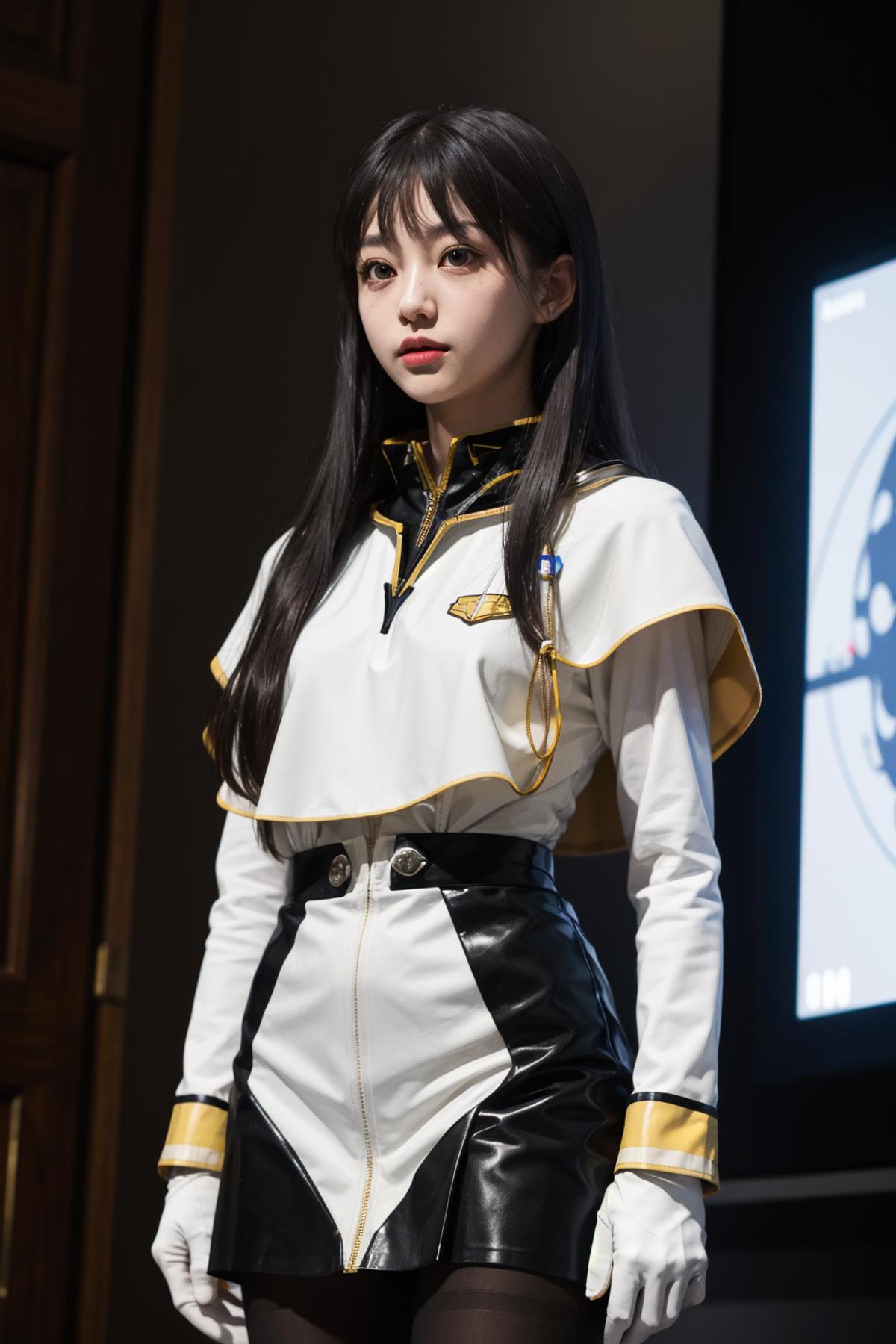 outfit2bbruri, long hair, yellow eyes, white capelet, long sleeves, white gloves, black skirt, pantyhose