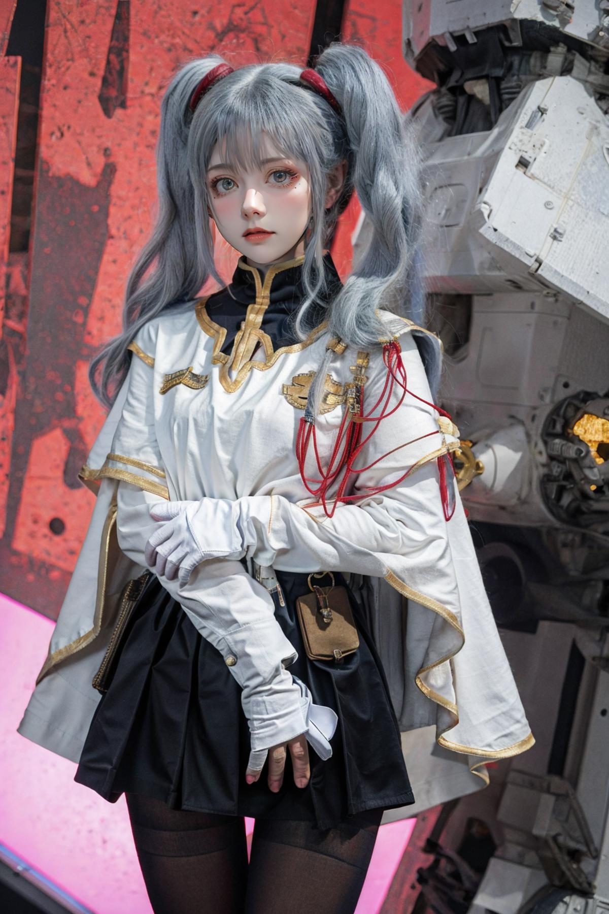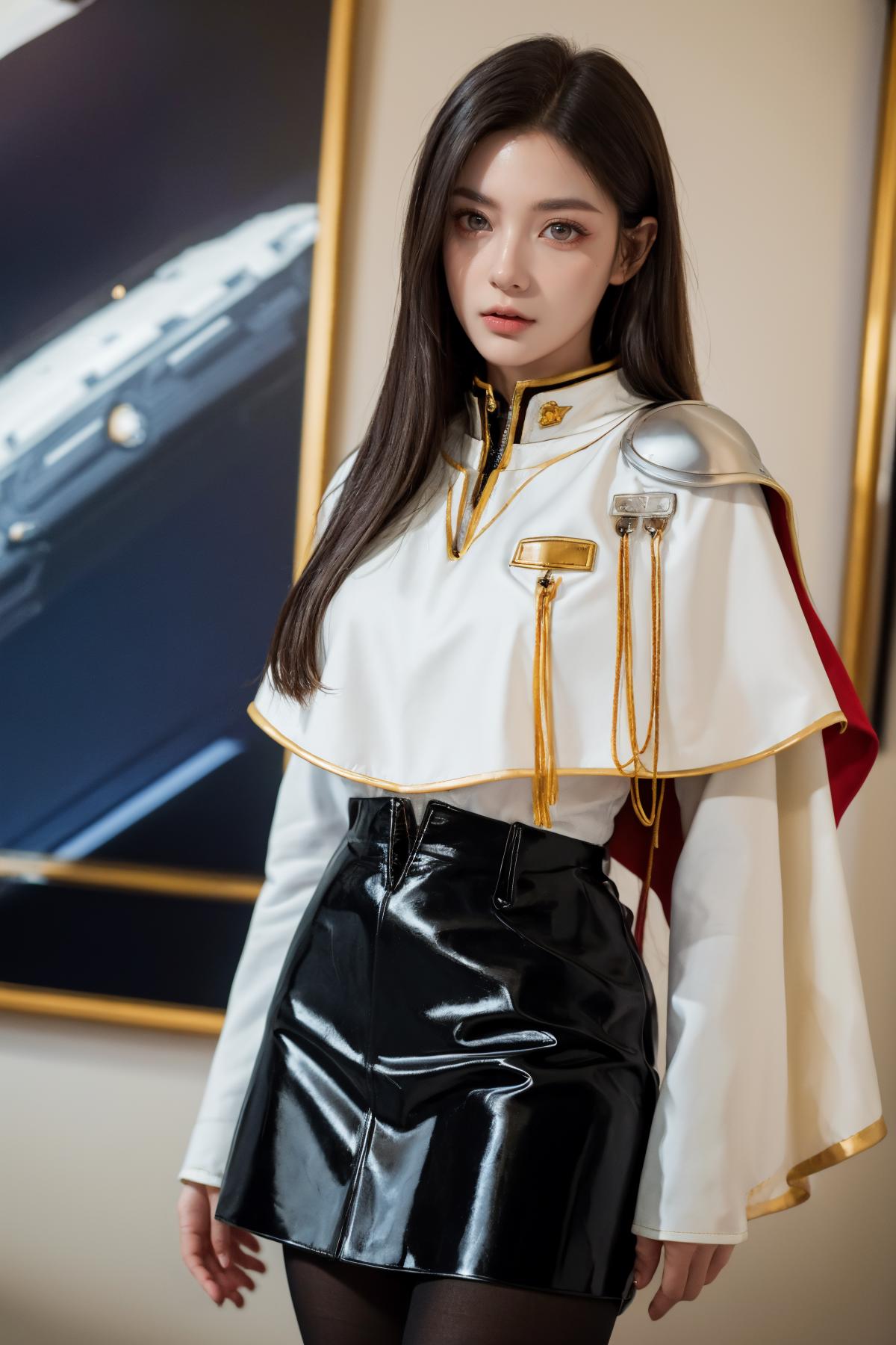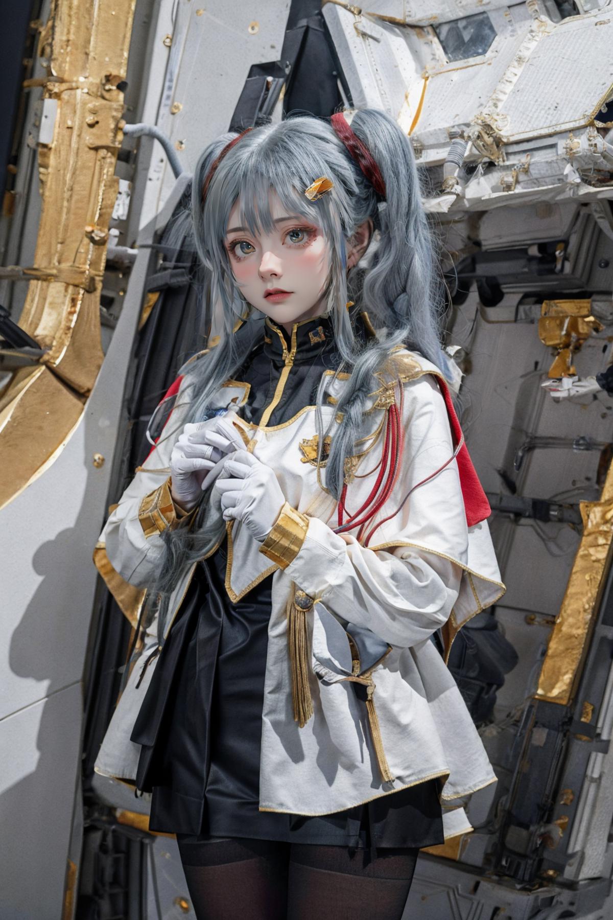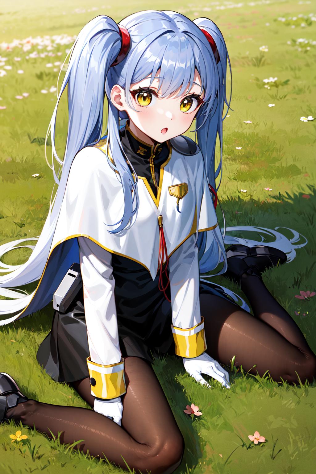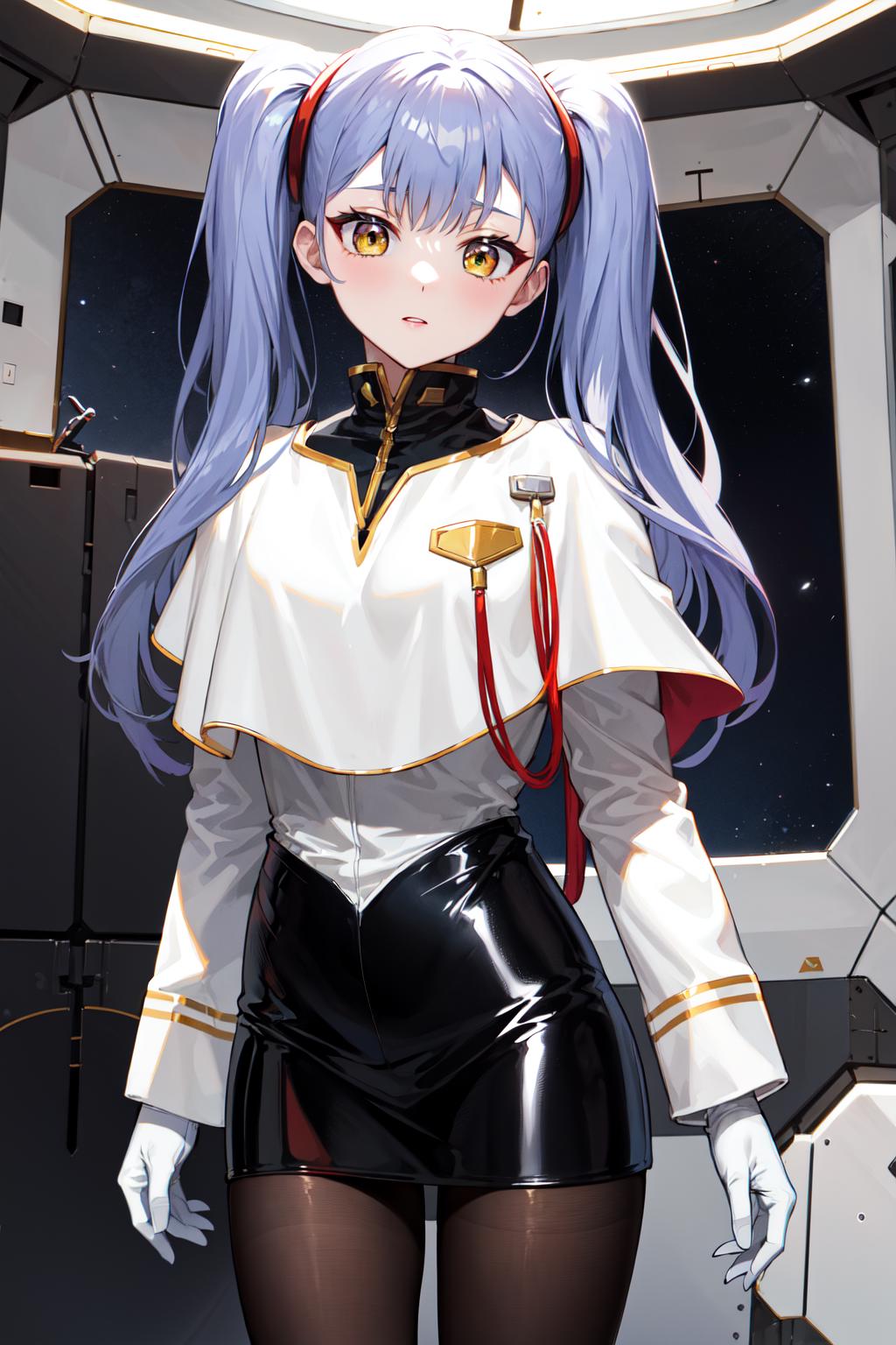 outfit2bbruri, long hair, yellow eyes, white capelet, long sleeves, white gloves, black skirt, pantyhose