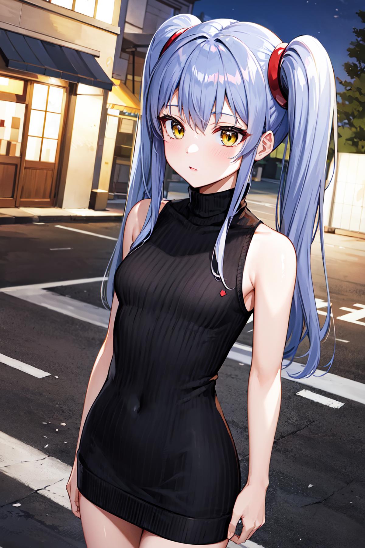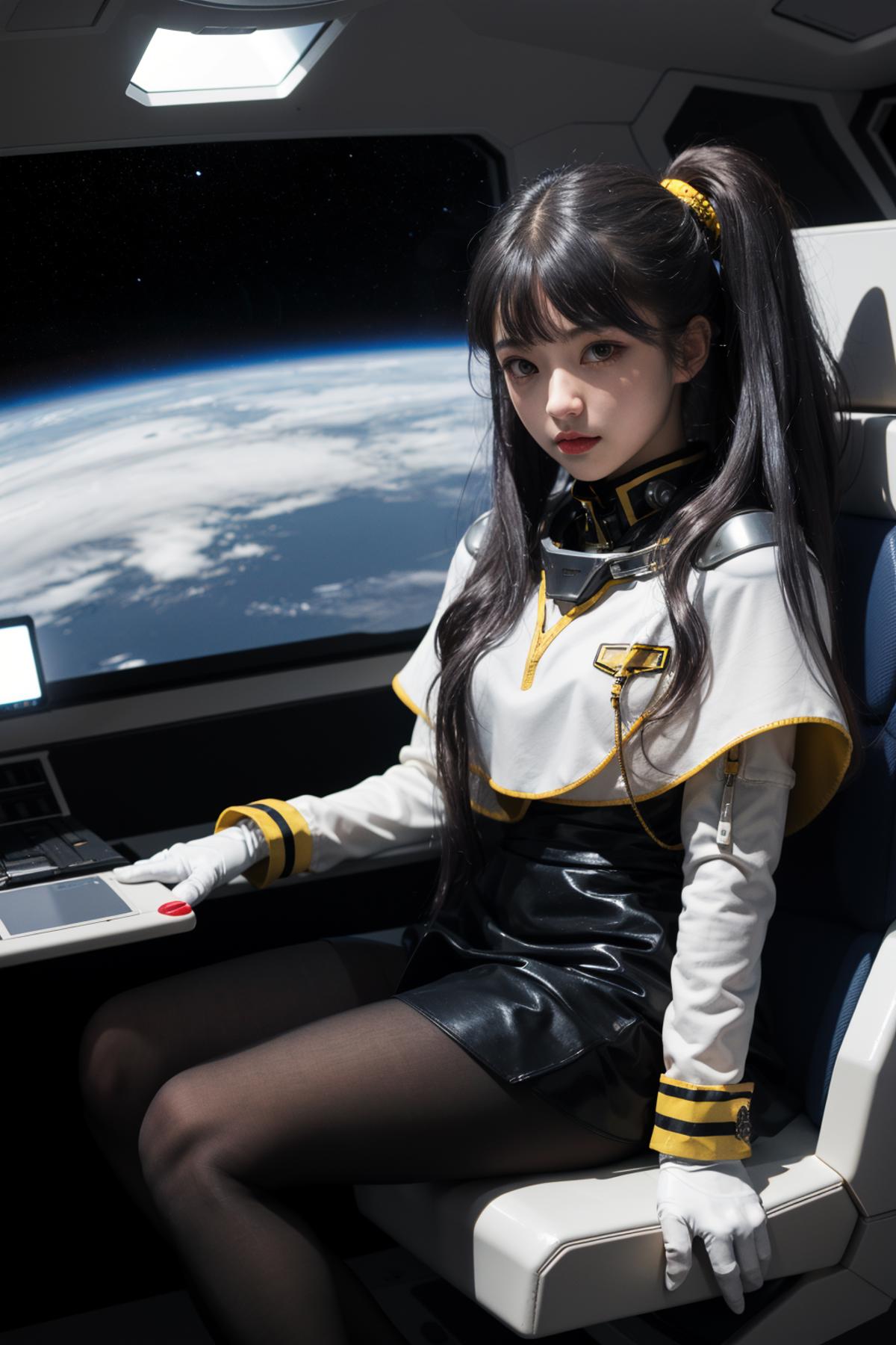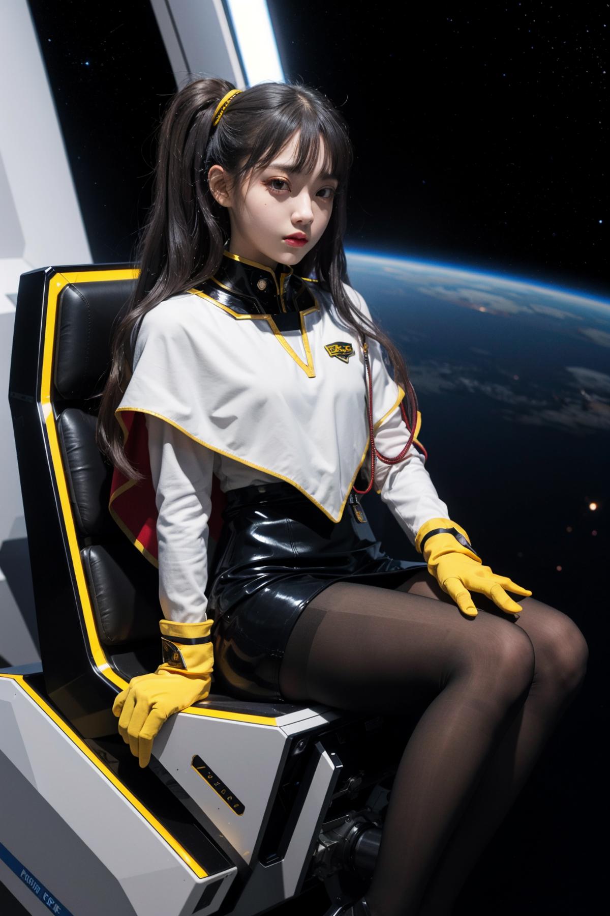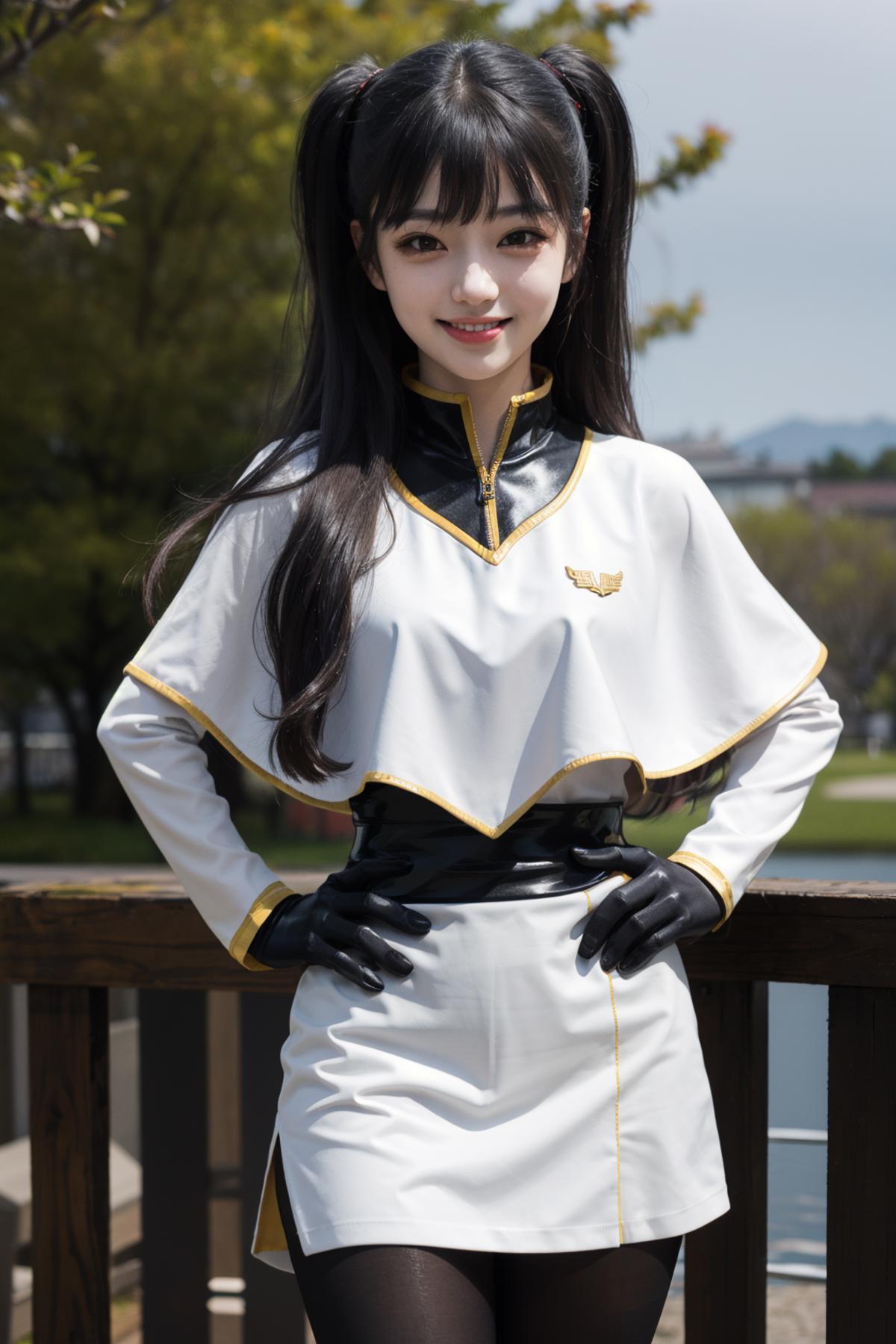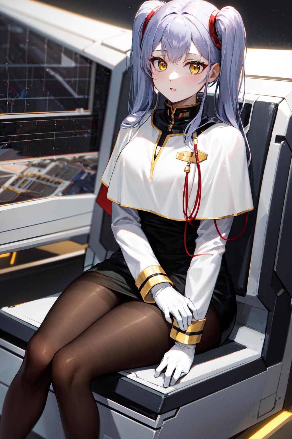 outfit2bbruri, long hair, yellow eyes, white capelet, long sleeves, white gloves, black skirt, pantyhose