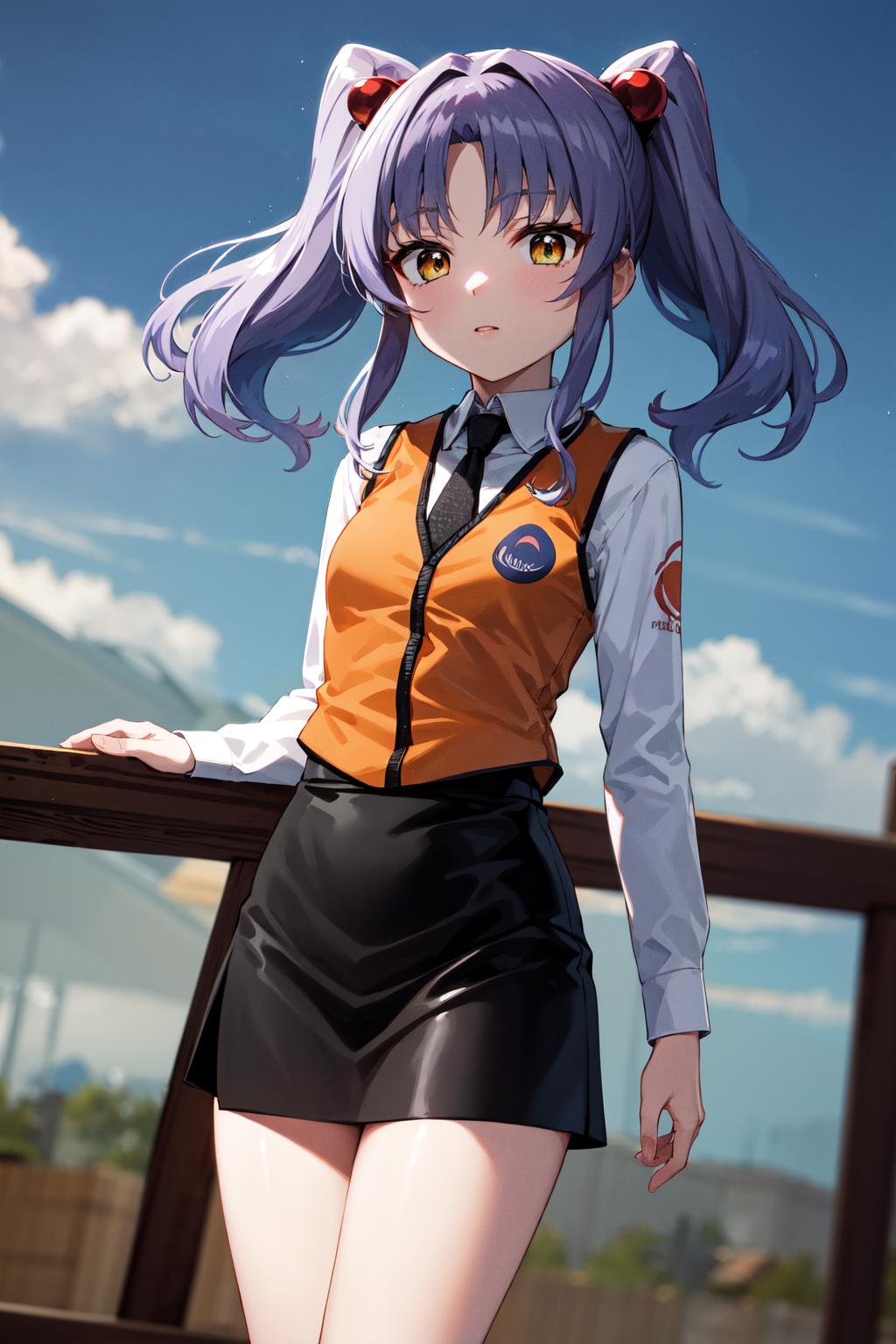 outfit1aaruri, black necktie, orange vest, long sleeves, black skirt