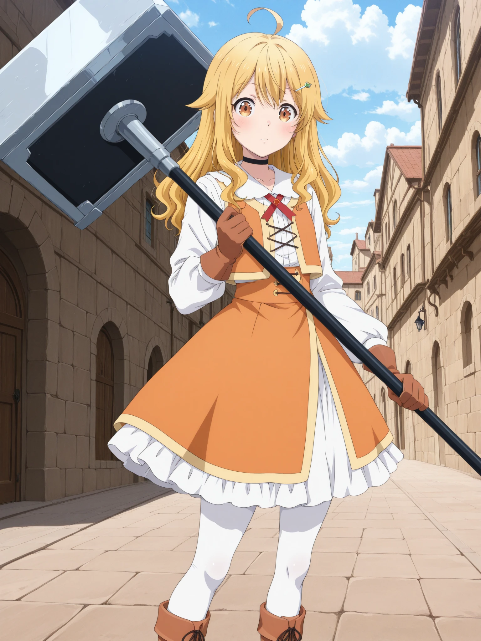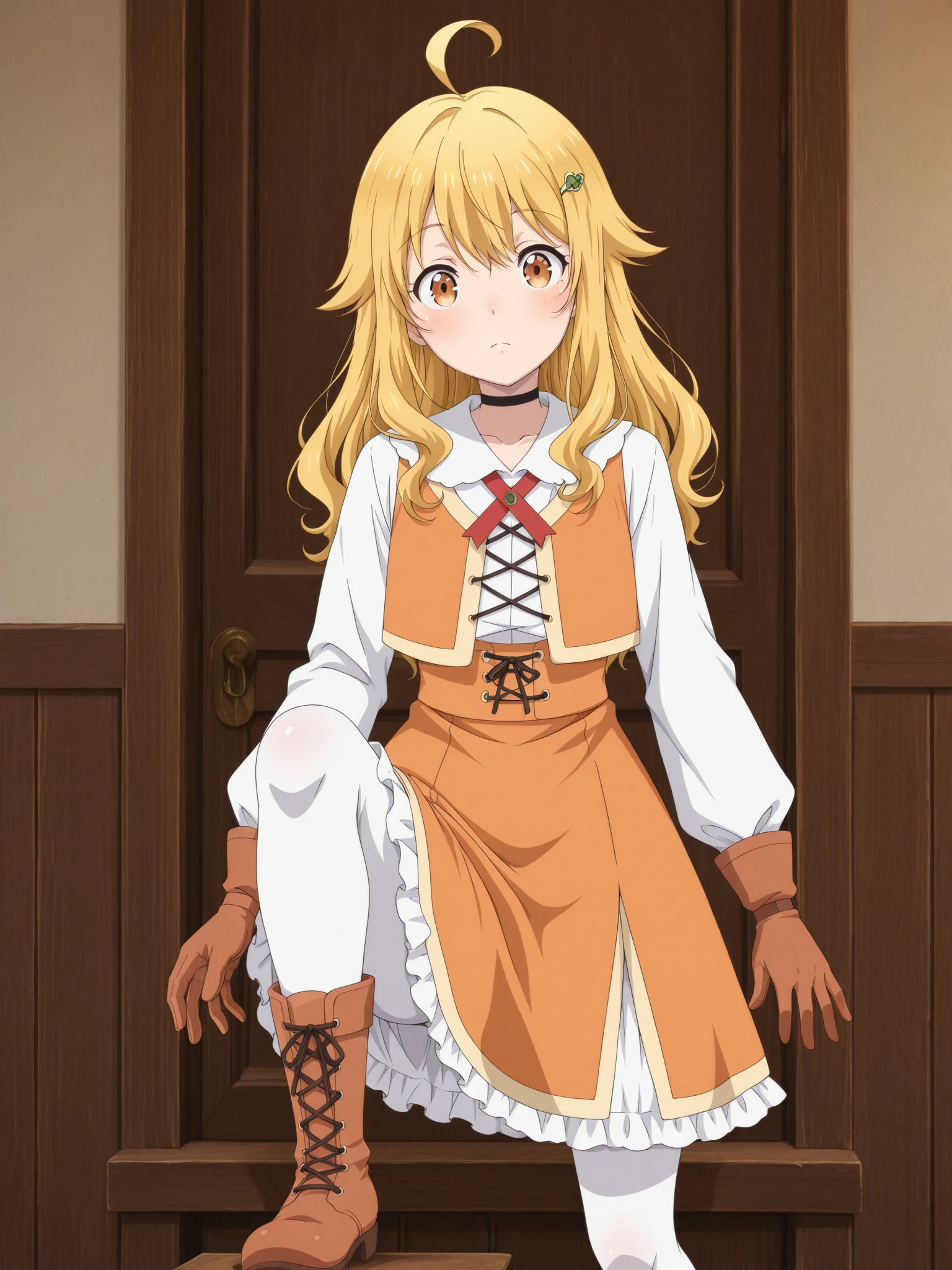 Character: (EmilyUnique, brown eyes, blonde hair, long hair, ahoge, hairclip)