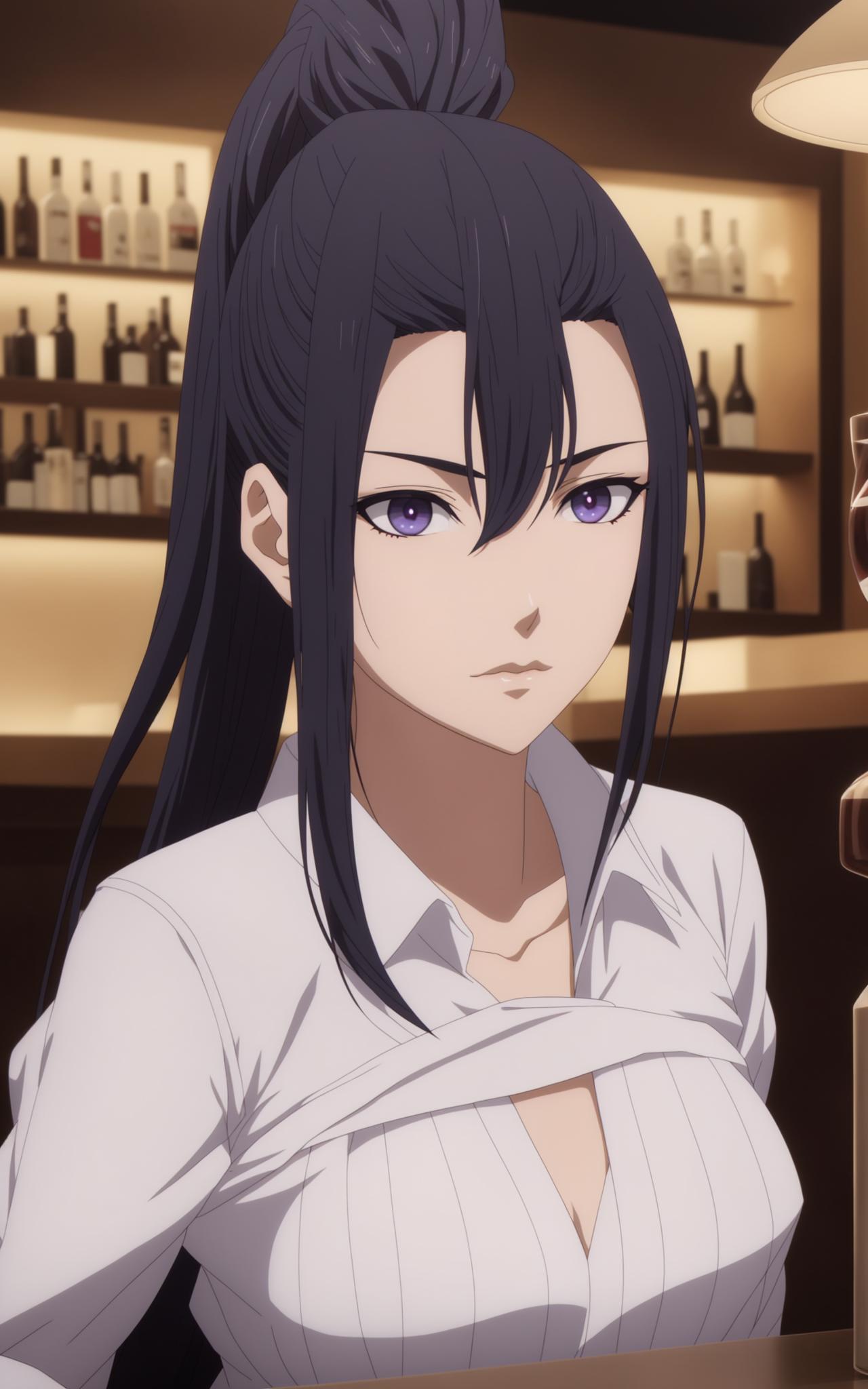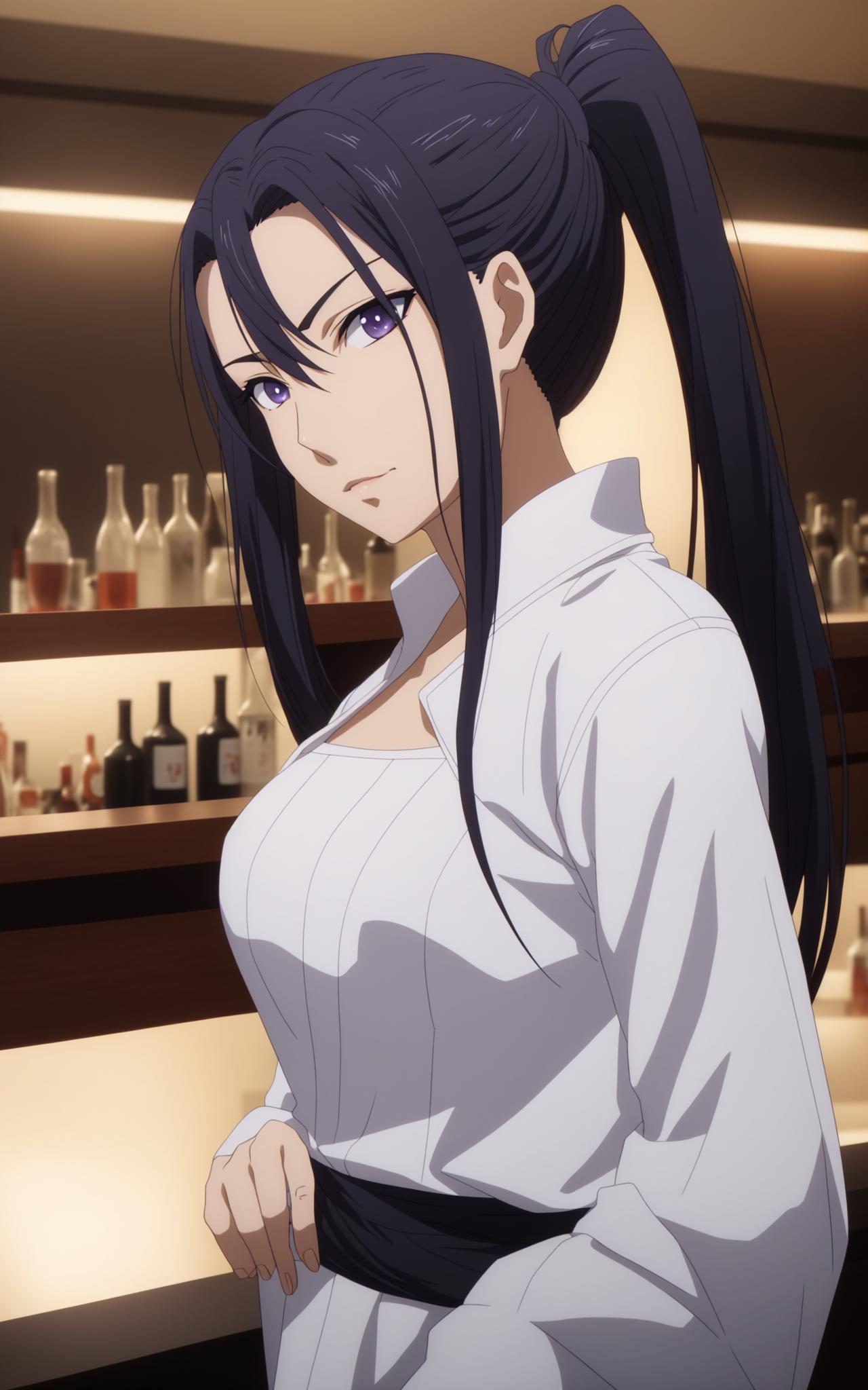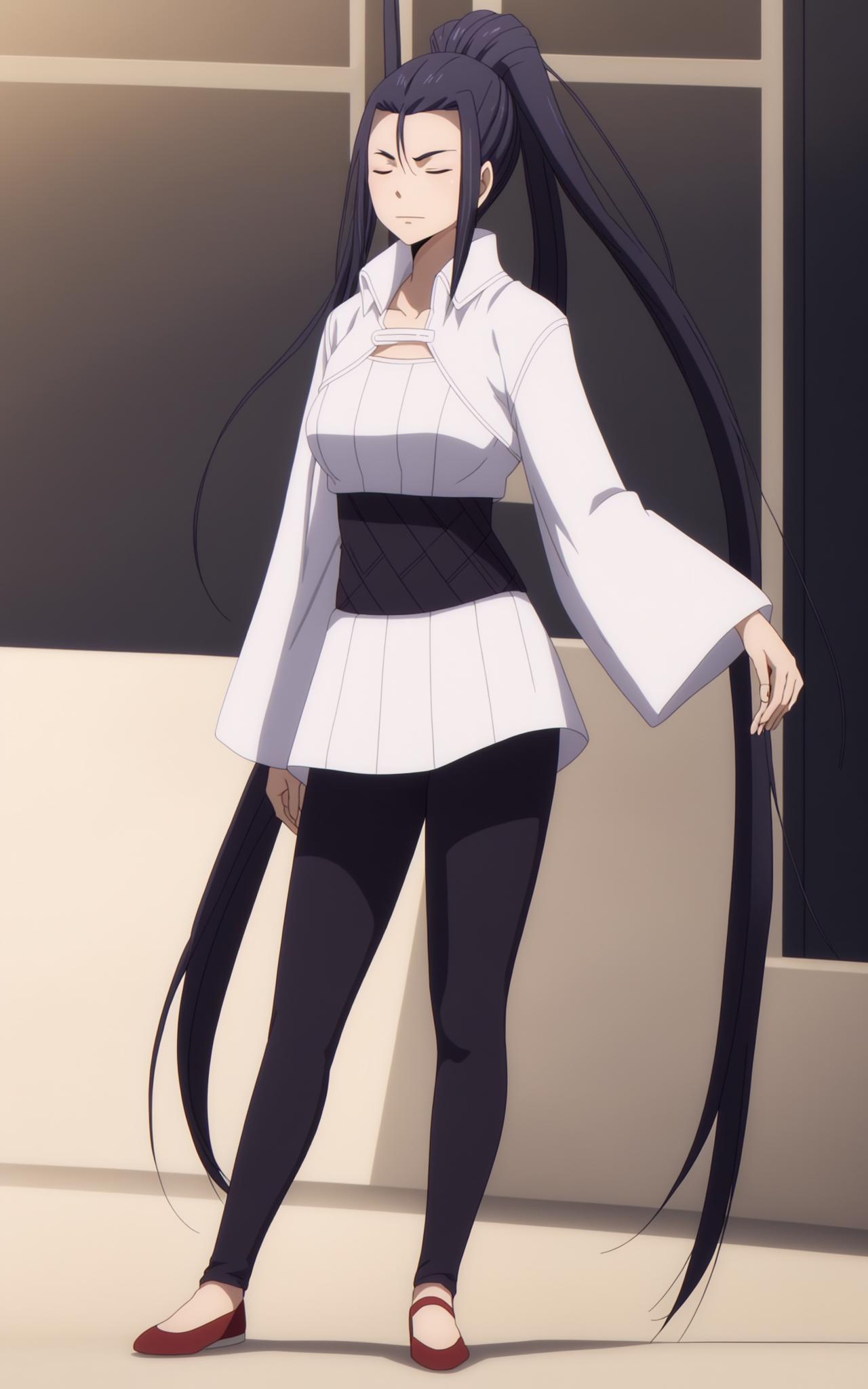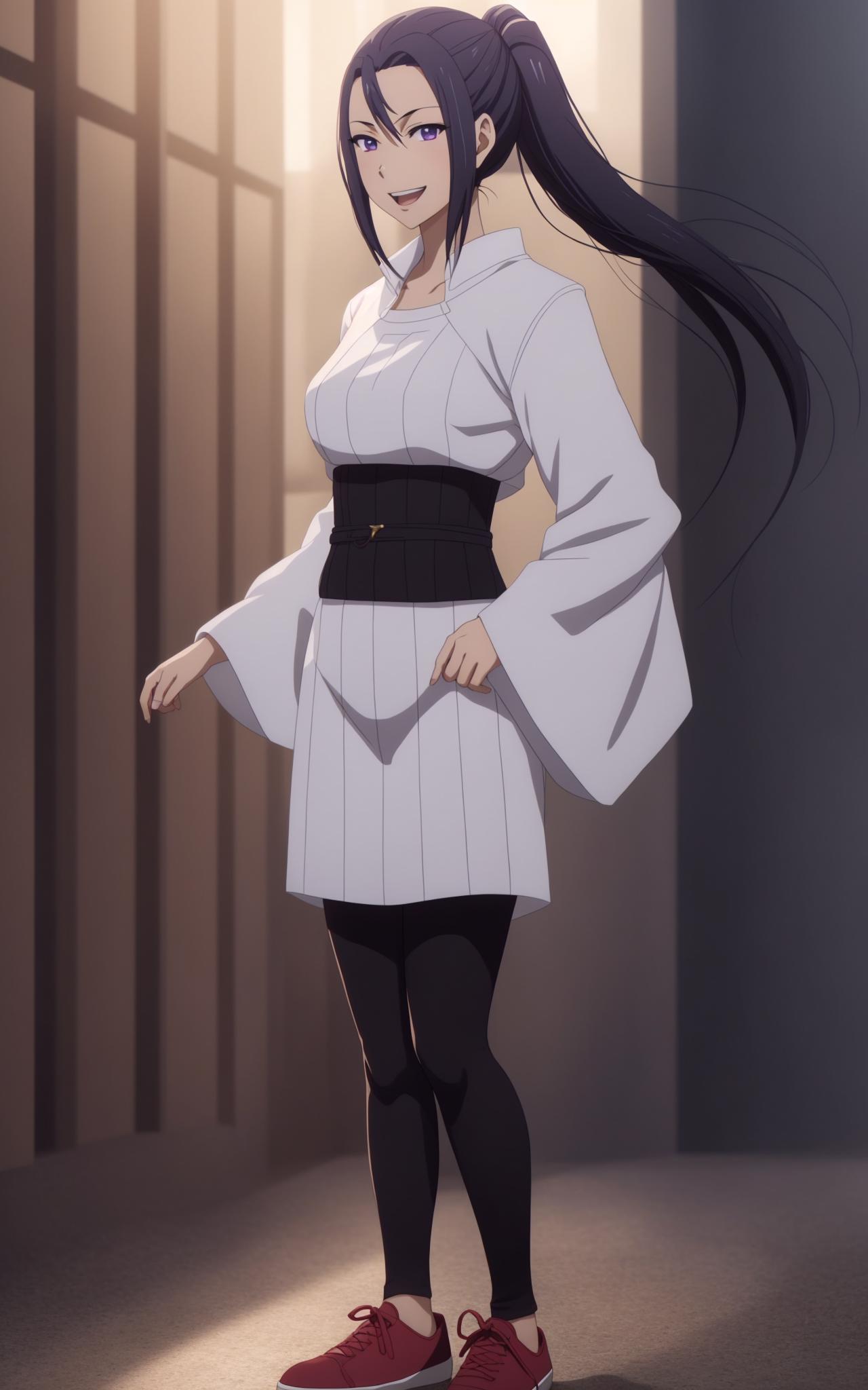 a woman with long black ponytail hair, purple eyes, three front hair strands, a white one-piece outfit, a black waistband, black tights, red shoes,