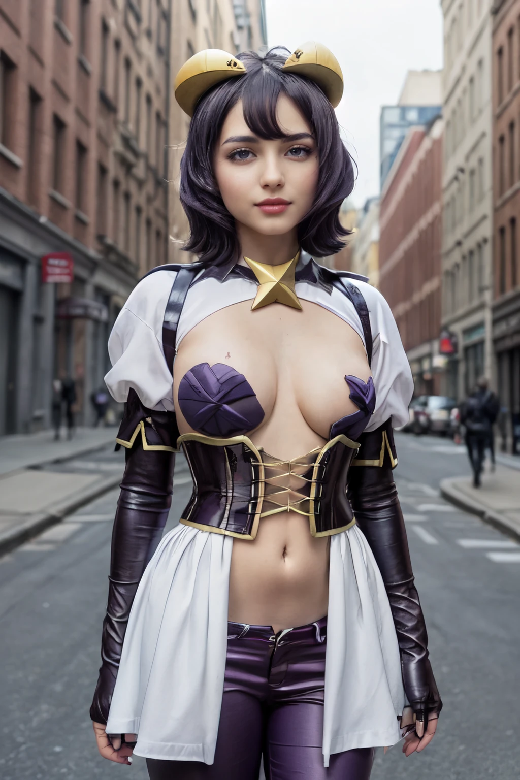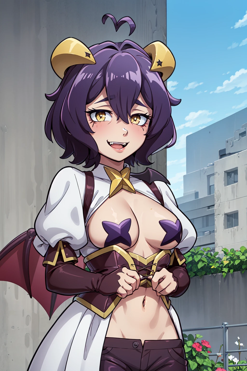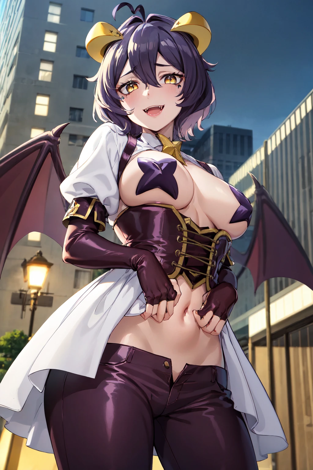 And for school uniform wear: utena2_wz,short hair, purple hair, drow, yellow eyes,+.+, hair between the eyes, demon wings, demon horns, pasties, fangs, demon girl, star pasties, puffy sleeves, purple elbow gloves, navel, purple pants, purple pants, bat wings, crop top, corset