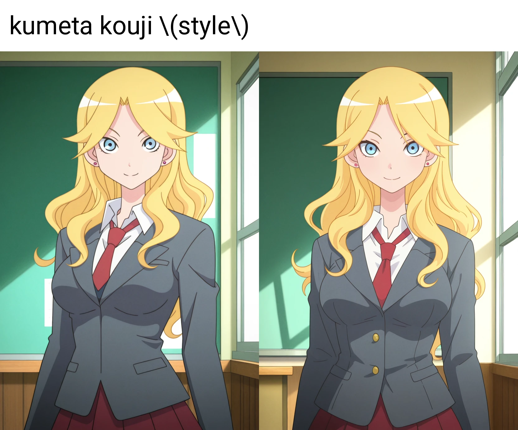 プロンプトに"kumeta kouji \(style\)"を追加する方が、再現度が高くなるようです。