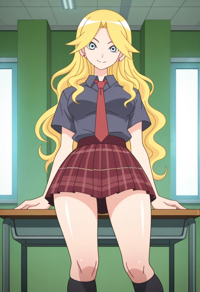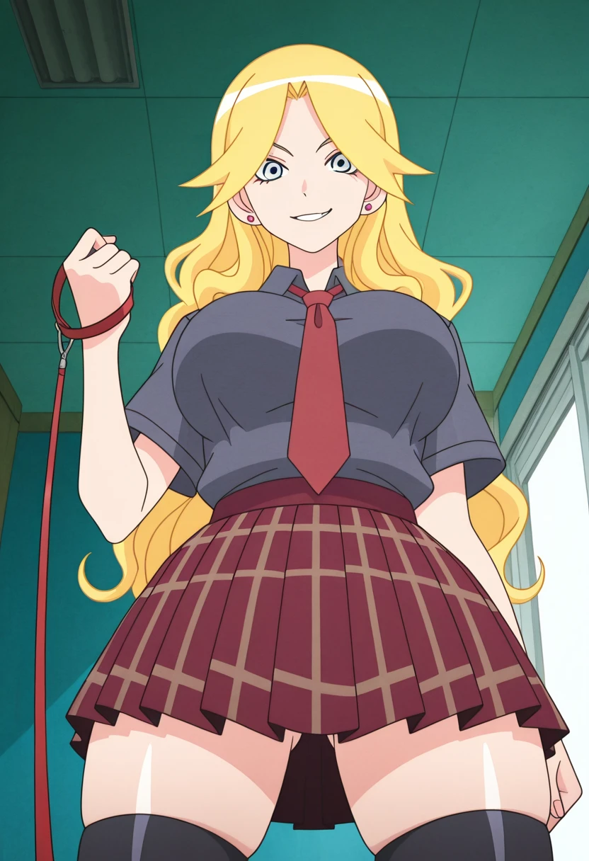 school uniform, red necktie, grey collared shirt, short sleeves, red pleated skirt, plaid skirt, black kneehighs, loafers,