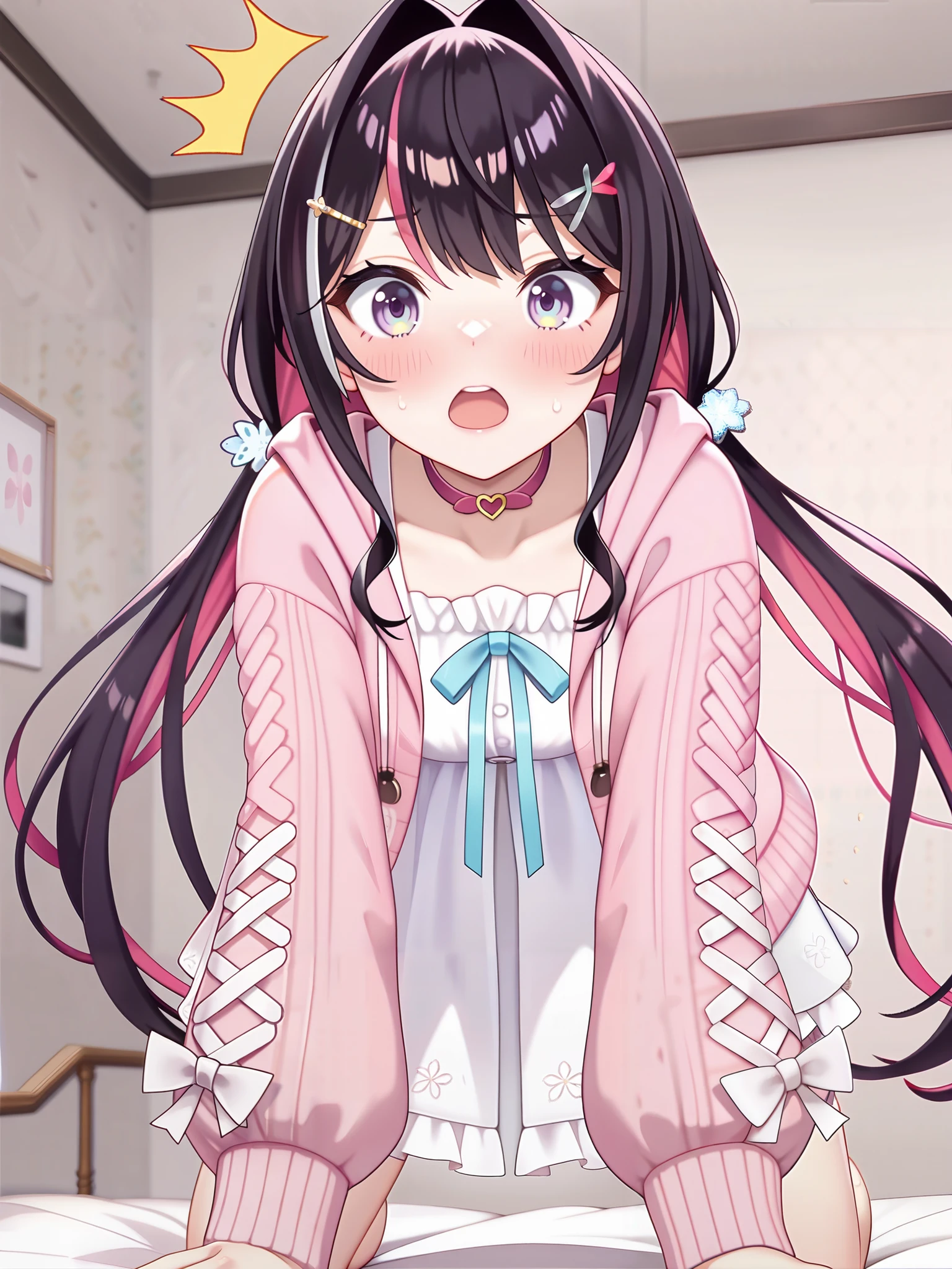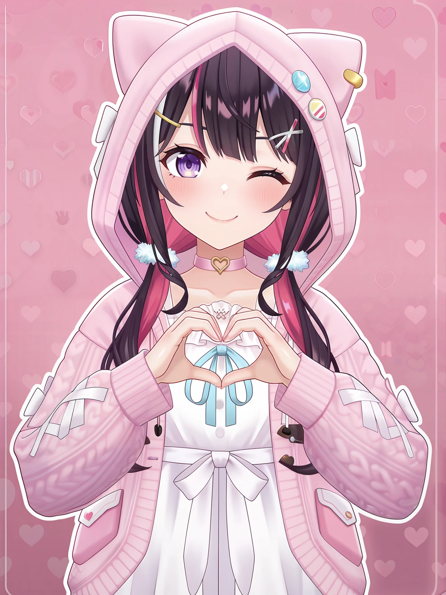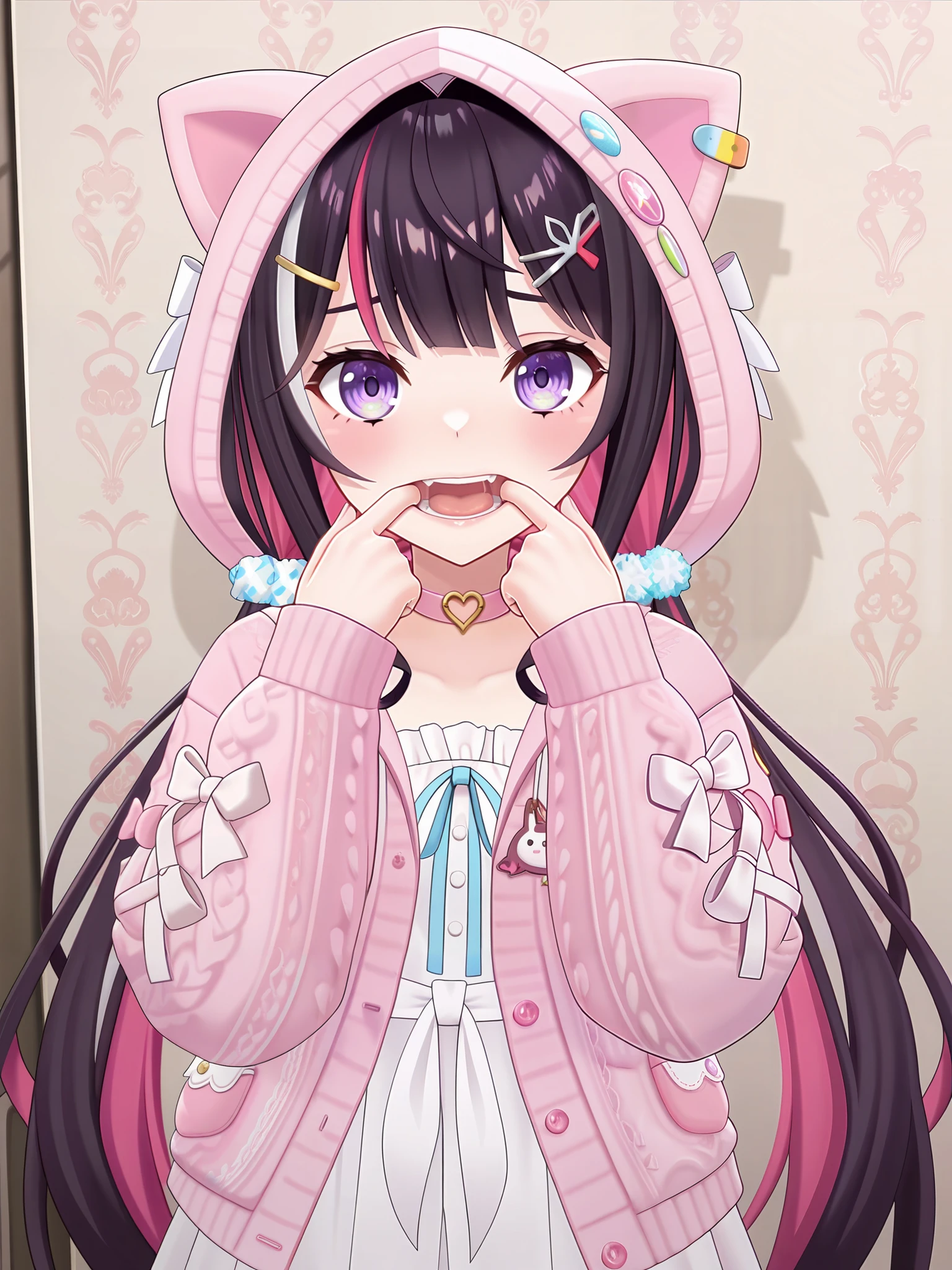 azki_yurufuwa_hood_up,azki (yurufuwa casual) (hololive),black hair,blunt bangs,colored inner hair,cowboy shot,hair intakes,hairclip,long hair,long sleeves,low twintails,multicolored hair,open jacket,pink choker,pink hair,pink jacket,purple eyes,streaked hair,white dress