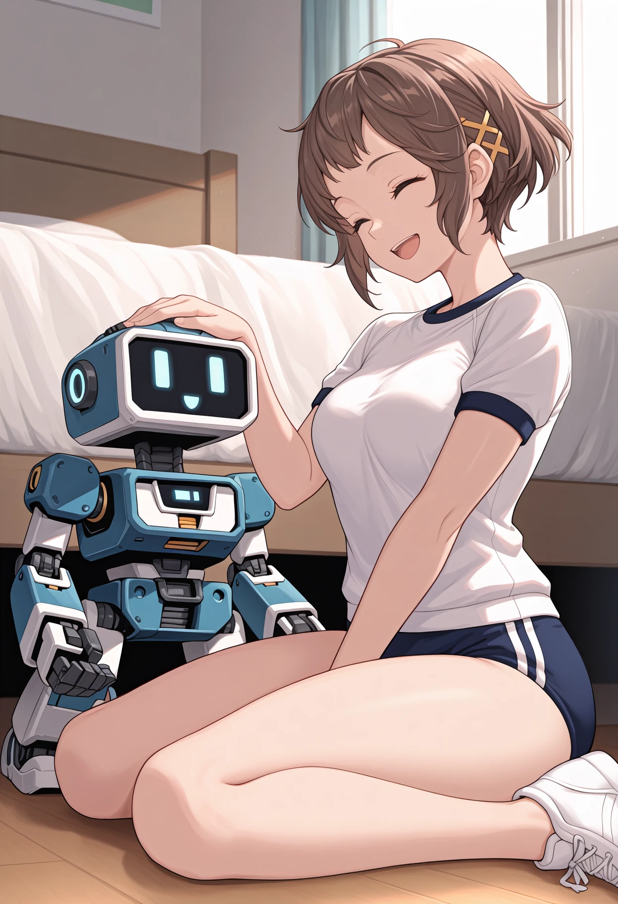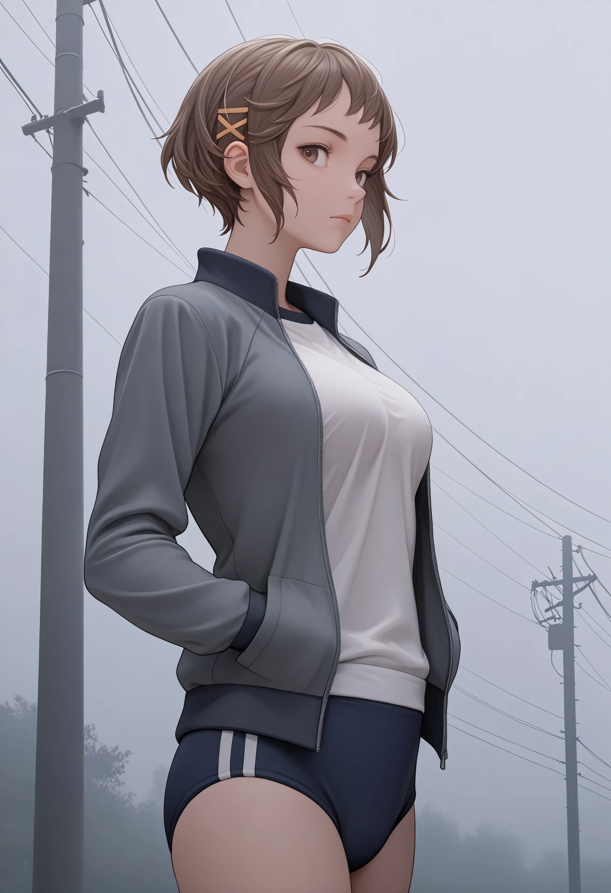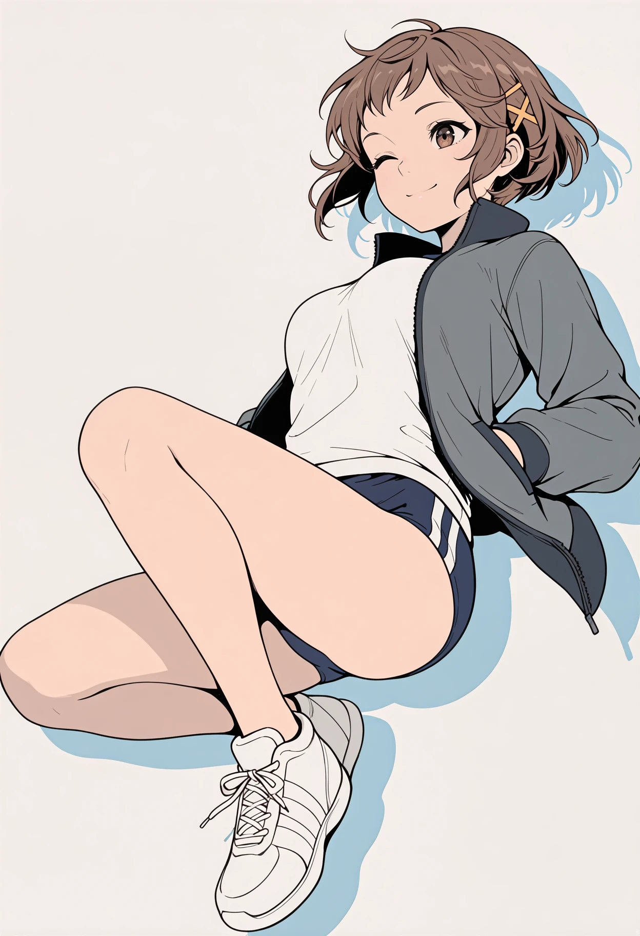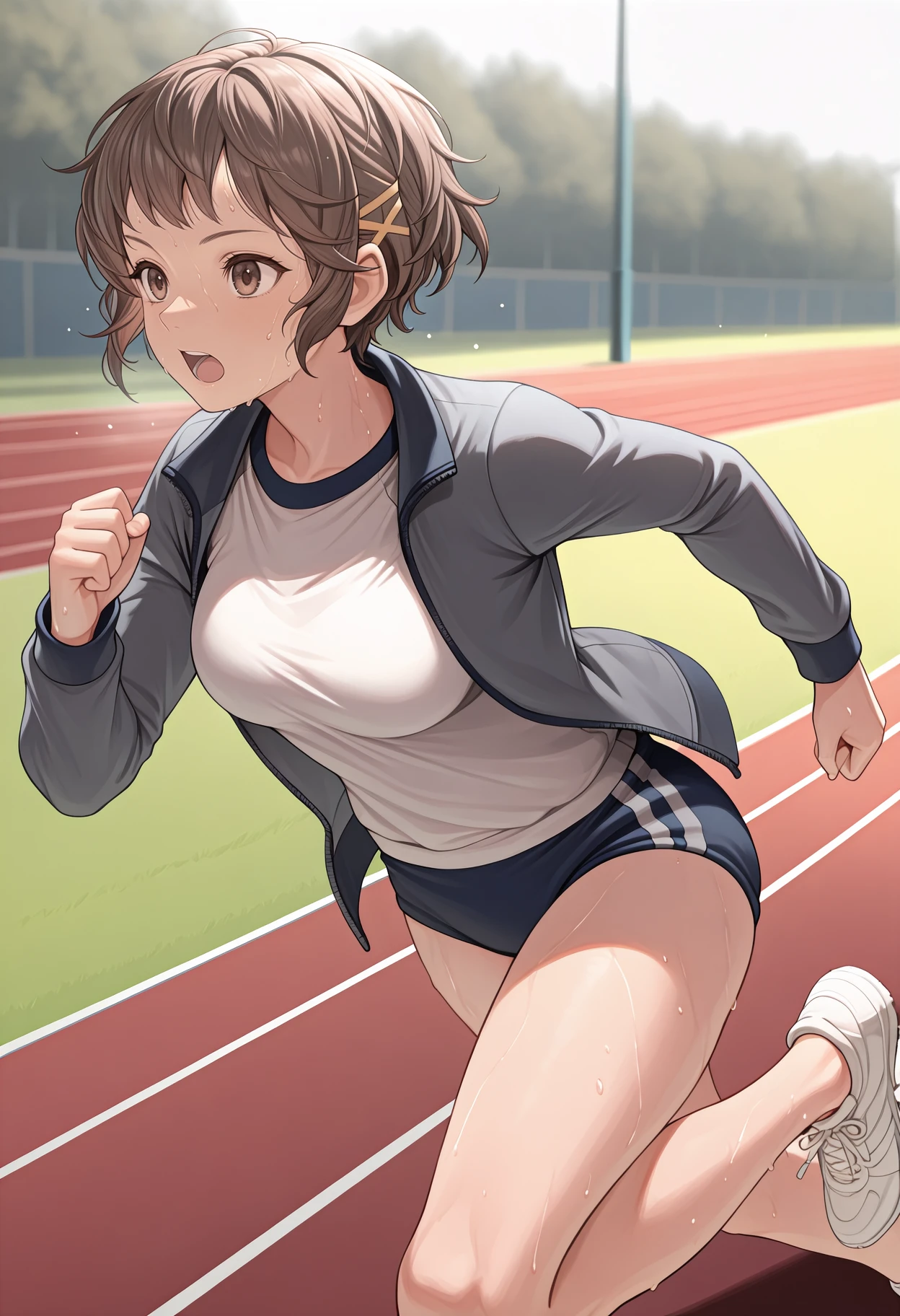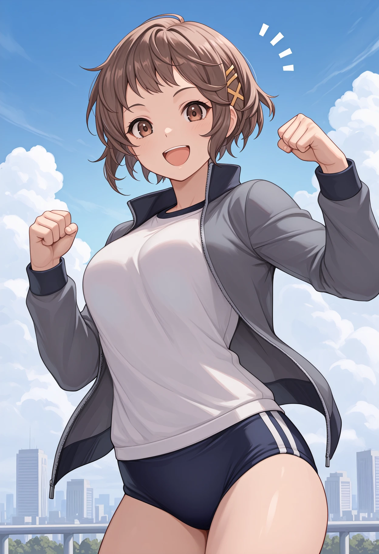 brown hair, short hair, hairclip, x hair ornament, brown eyes, white shirt, grey track jacket, open jacket, long sleeves, blue buruma, white sneakers