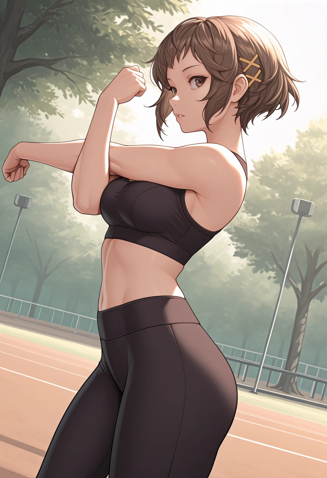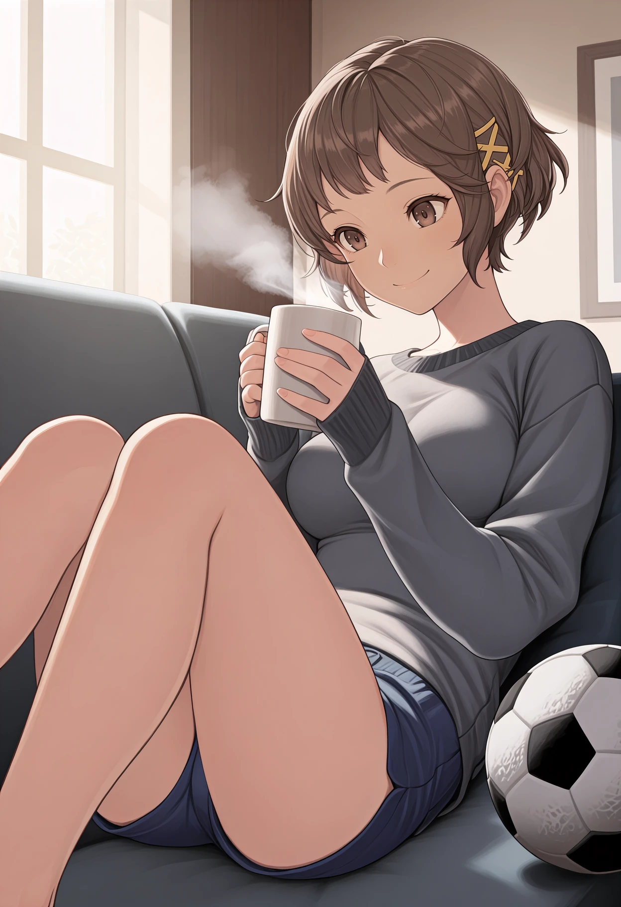 brown hair, short hair, hairclip, x hair ornament, brown eyes