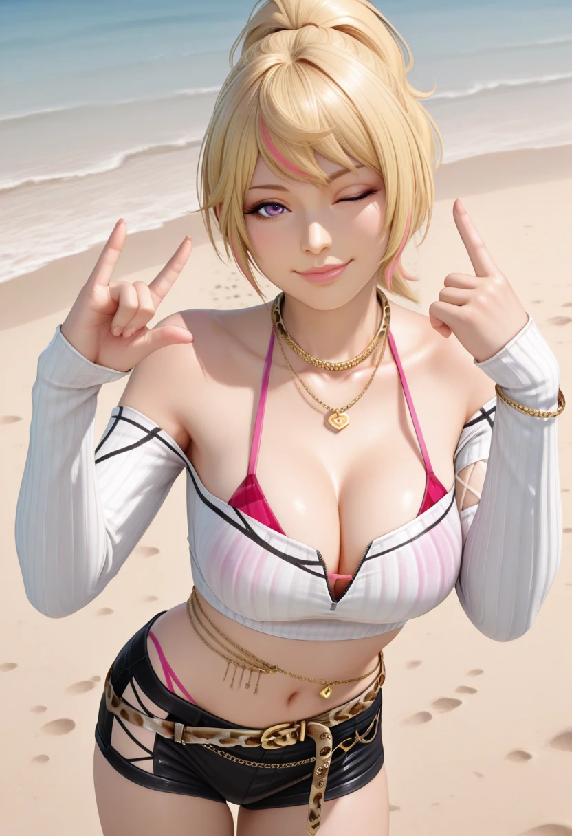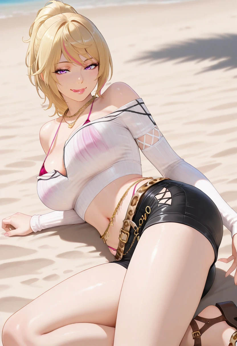 YUK1N0DOAXVV, blonde hair, pink streaks,streaked hair, ponytail, hair between eyes, purple eyes, lips, gold necklaces, white strapless crop top, straps, long sleeves, sleeve cutout, navel, belly chain,leopard print belt, black shorts, side cutout