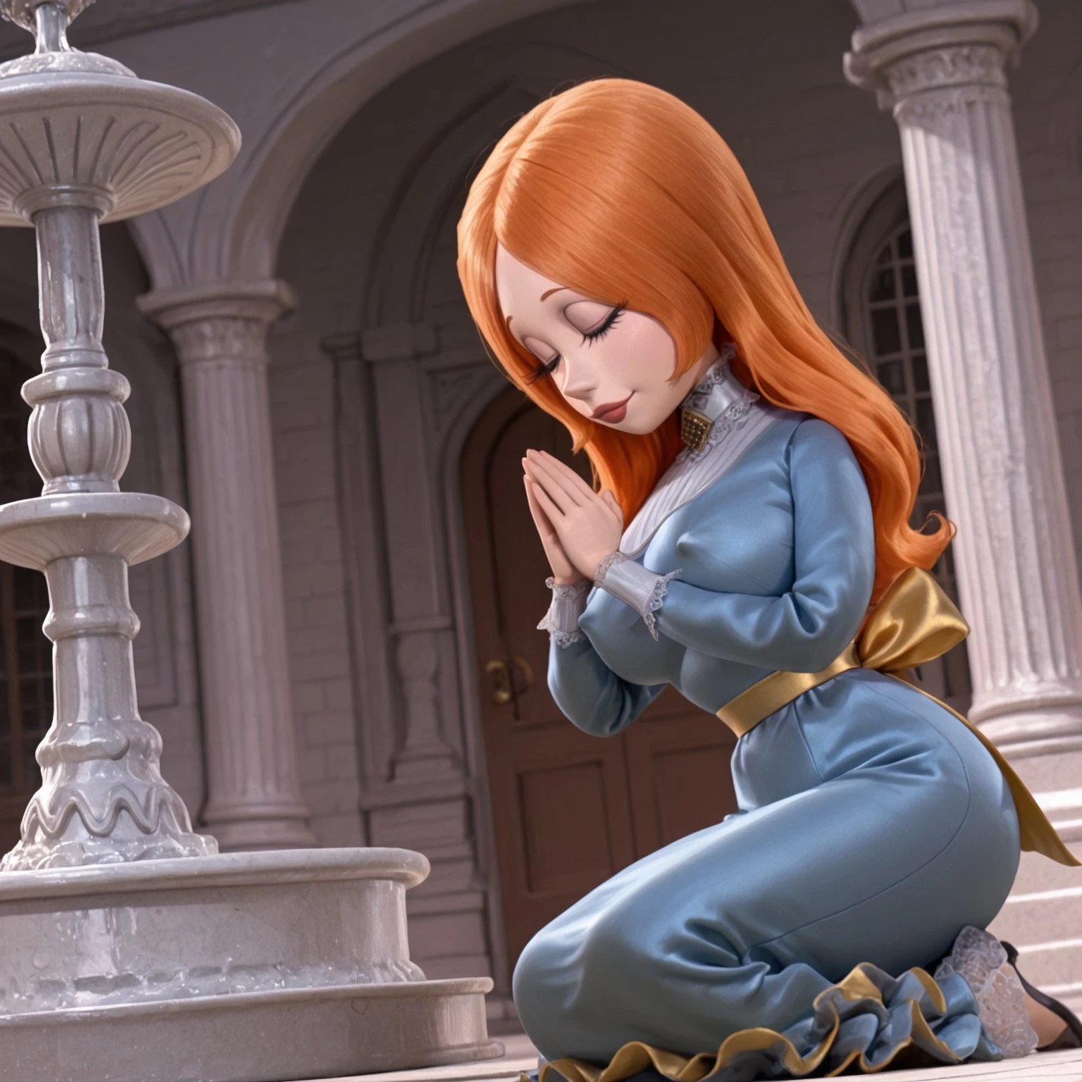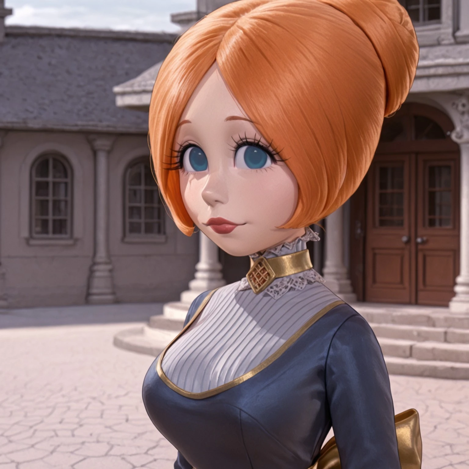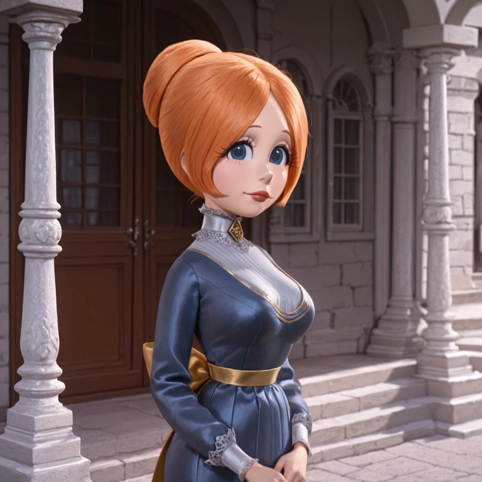 jessicaclausscictt, mature cartoon female, blue eyes without pupils, short orange hair with upper hair bun, thick red lips, blue and white dress, gold satin waist ribbon