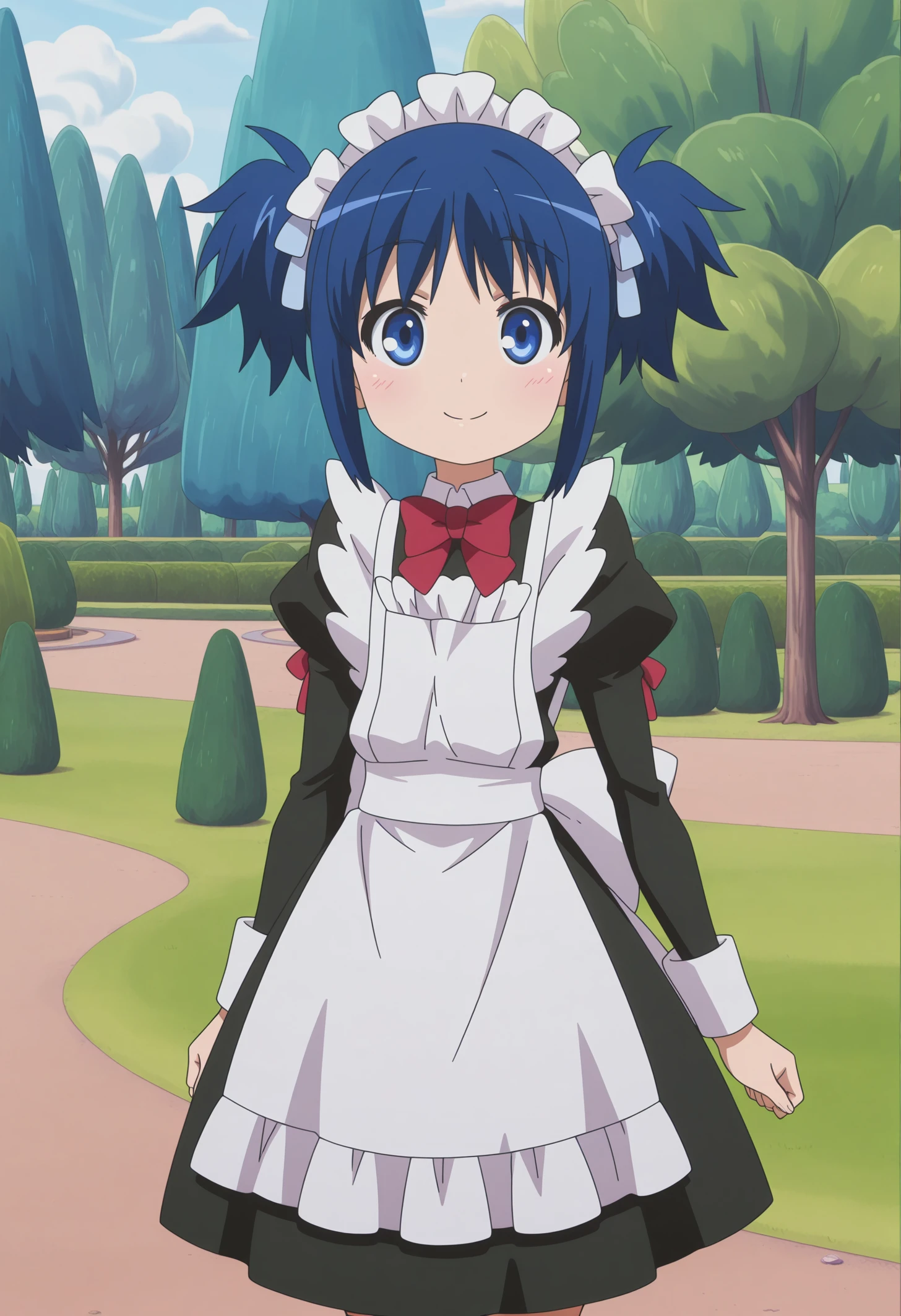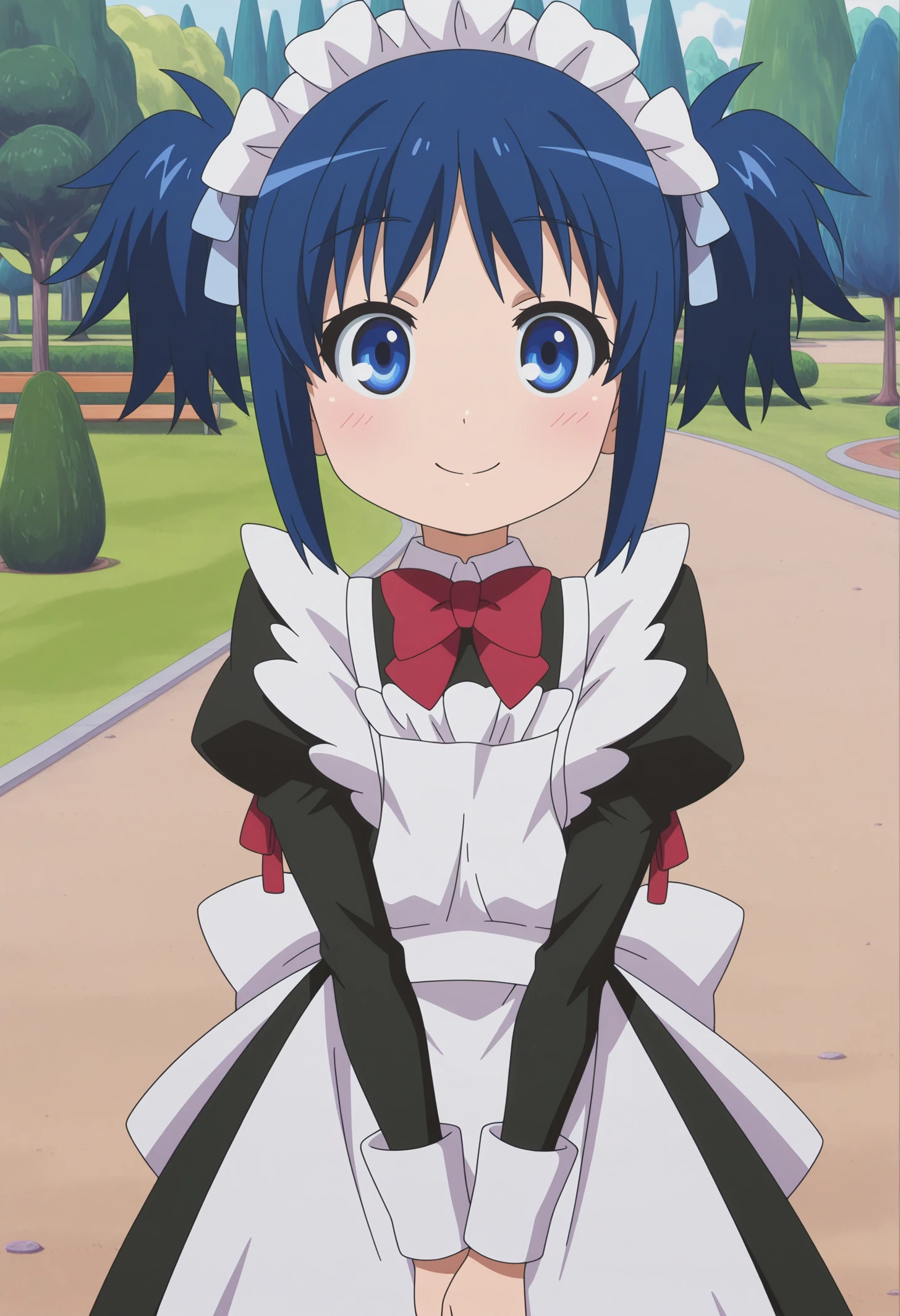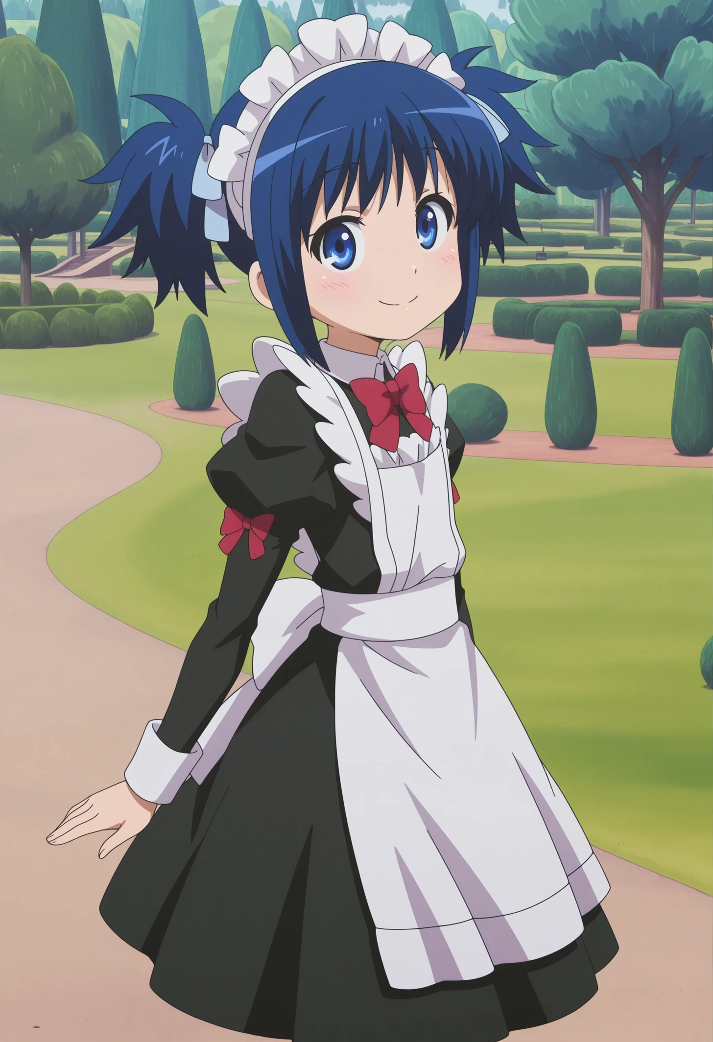red bowtie, hair ribbon, short twintails, maid apron, maid, maid headdress,